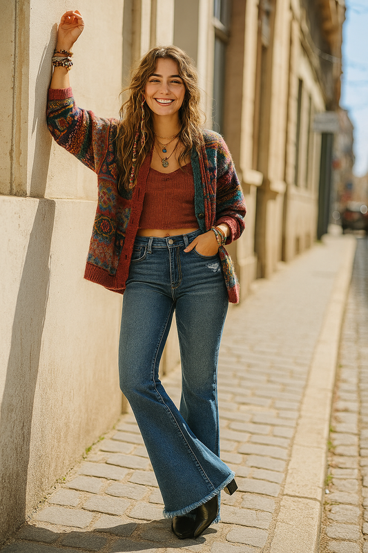 RISEN High-Rise Slim Fit 70s Flare Pants Distressed Frayed Raw Hem Denim Jeans