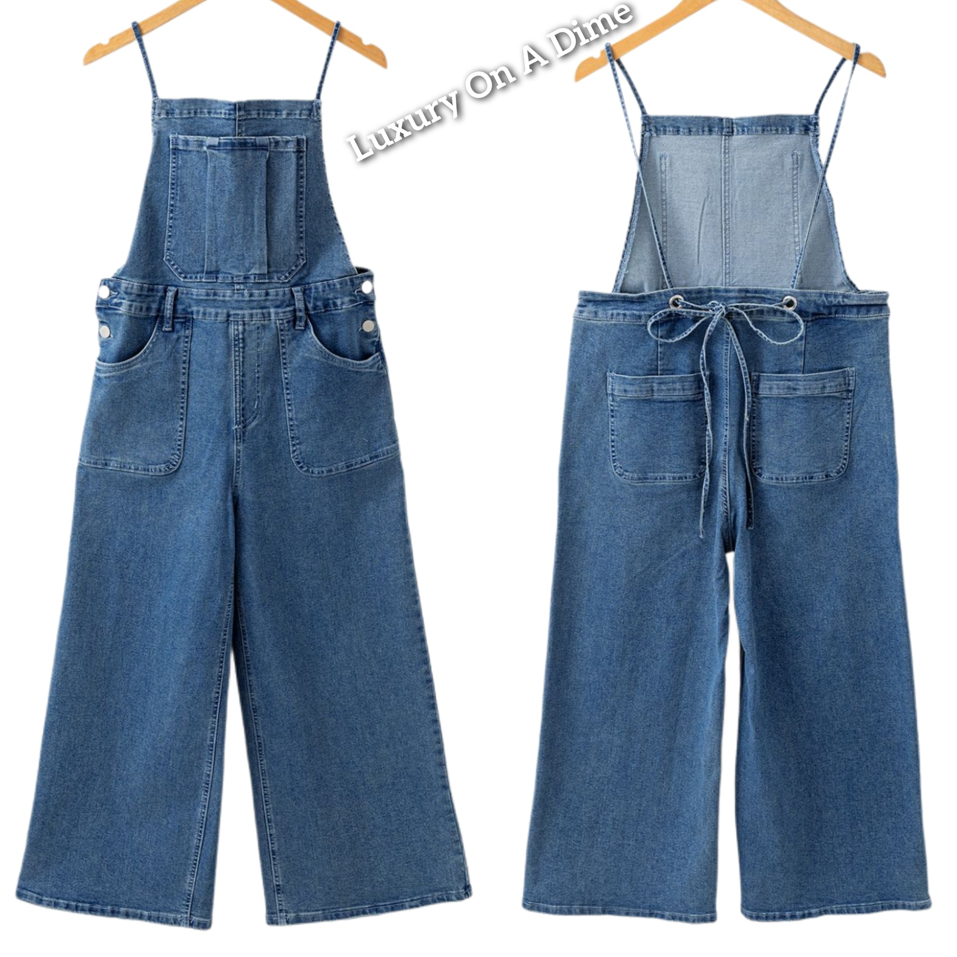 Retro Patch Pocket Denim Wide Leg Sleeveless Open Back Jean Pant Overalls