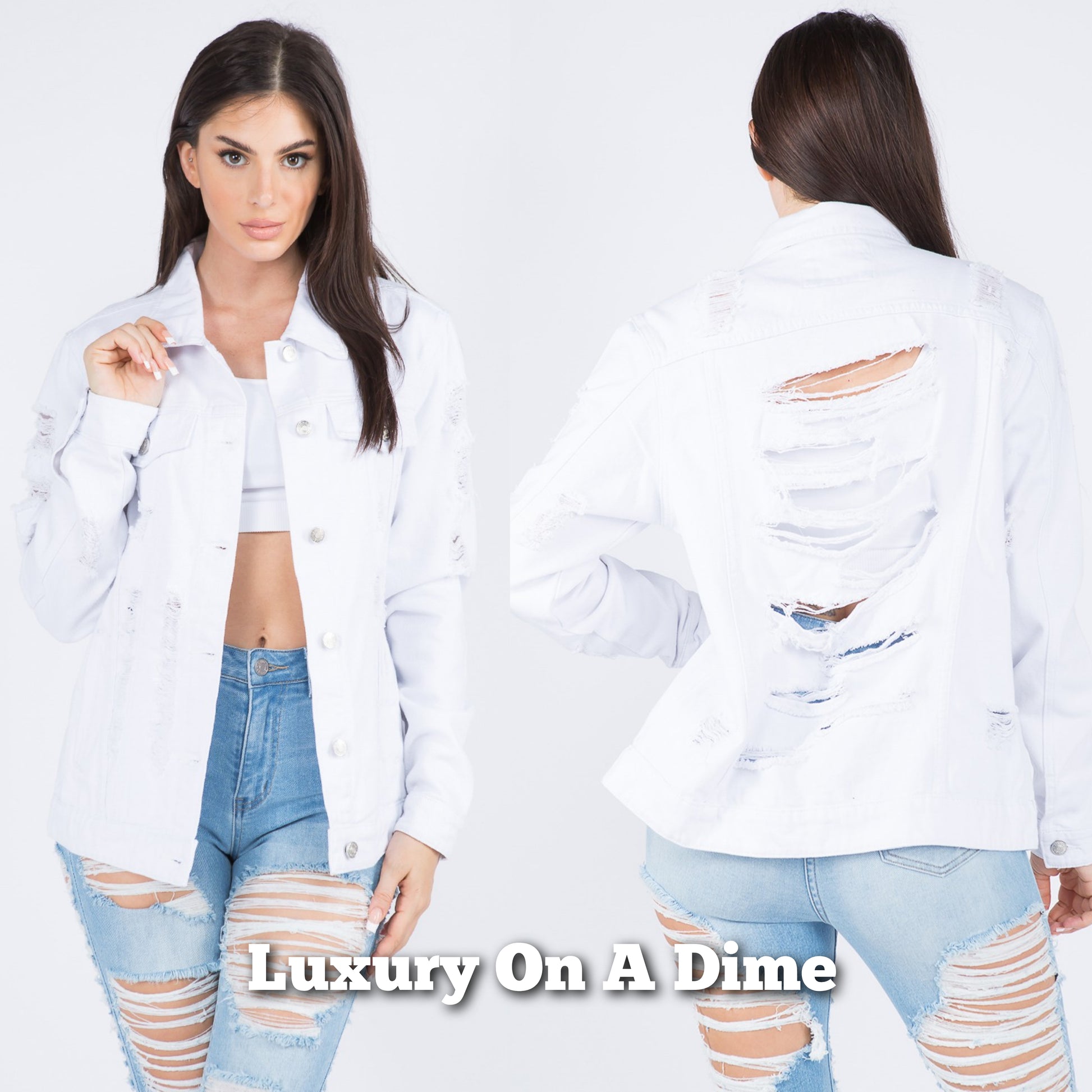 American Bazi Torn Distressed Hole Cotton Denim Button-Up White Jean Jacket