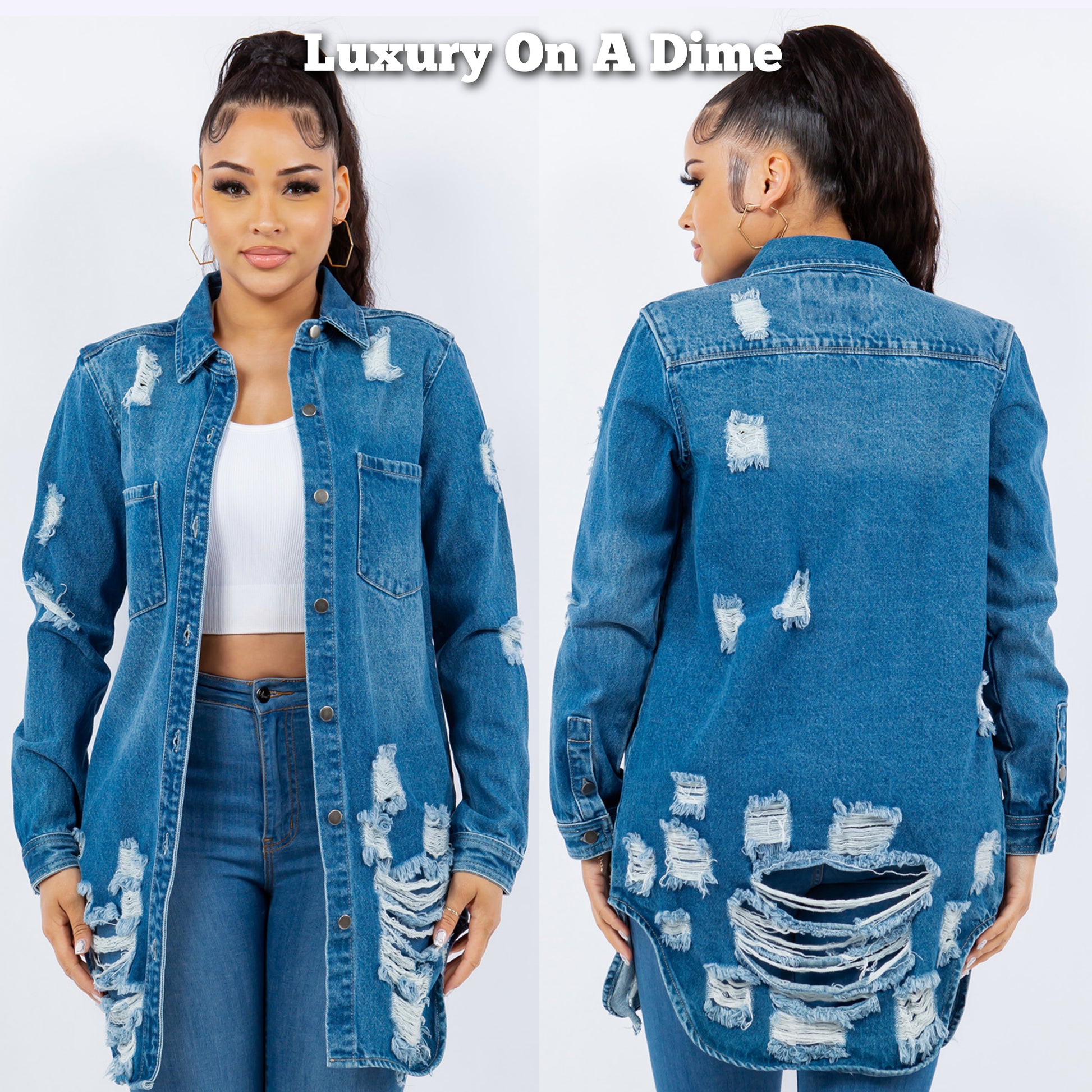 American Bazi Torn Distressed Hole Oversized Shacket Cotton Denim Jean Jacket