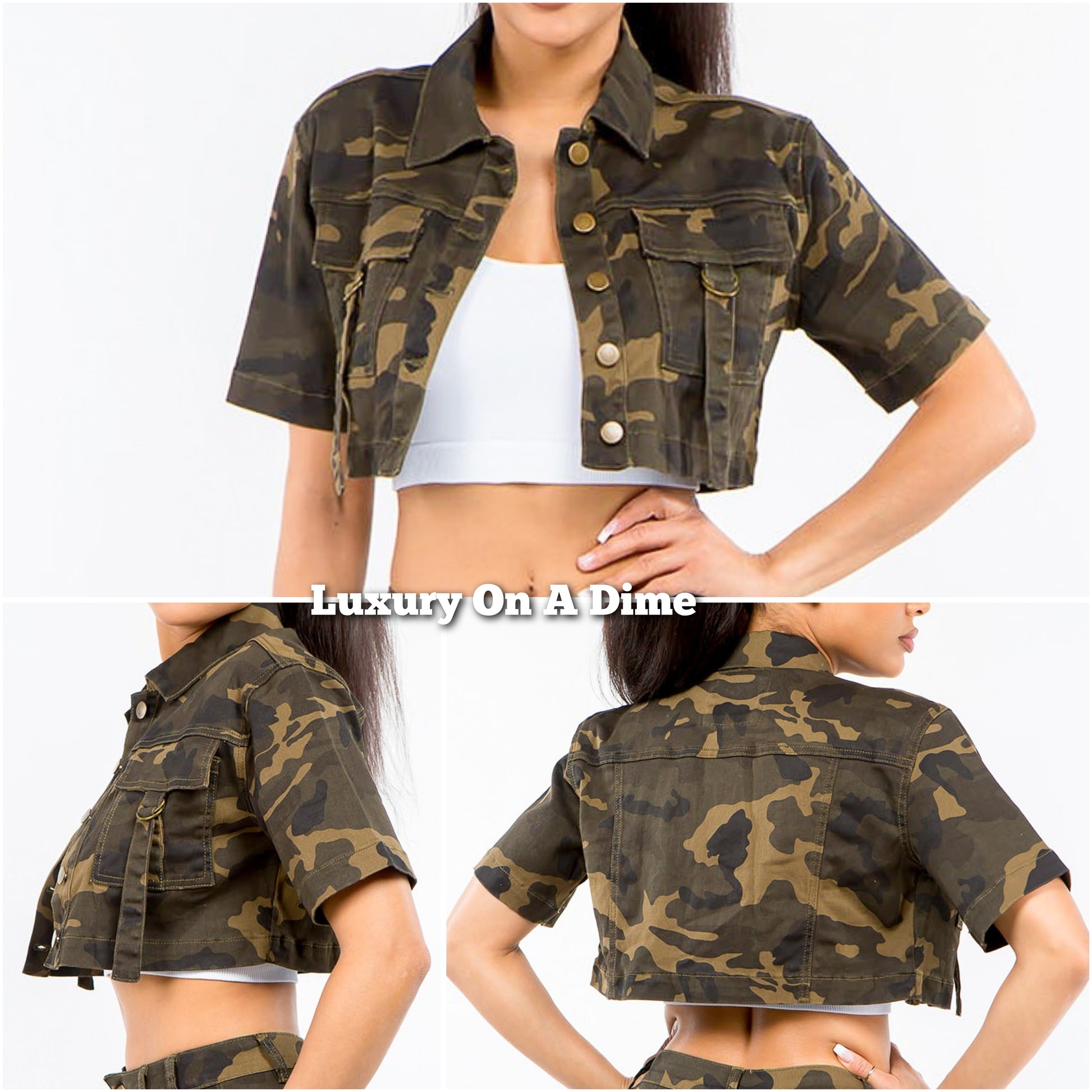 American Bazi Cropped Combat Camo Denim Short Sleeve Button Jean Jacket