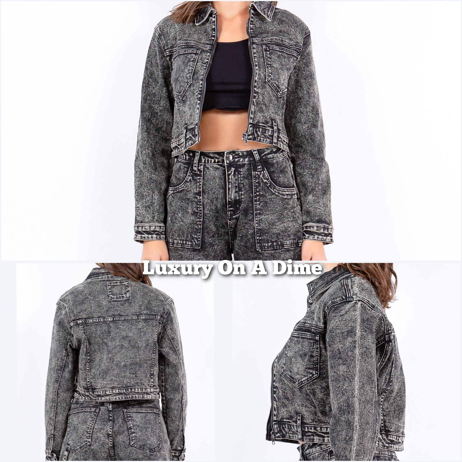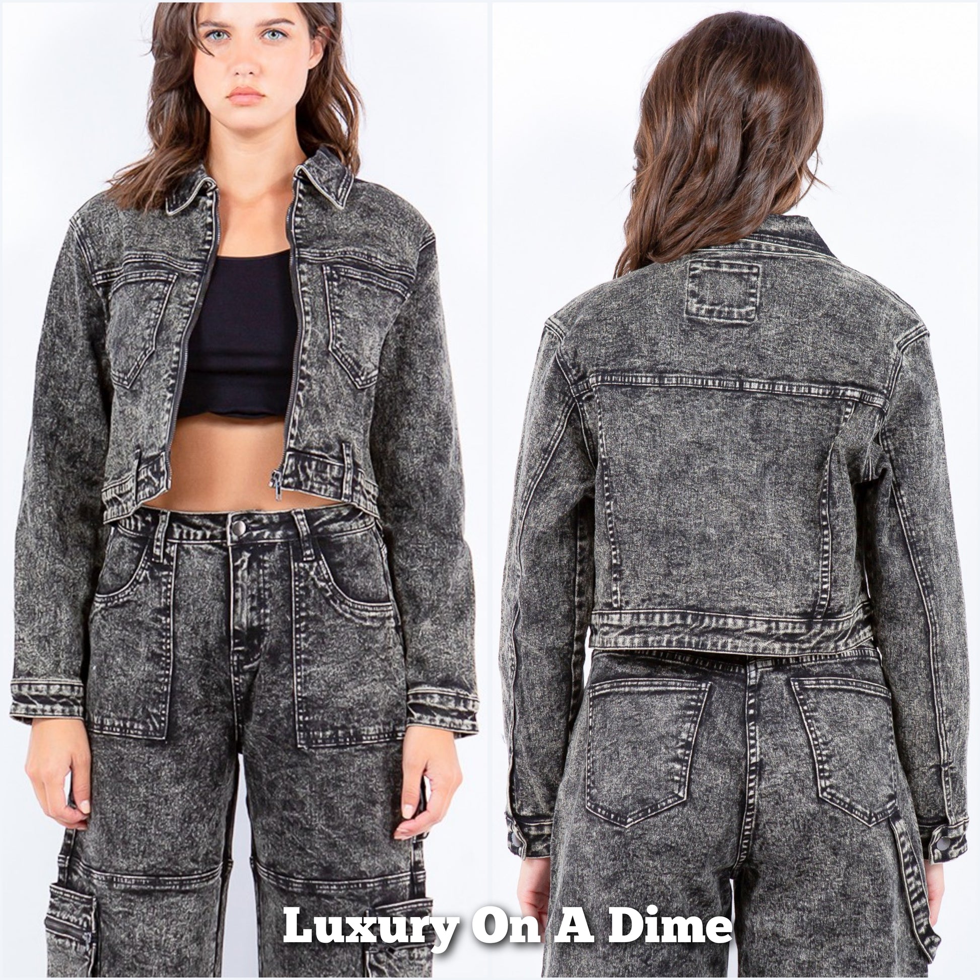 American Bazi 90s Retro Cropped Denim Zipper Acid Wash Bleached Jean Jacket