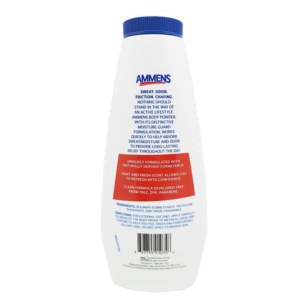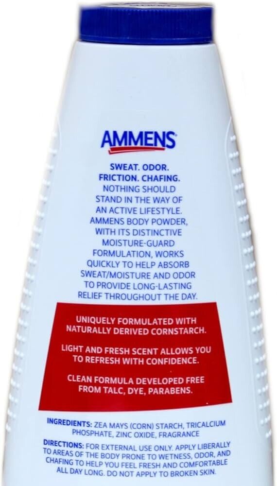 Ammens Original Medicated Powder is formulated with a blend of zinc oxide and naturally derived corn starch. This combination helps to soothe skin while absorbing excess moisture, providing all-day dryness and a silky-smooth feel. Trusted for over 100 years, Ammens offers a strong, reliable solution for skin care.Ammens Powder is designed to absorb with the distinctive miosture-guard formulation, refresh, soothe and control odor.