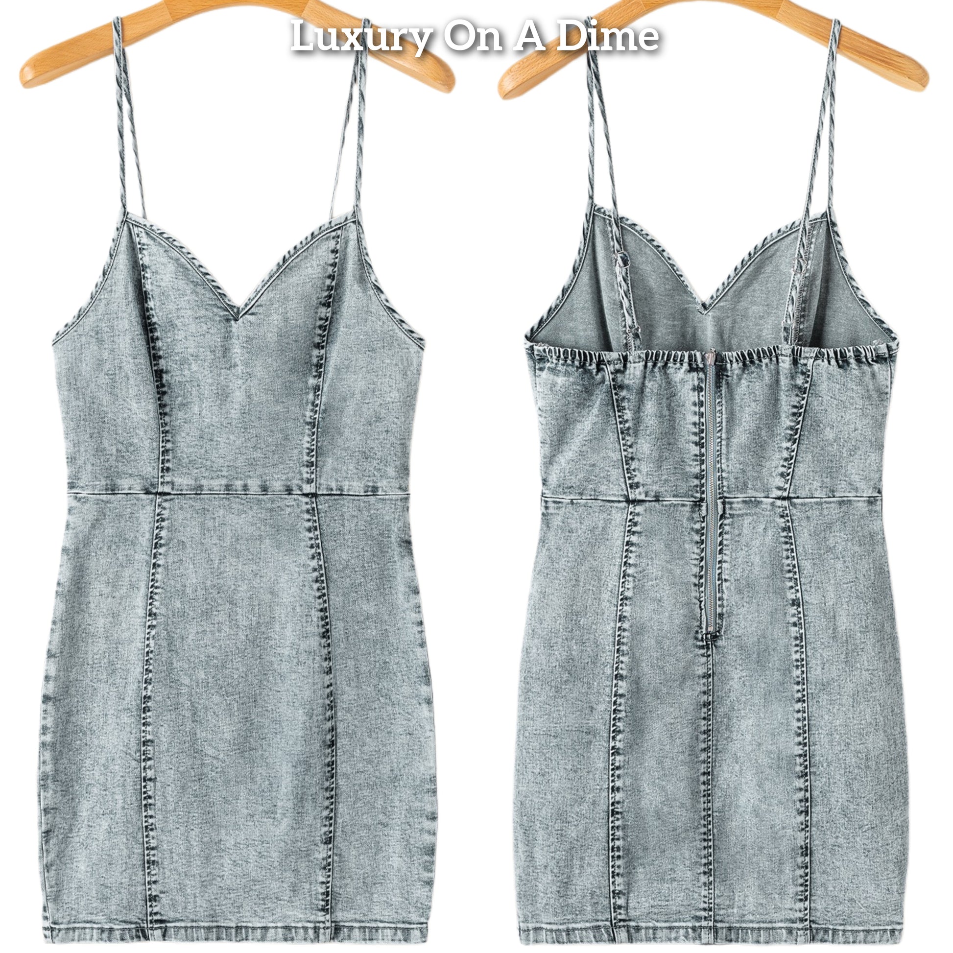 Retro Blue Jean Dress Sweetheart Neck Spaghetti Strap Pencil Classic Denim Mini