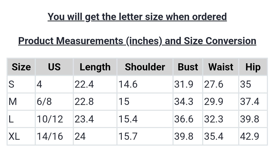 | Size | US | Length | Shoulder | Bust | Waist | Hip |
