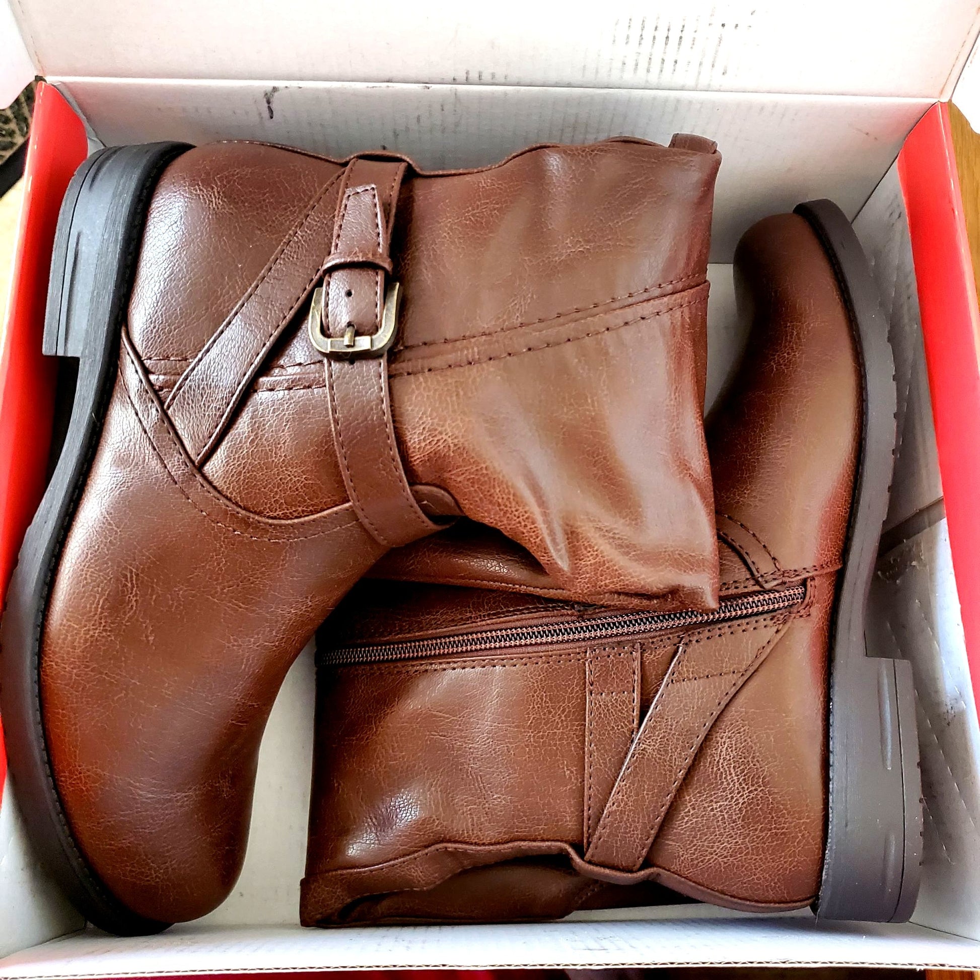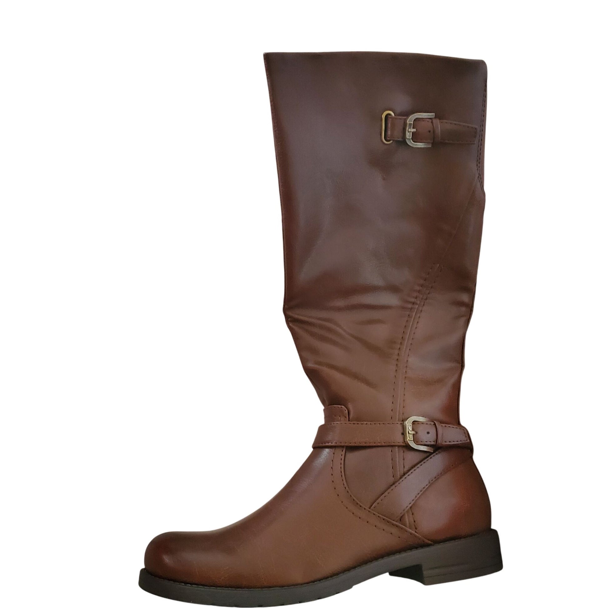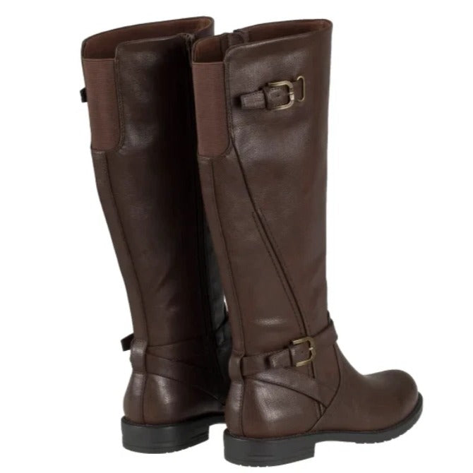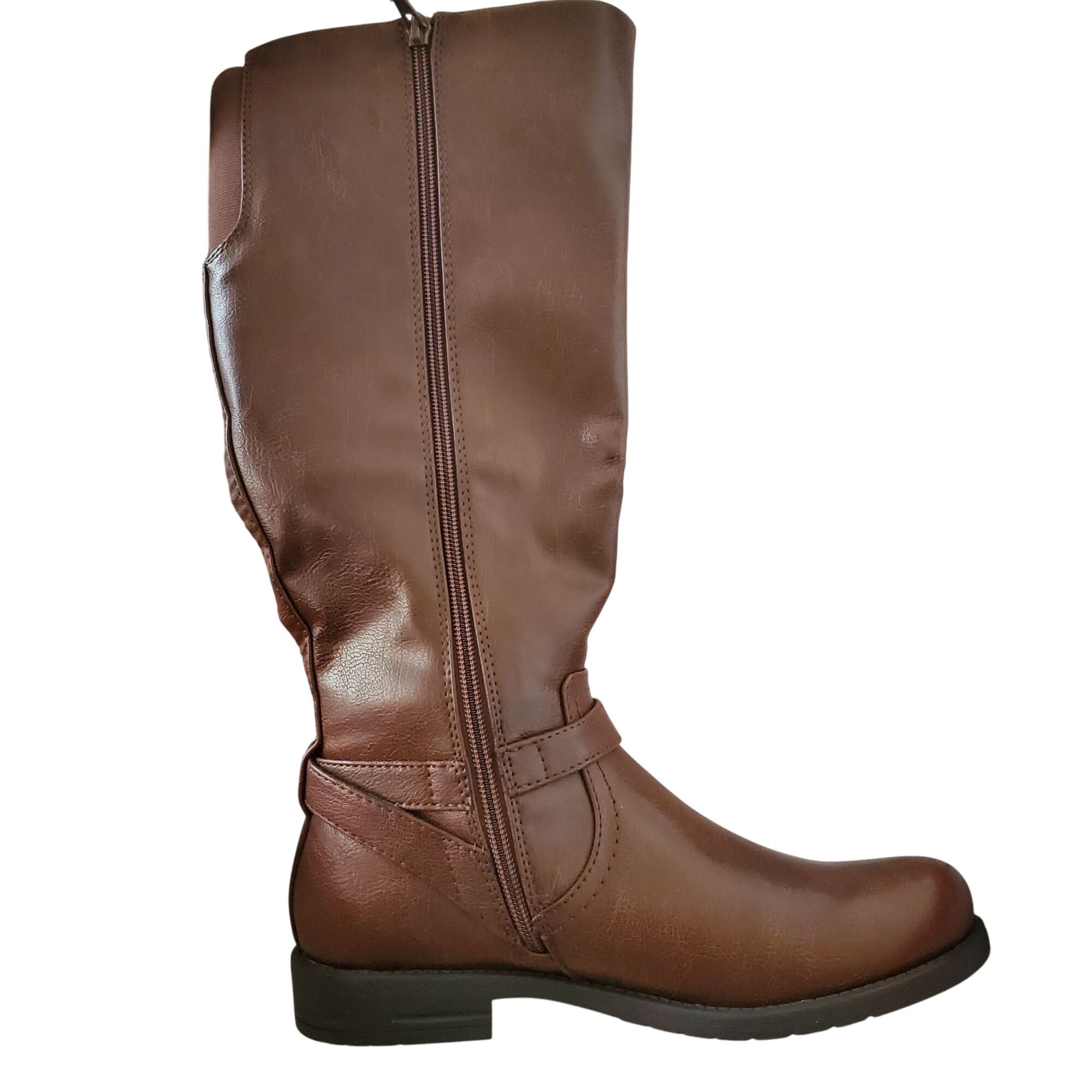 A timeless staple reimagined with comfort in mind, these knee-high riding boots offer an equestrian-inspired silhouette with everyday wearability. Crafted from smooth vegan faux leather, the design features a rounded toe and 1-inch low block heel for a sleek, grounded profile. Dual buckle accents add classic detail, while the elastic gore at the topline ensures a flexible, contoured fit. An inside zipper makes slipping in and out simple, and the cushioned insole supports day-to-night movement. With a durable, flexible outsole and versatile styling, these boots suit everything from weekend denim to elevated fall layers. Perfect for equestriancore, quiet luxury, classic chic, and clean girl aesthetics.