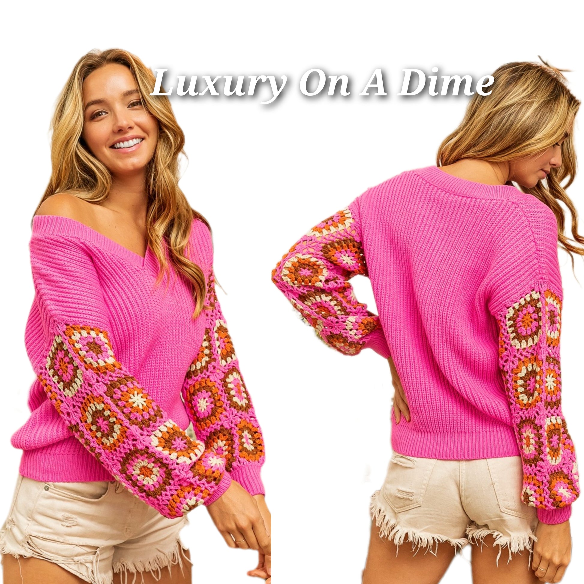 BiBi Crochet Granny Square Top Pullover Ribbed Knit Long Sleeve V-neck Shirt