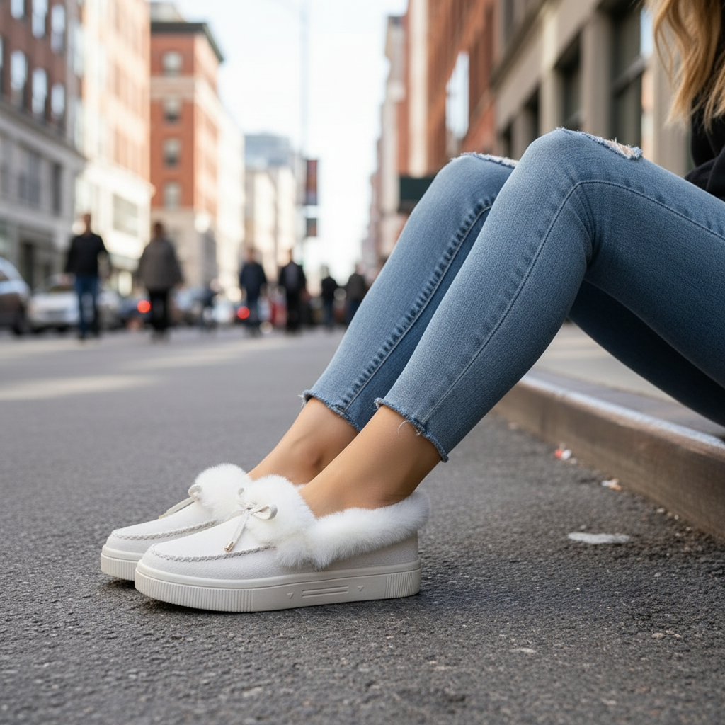 Soft, playful, and designed for everyday comfort, these plush faux fur loafers bring together cozy texture and effortless style in a slip-on silhouette that feels as good as it looks. Crafted from smooth faux suede with a fluffy faux fur lining and collar, they deliver instant warmth and a cushioned feel that makes them ideal for cooler seasons and relaxed lifestyles. The classic moccasin-inspired stitching adds a timeless touch, while the delicate bow detail on the vamp introduces a charming, feminine accent that elevates the overall look. A flat rubber sole provides stable support for all-day wear, whether you are lounging indoors, running casual errands, or styling them as cozy statement shoes. Available in both neutral tones and playful colorways, these loafers balance comfort with personality, making them a versatile addition to cozy wardrobes, soft girl aesthetics, and winter-ready casual outfits. Designed to blend warmth, softness, and easy wearability, they offer a polished yet relaxed option for modern comfort dressing.