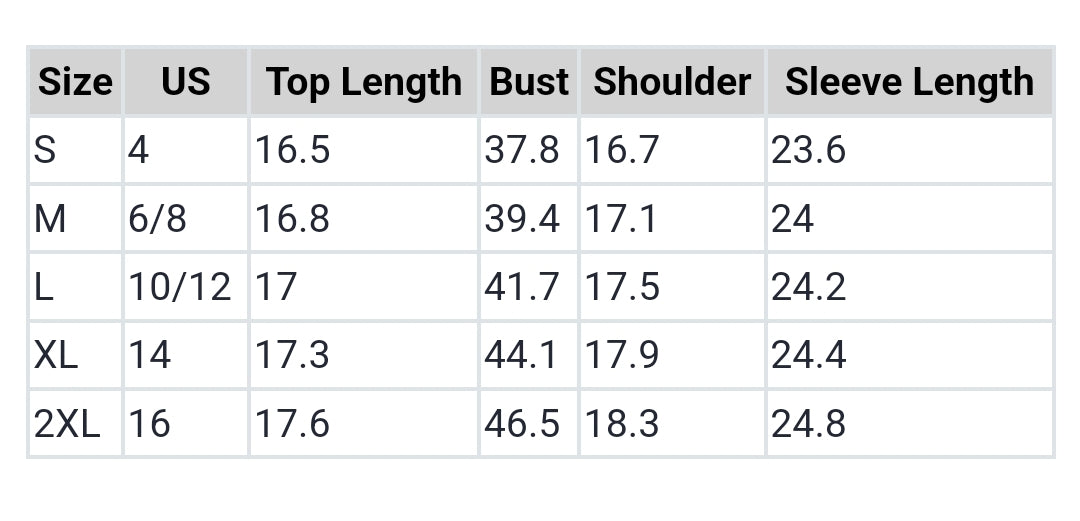 | Size | US | Top Length | Bust | Shoulder | Sleeve Length |