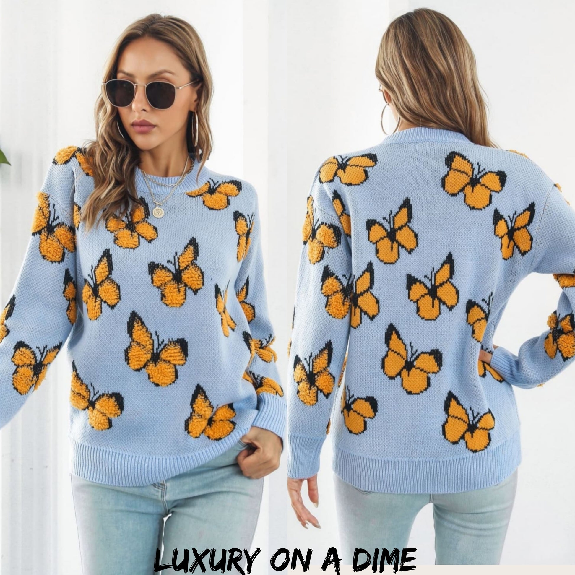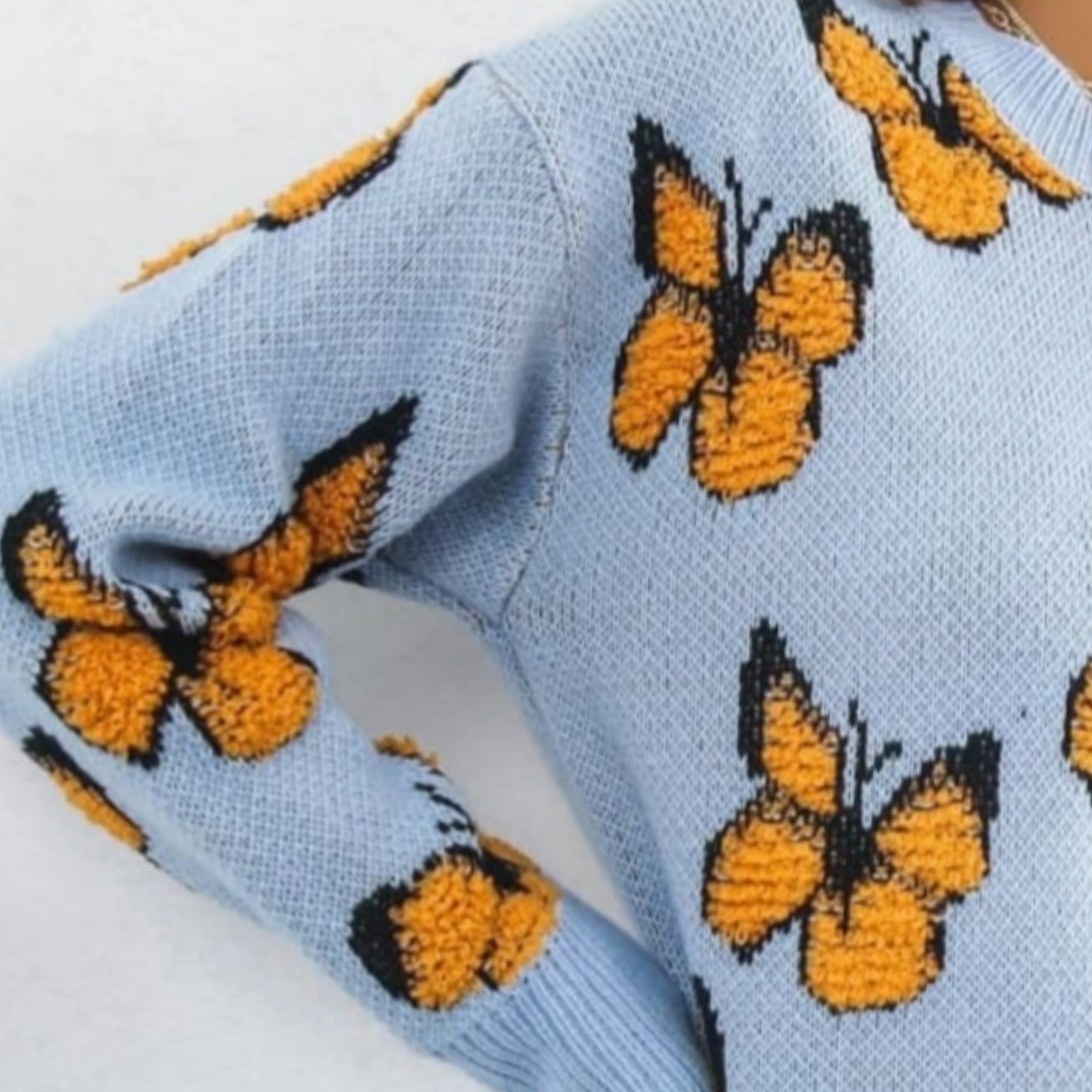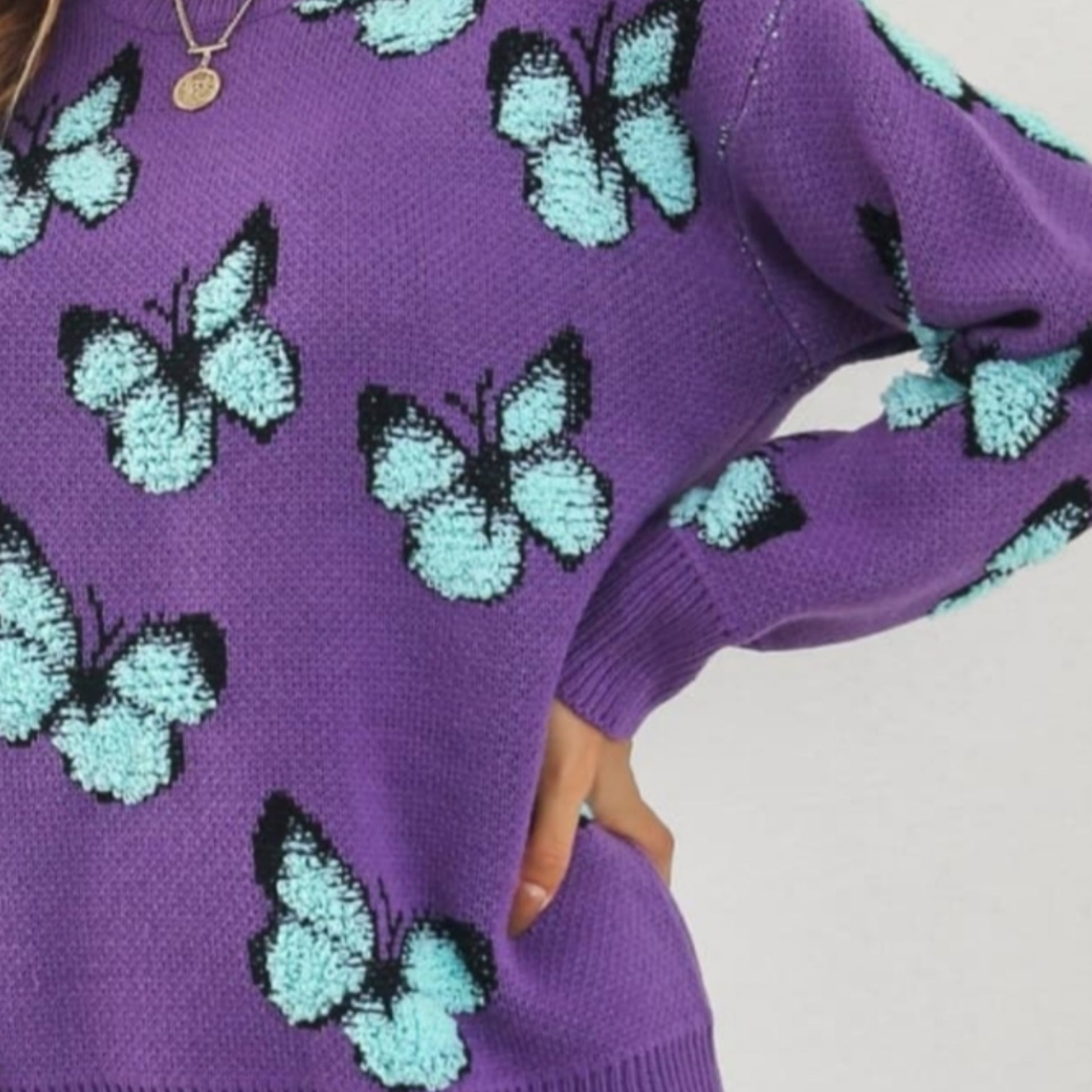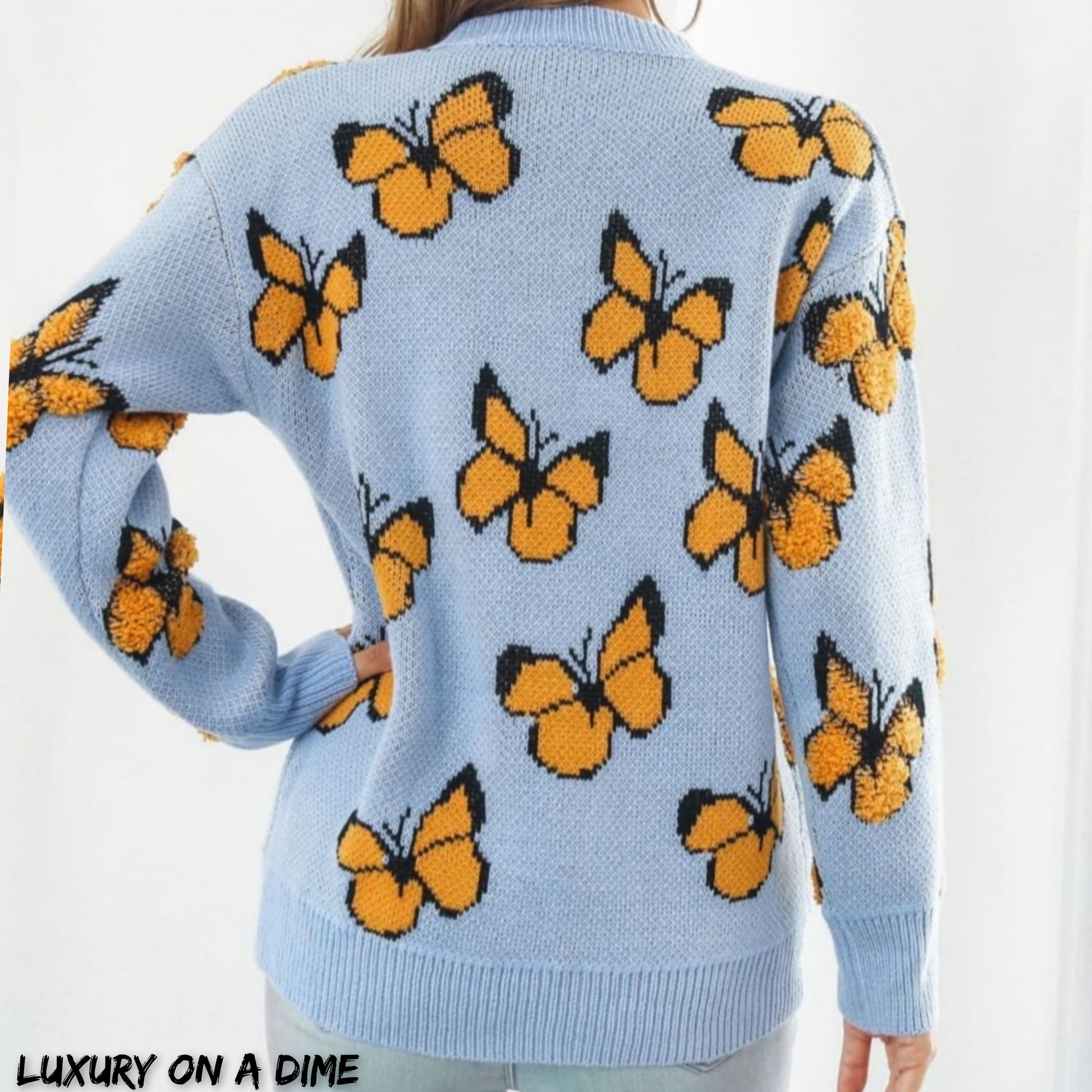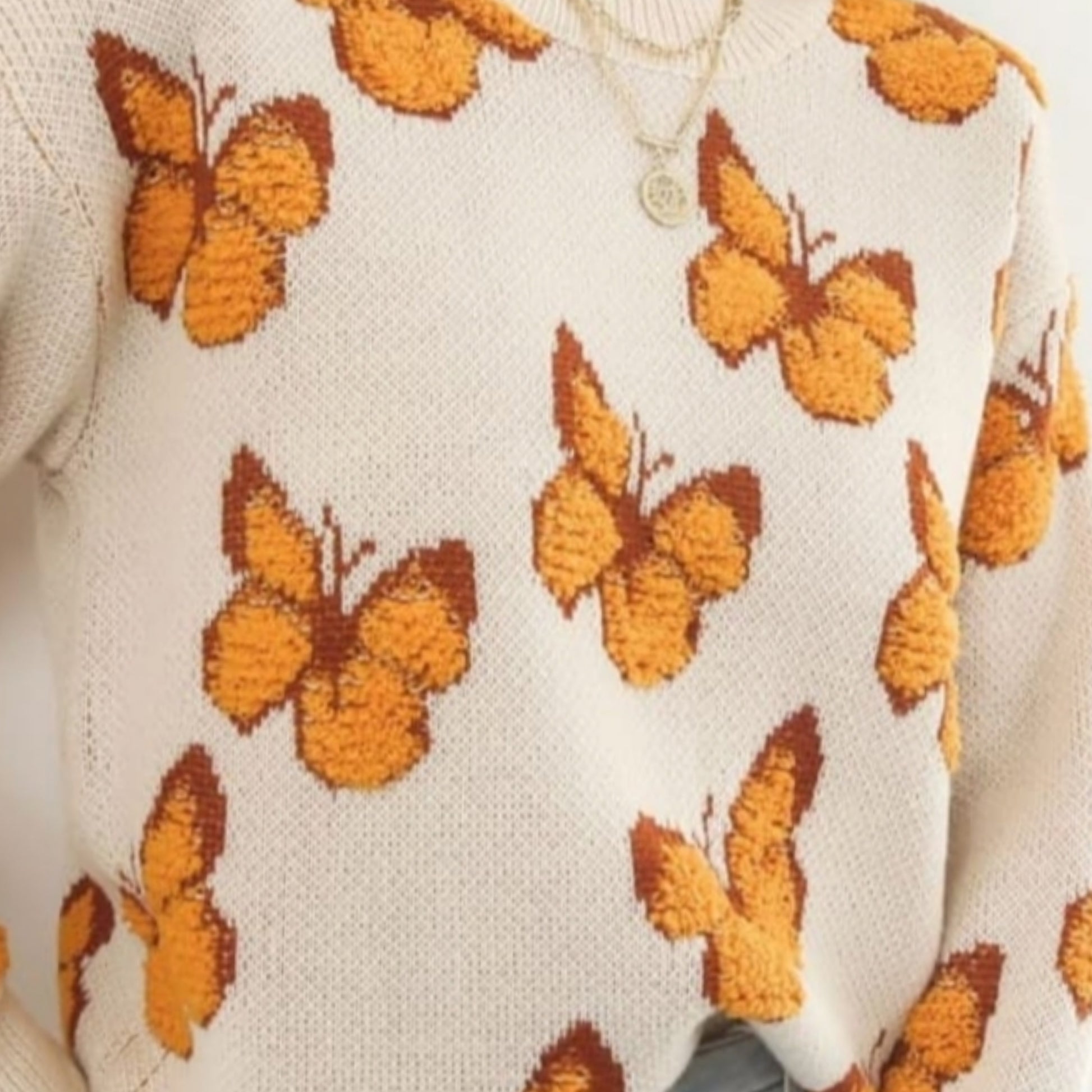 Fuzzy Monarch Butterfly Raised Shag Bold Colors Knit Pullover Sweater Shirt