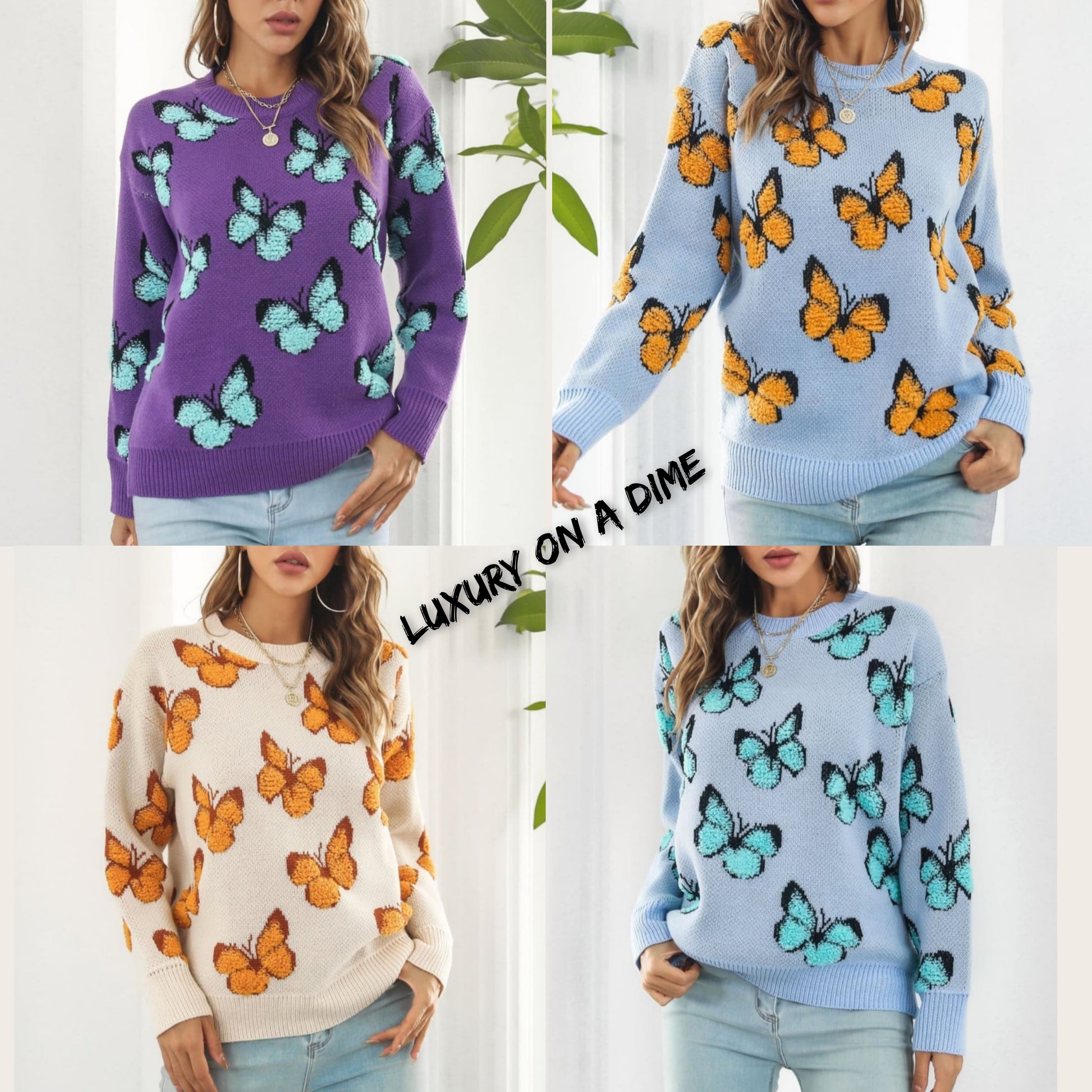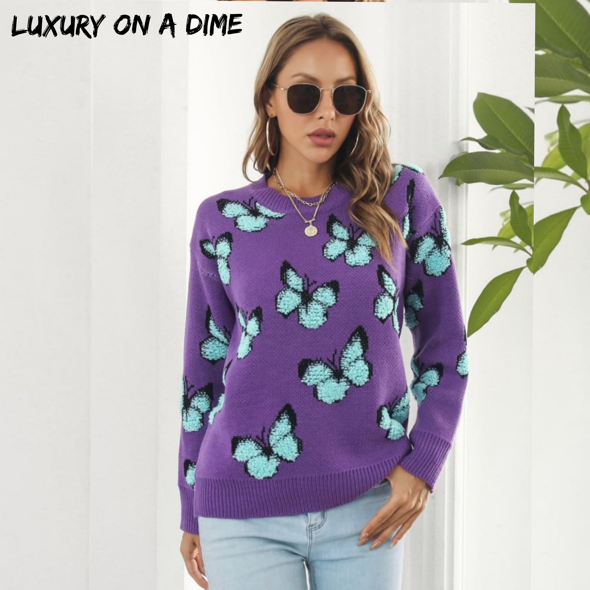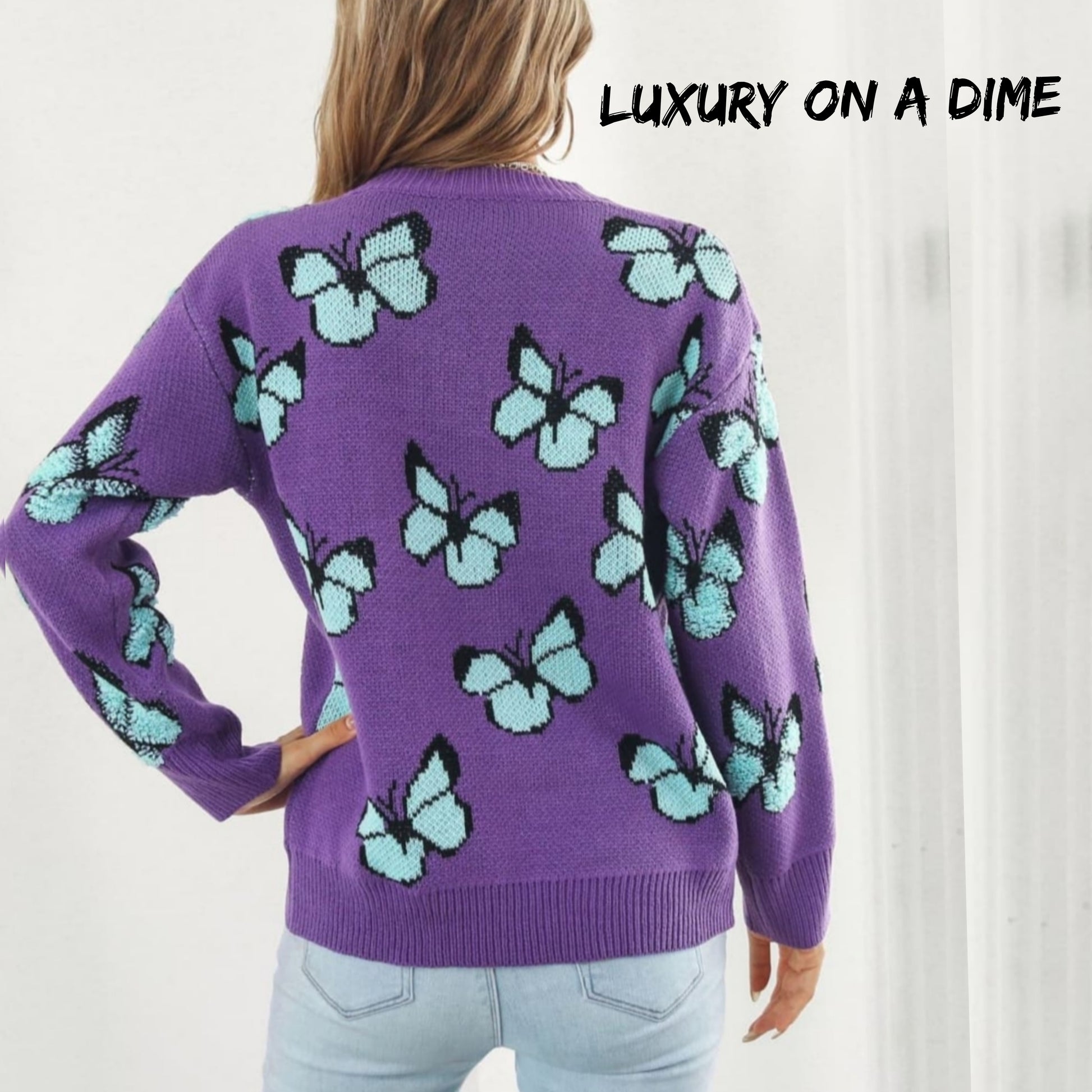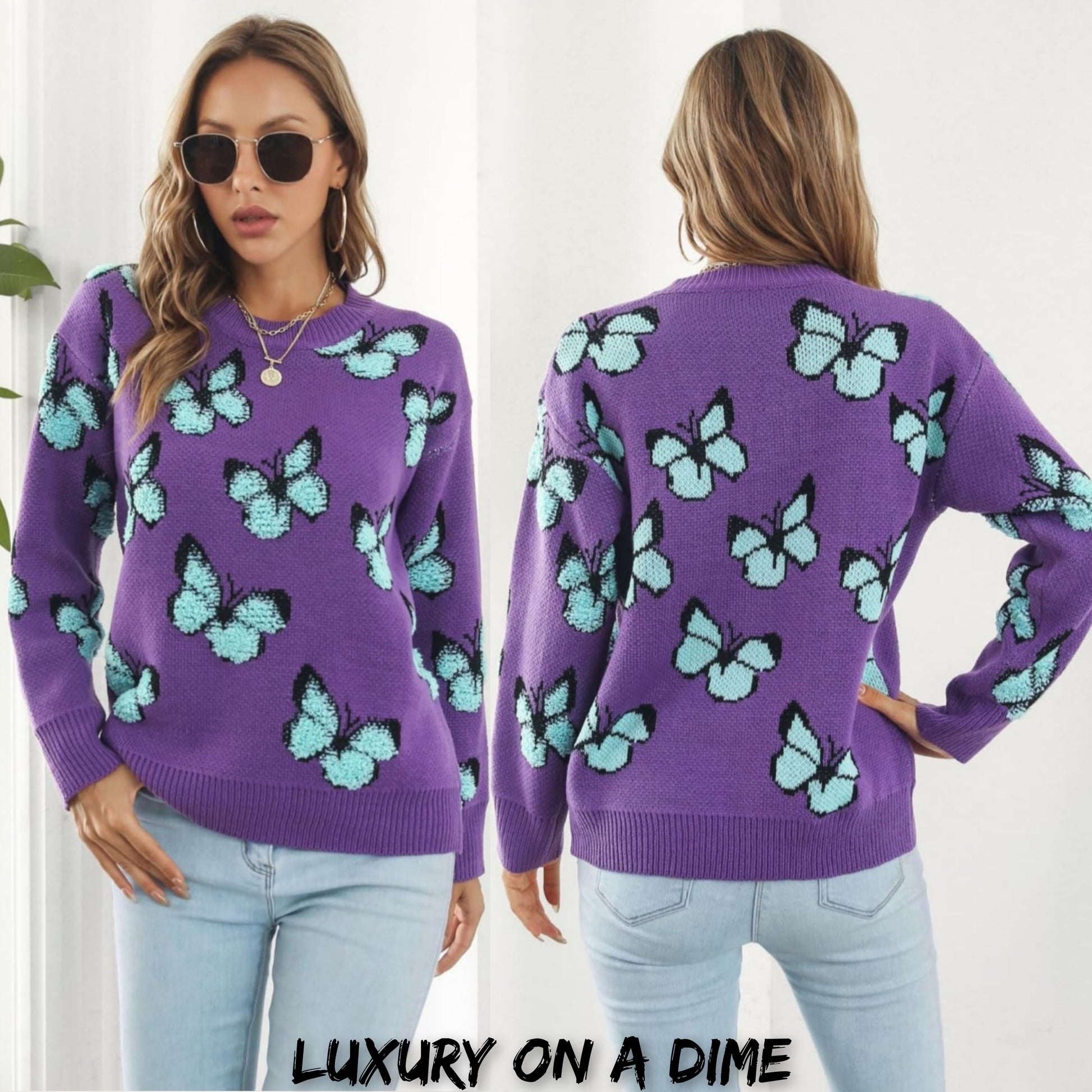 Fuzzy Monarch Butterfly Raised Shag Bold Colors Knit Pullover Sweater Shirt