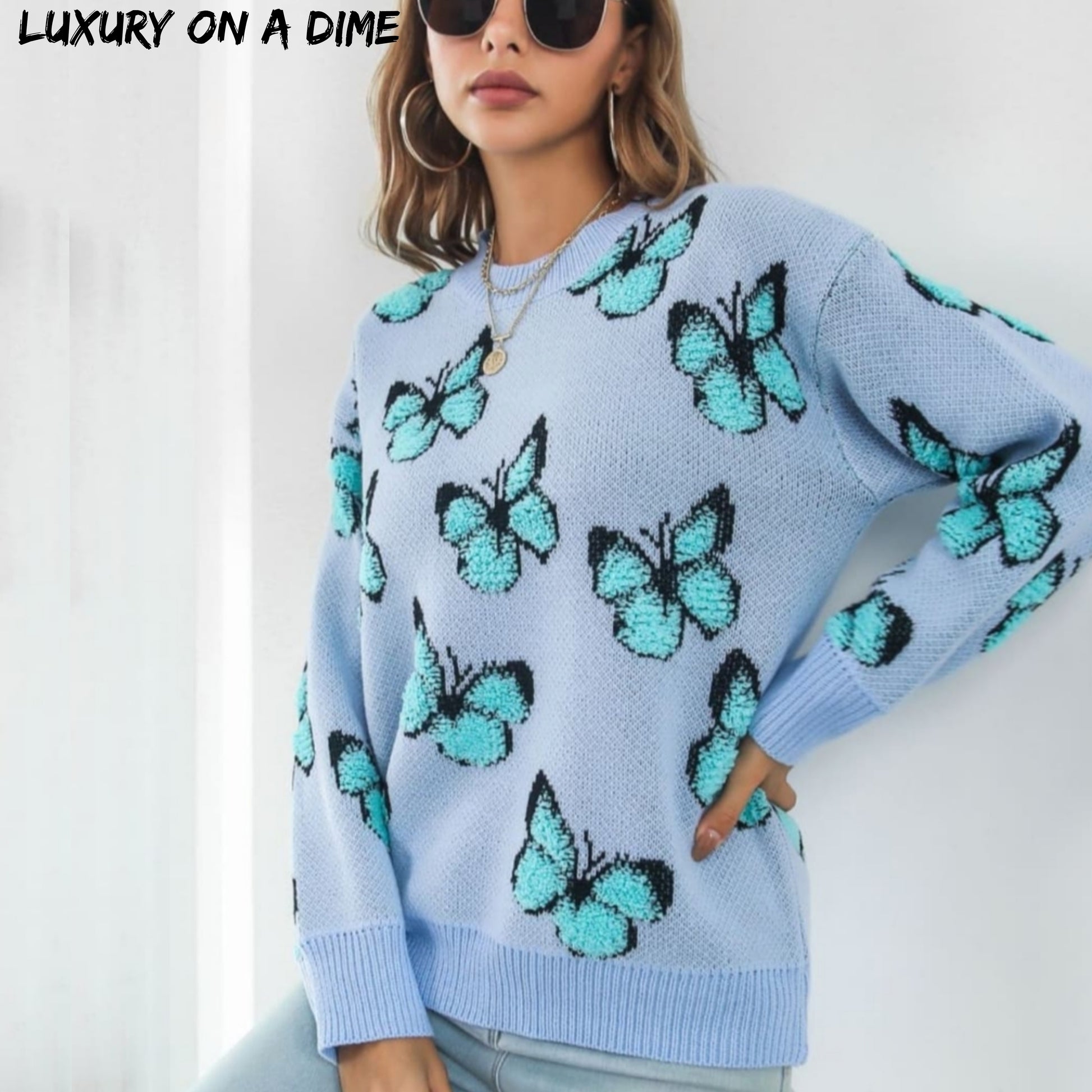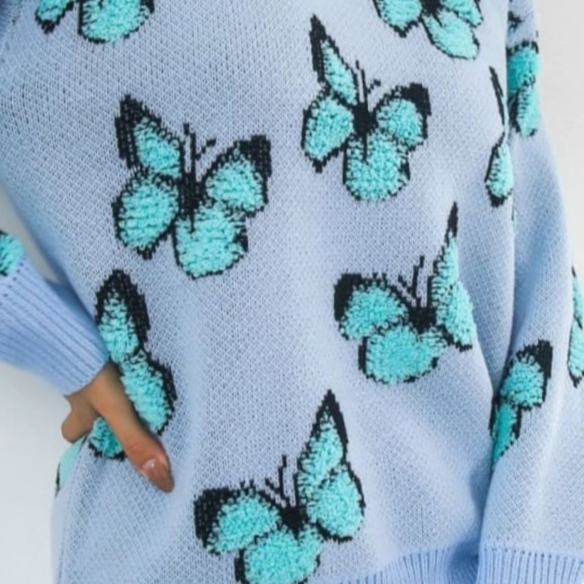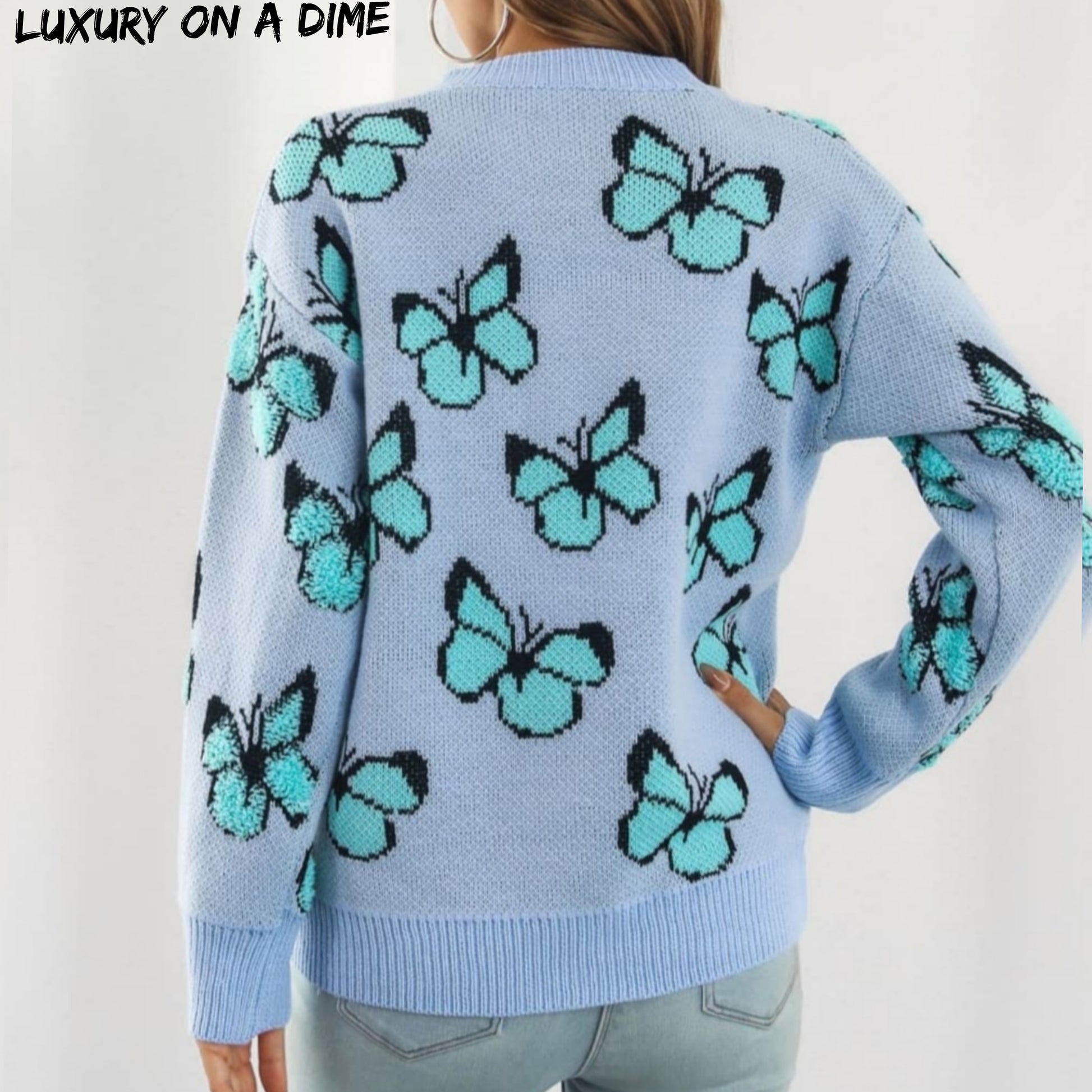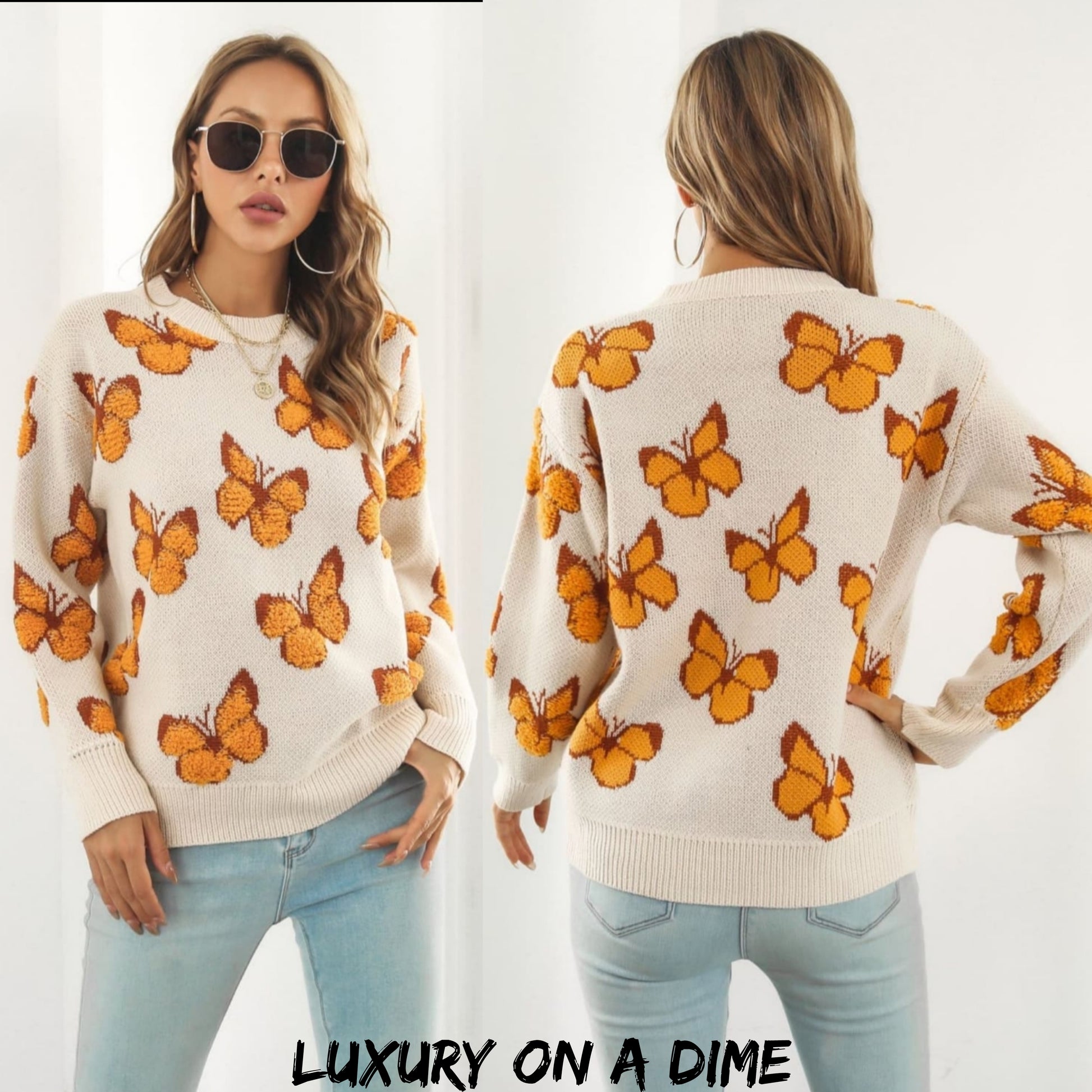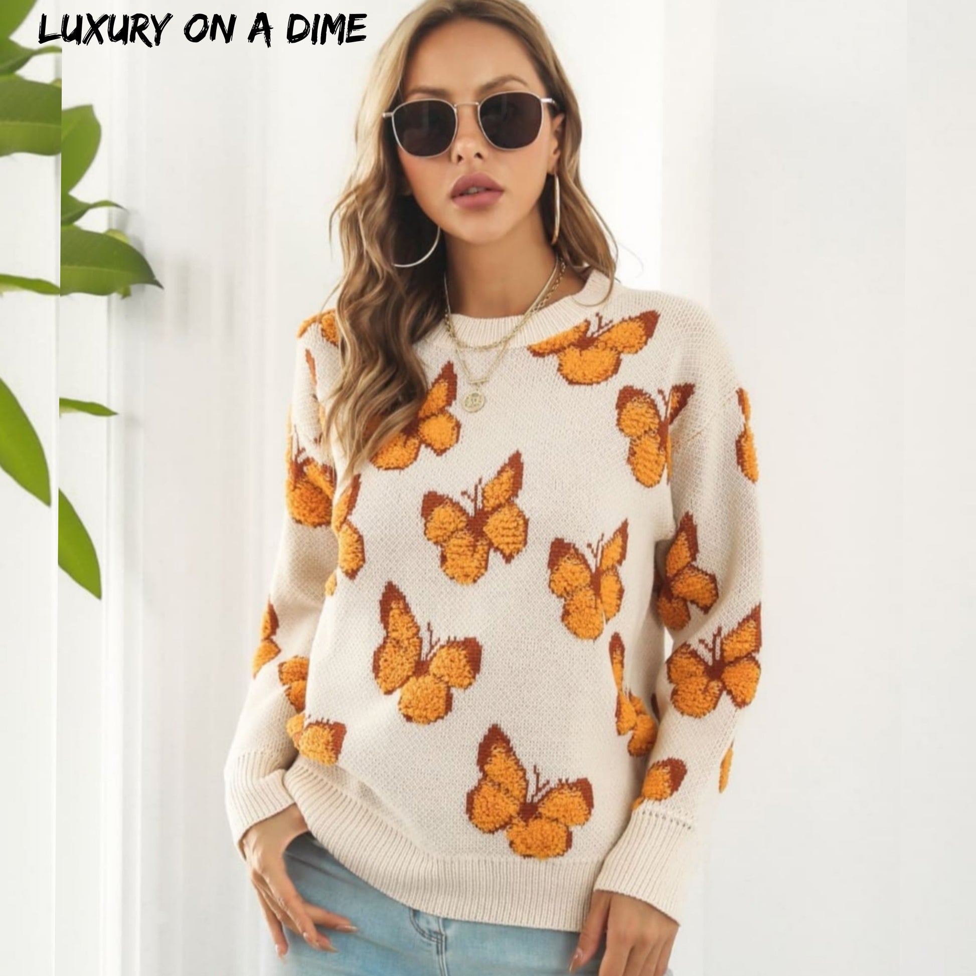 Fuzzy Monarch Butterfly Raised Shag Bold Colors Knit Pullover Sweater Shirt
