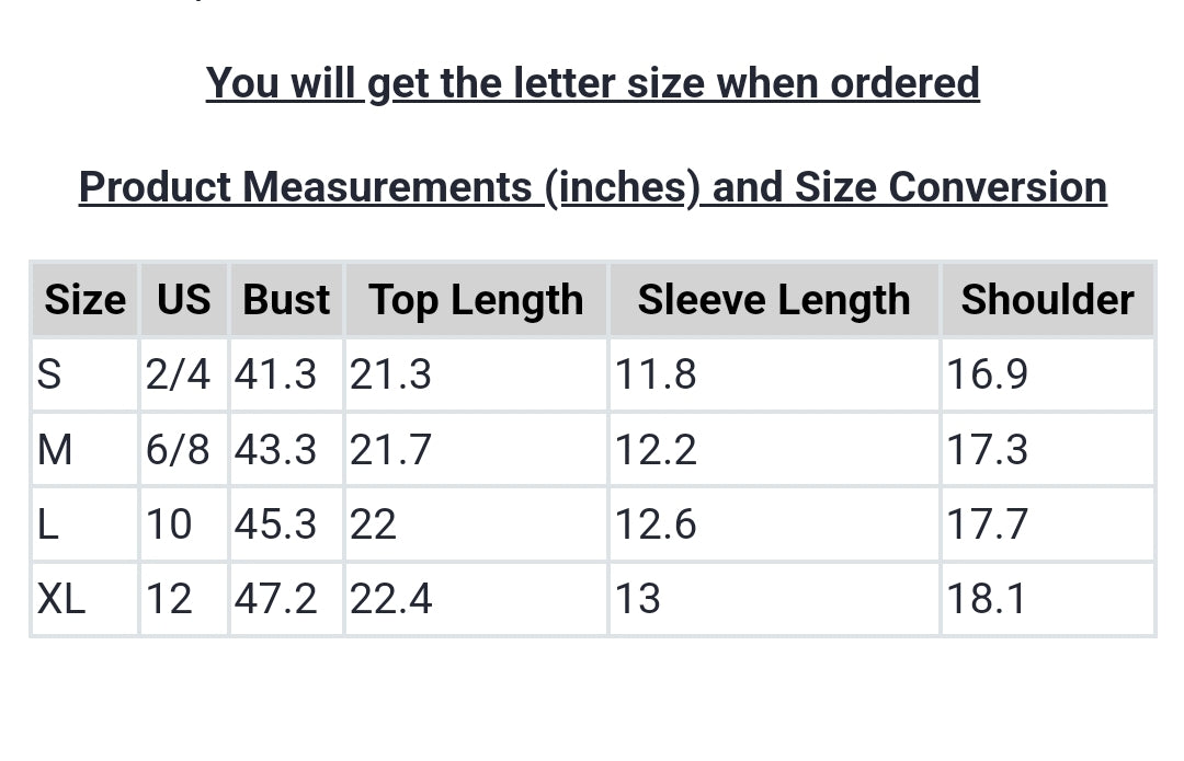 | Size | US | Bust | Top Length | Sleeve Length | Shoulder |