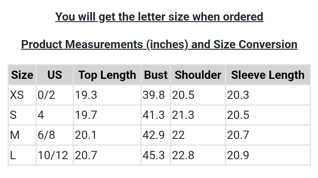 | Size | US | Top Length | Bust | Shoulder | Sleeve Length |