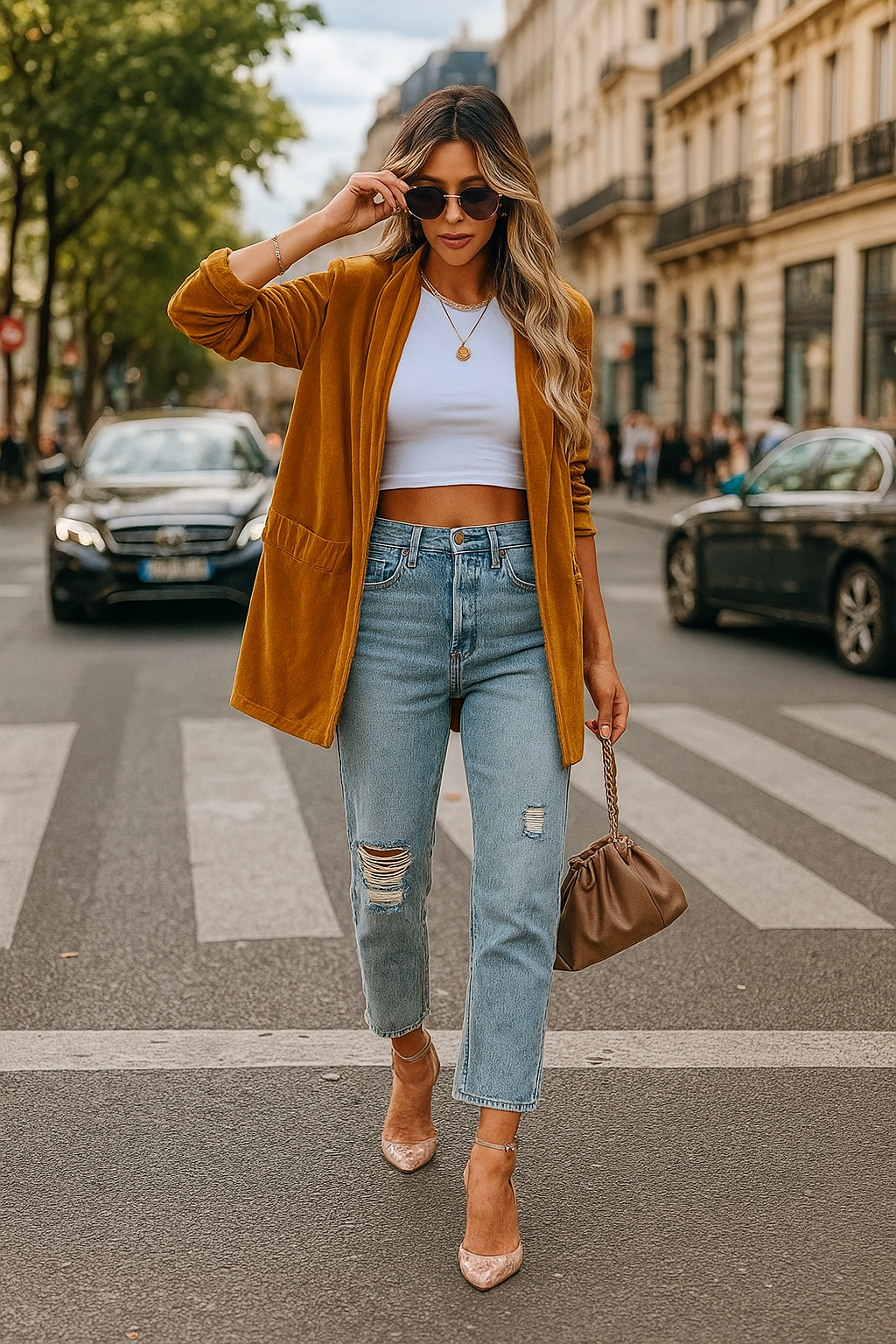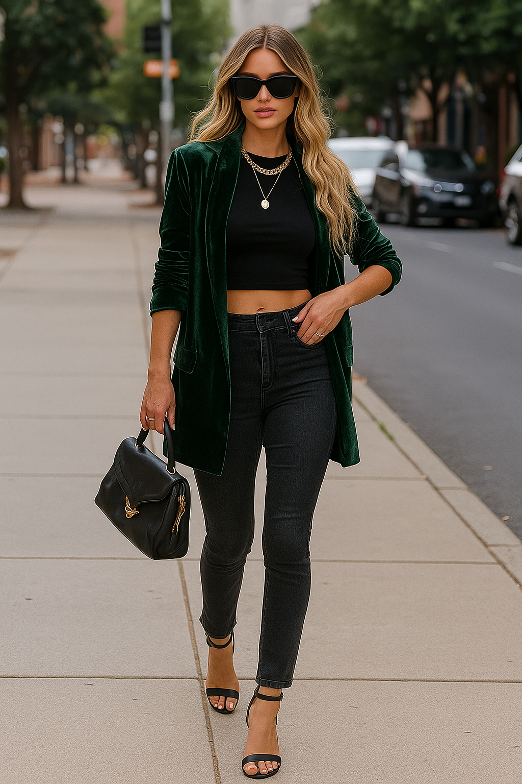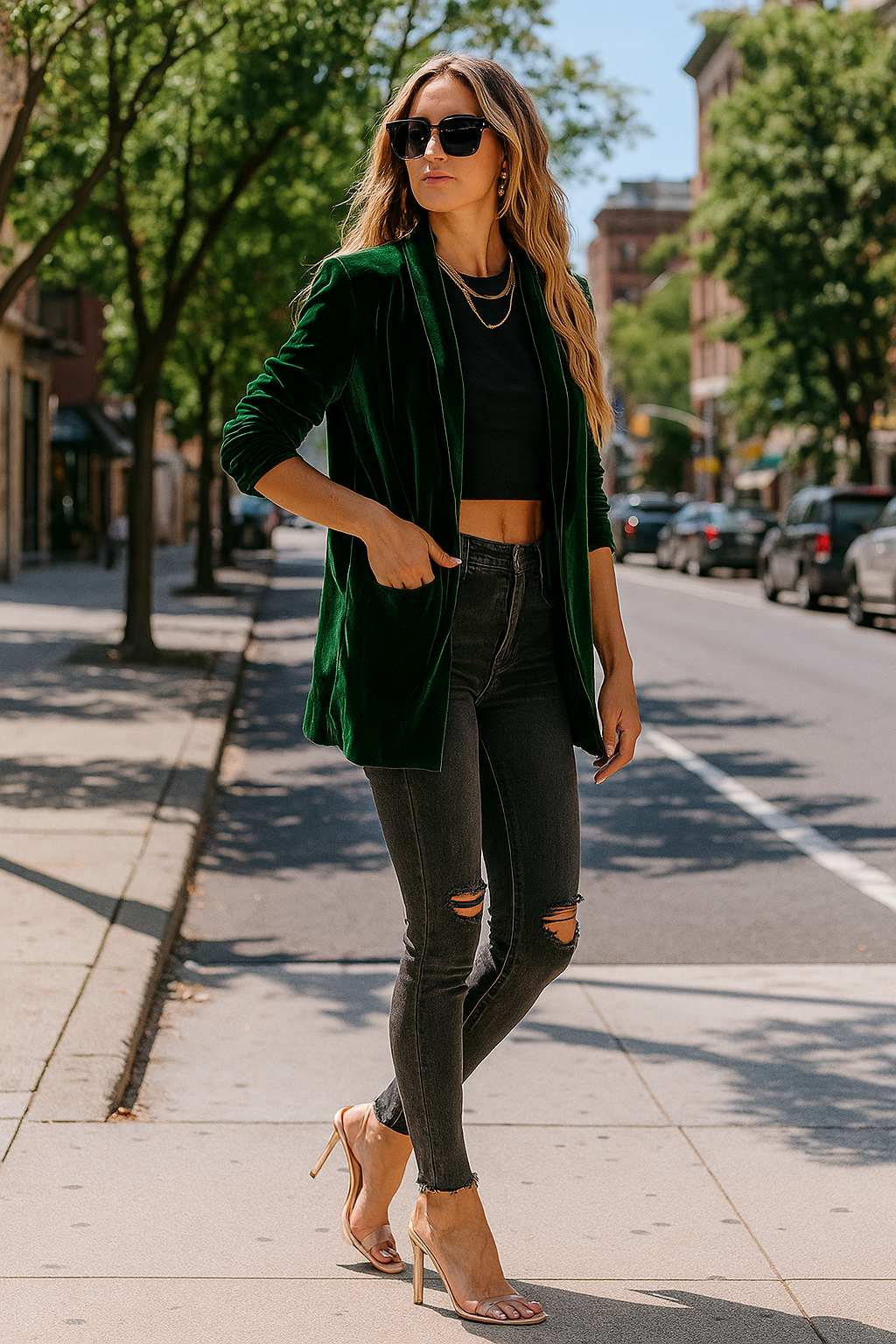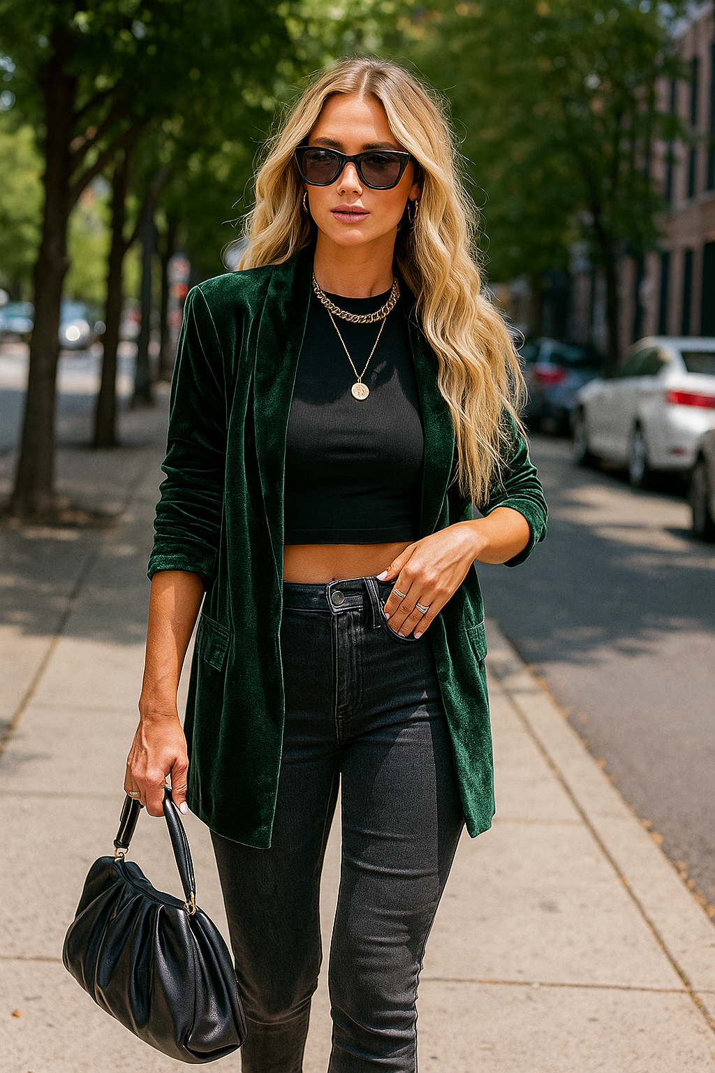 Step into timeless vintage-inspired style with this luxurious velour blazer. Designed with a rich sheen and soft drape, it flows effortlessly with every movement, giving it an elegant yet relaxed aesthetic. The single button front silhouette offers versatility, making it perfect for layering over casual outfits or dressing up for a chic evening look. Its oversized boyfriend fit adds drama with a little bit of charm. Large flap pockets for all of your essentials add a touch of sophistication. While the plush texture channels a retro glam vibe reminiscent of 70s bohemian and disco influences. With its comfortable stretch and lightweight feel, this playful piece effortlessly blends statement style with everyday wearability.