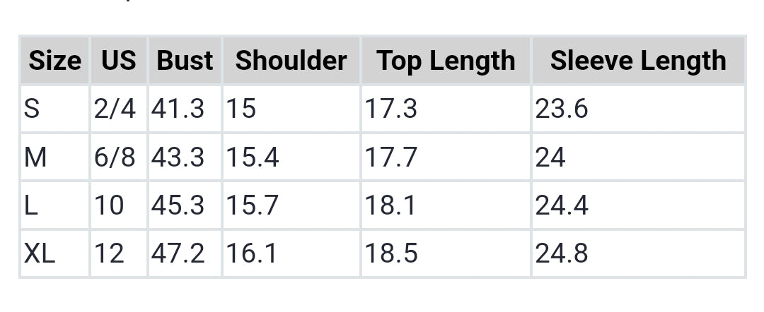 | Size | US | Bust | Shoulder | Top Length | Sleeve Length |