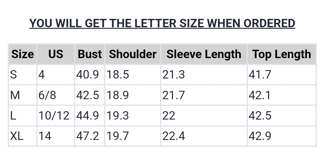 | Size | US | Bust | Shoulder | Sleeve Length | Top Length |