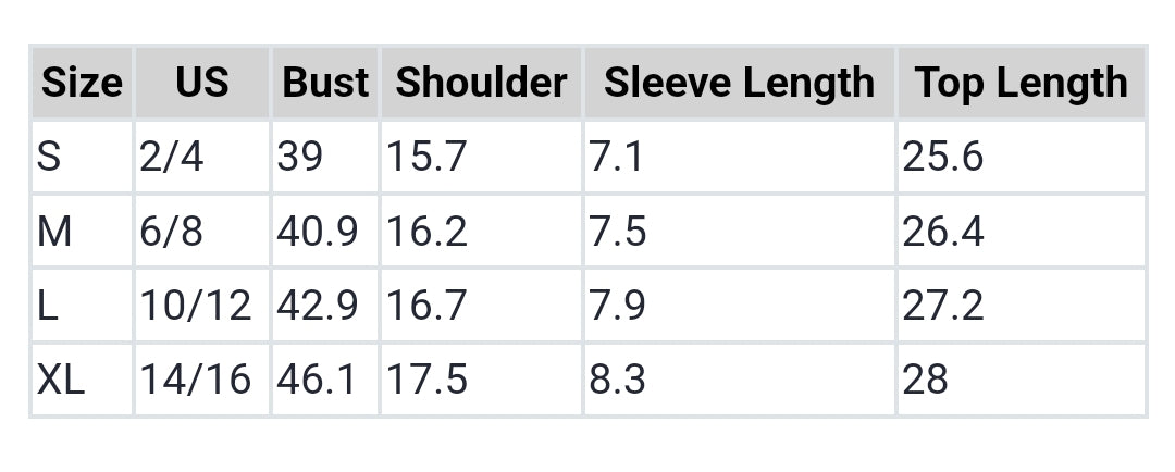 | Size | US | Bust | Shoulder | Sleeve Length | Top Length |