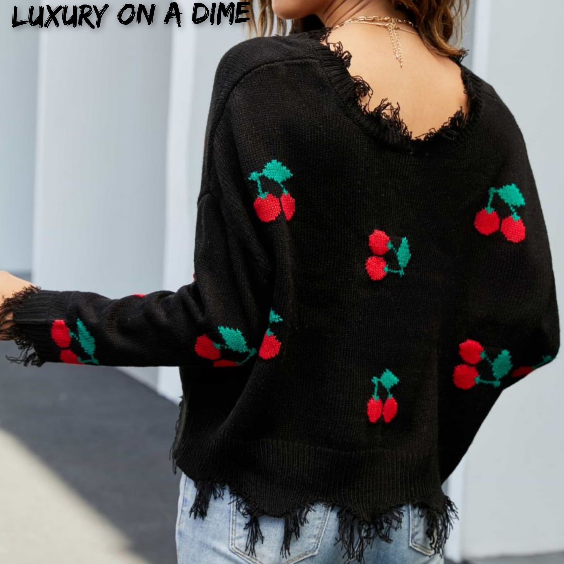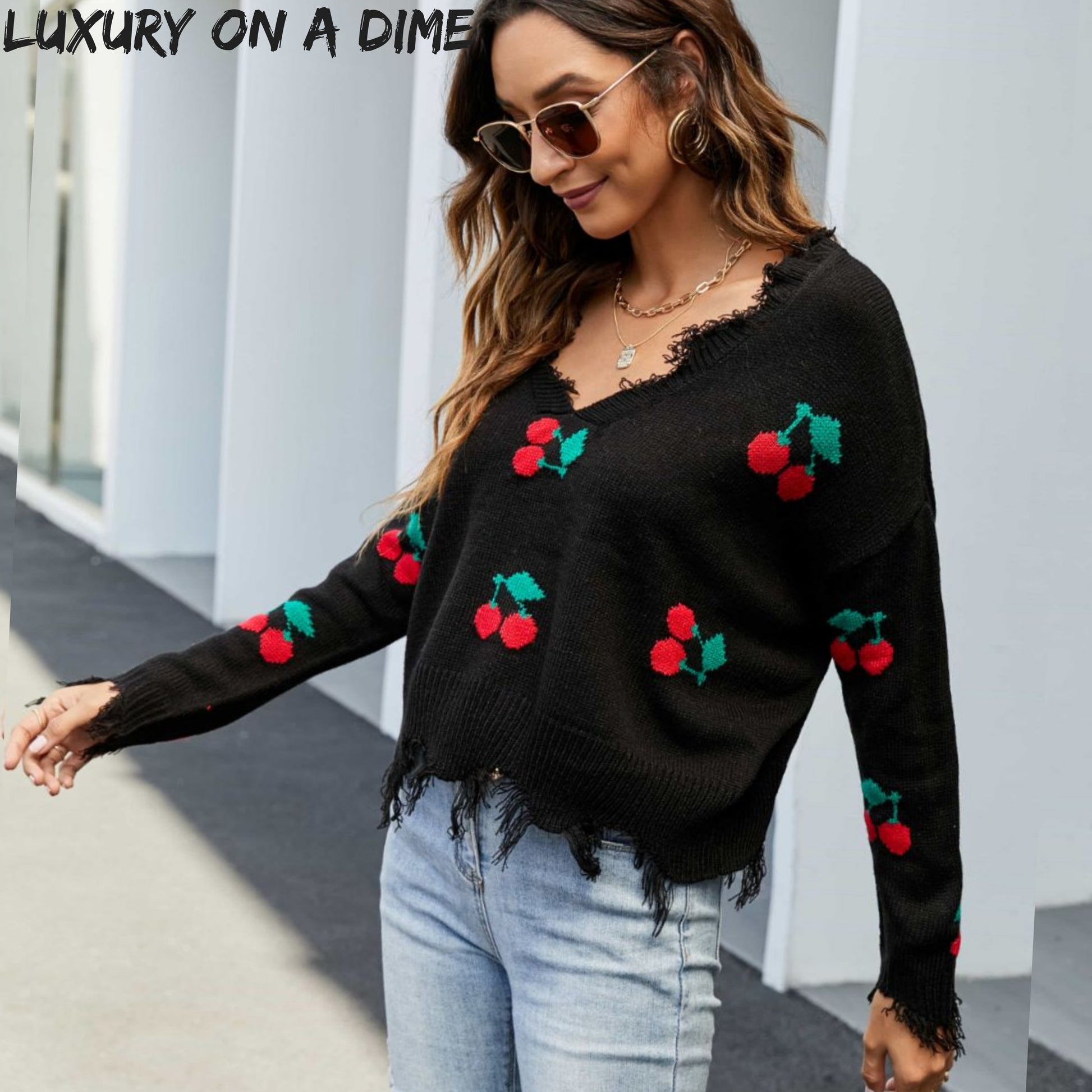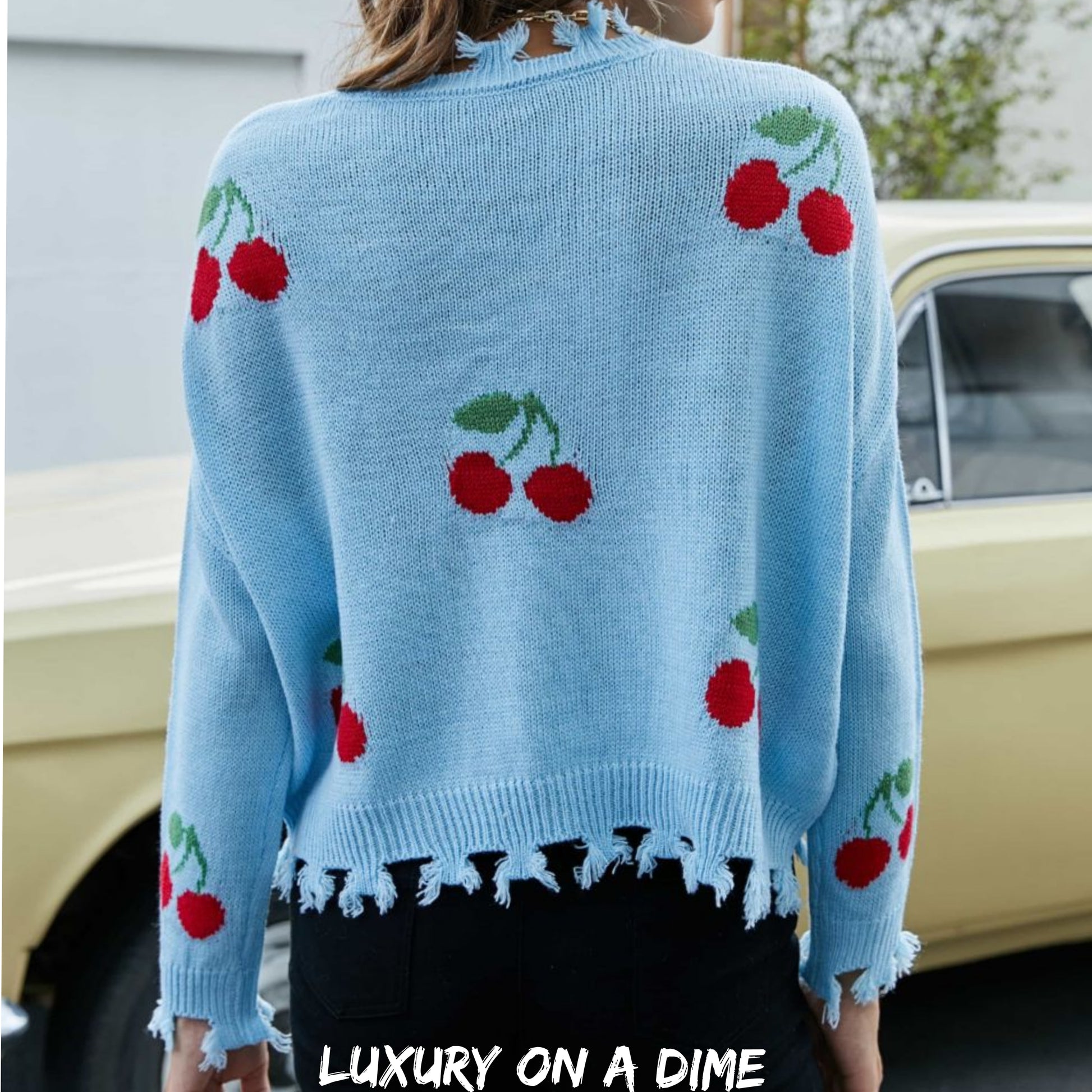 Cherry Crop Top Long Sleeve Raw Hem Knit Pullover Sweater (3 colors available)
