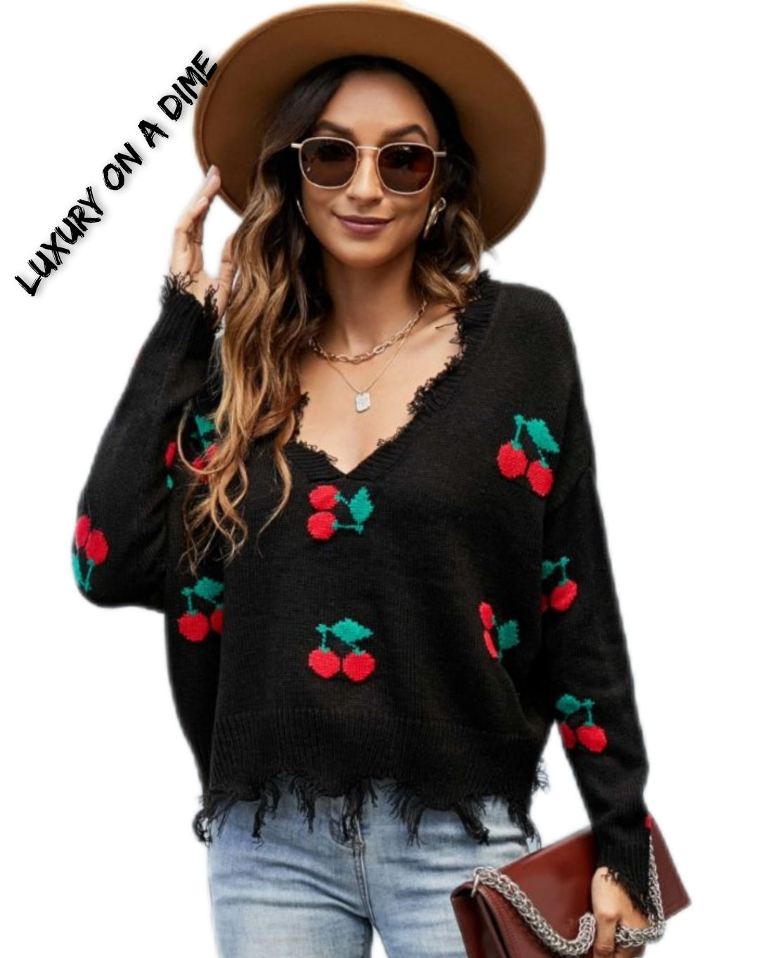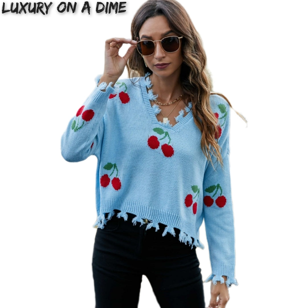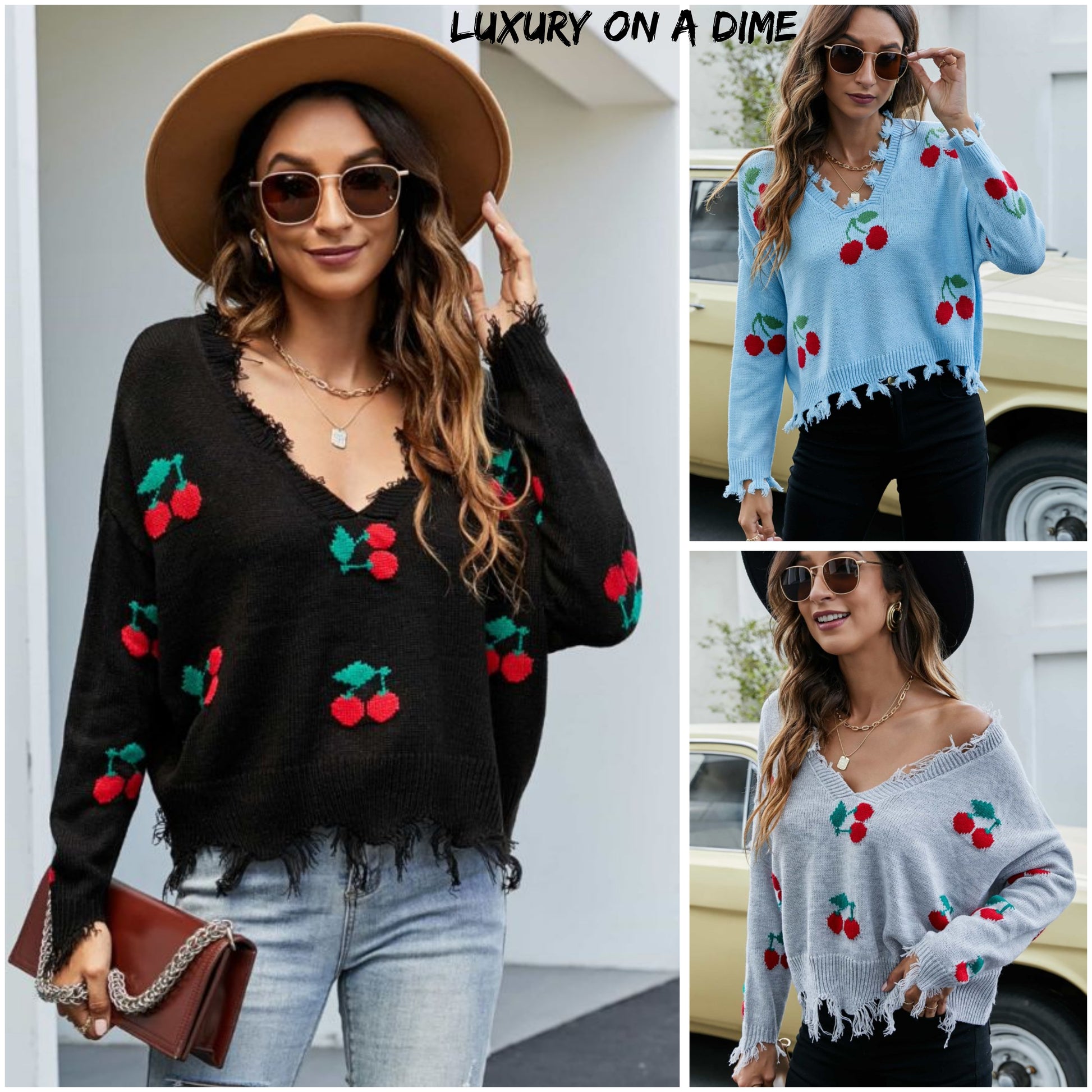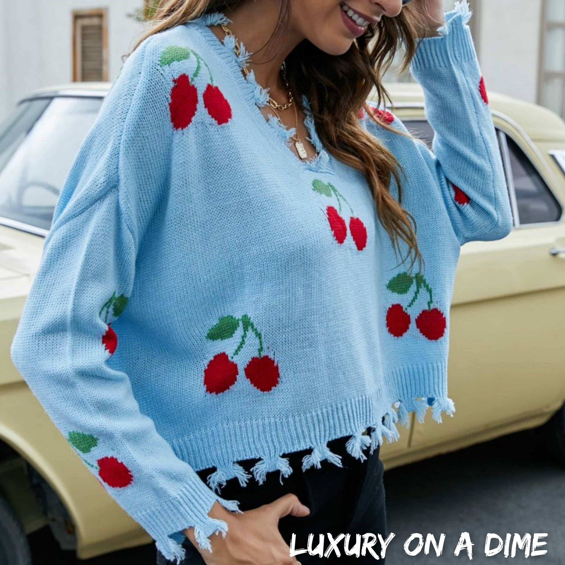 Cherry Crop Top Long Sleeve Raw Hem Knit Pullover Sweater (3 colors available)