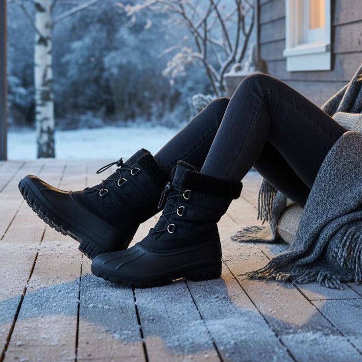 Built for warmth, function, and rugged seasonal comfort, these winter boots blend wintercore, snow-day practicality, lodgecore, outdoor utility, cold-weather durability, and cozy cabin aesthetics. The waterproof rubber duck shell keeps feet dry in slush, snow, and rain, while the insulated faux fur lining surrounds the foot in plush, cocoon-like warmth. Soft cushioning that supports long wear, and the bungee lace system with toggle offers secure adjustability even with gloves on. The weather-rated construction to -20°F, and a sturdy upper create a reliable boot designed for winter adventures, everyday cold-weather errands, and outdoor coziness. These boots bring together practicality and soft comfort, ideal for snow walks, cabin weekends, and frost-filled days.