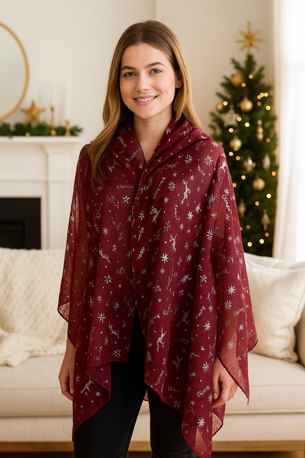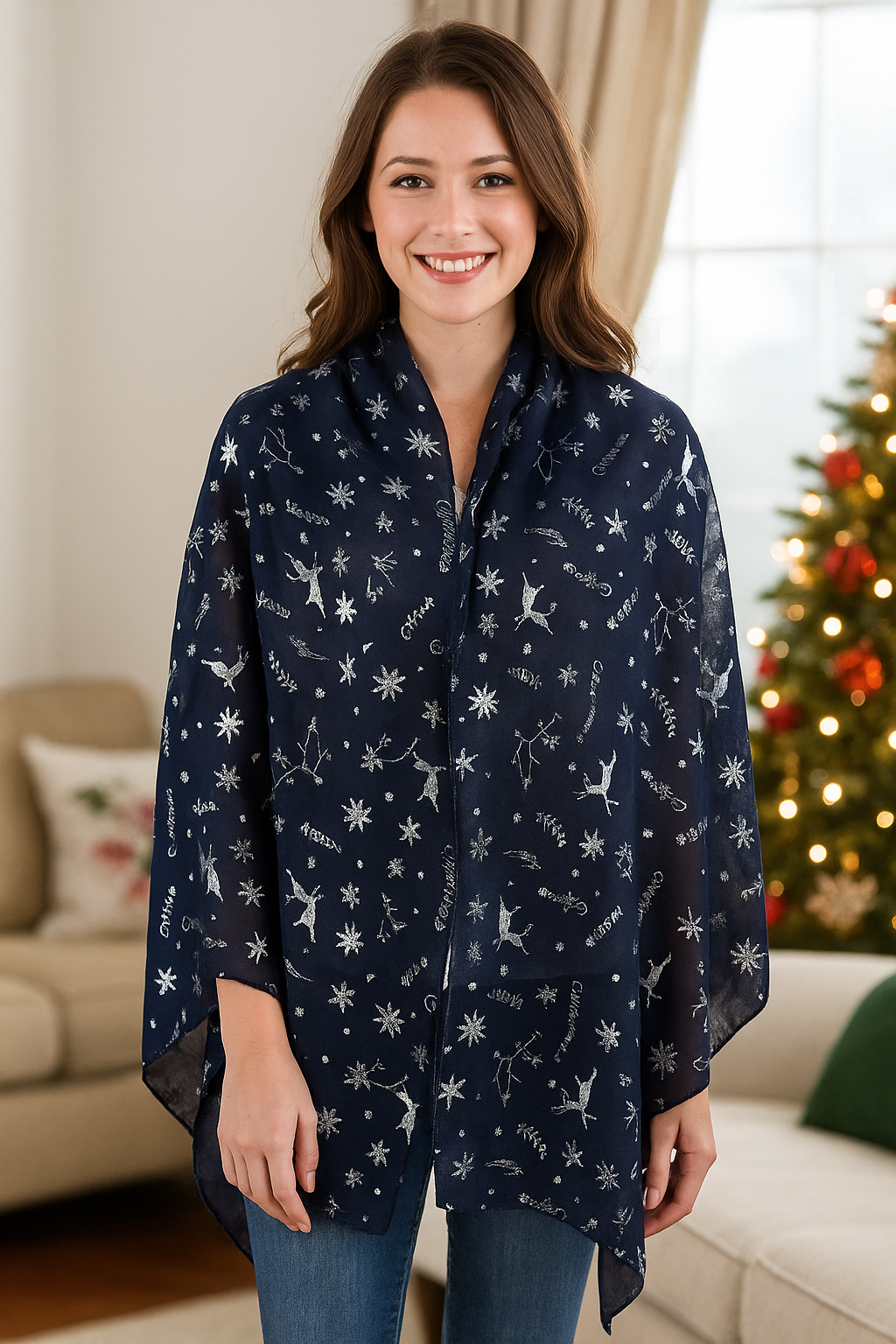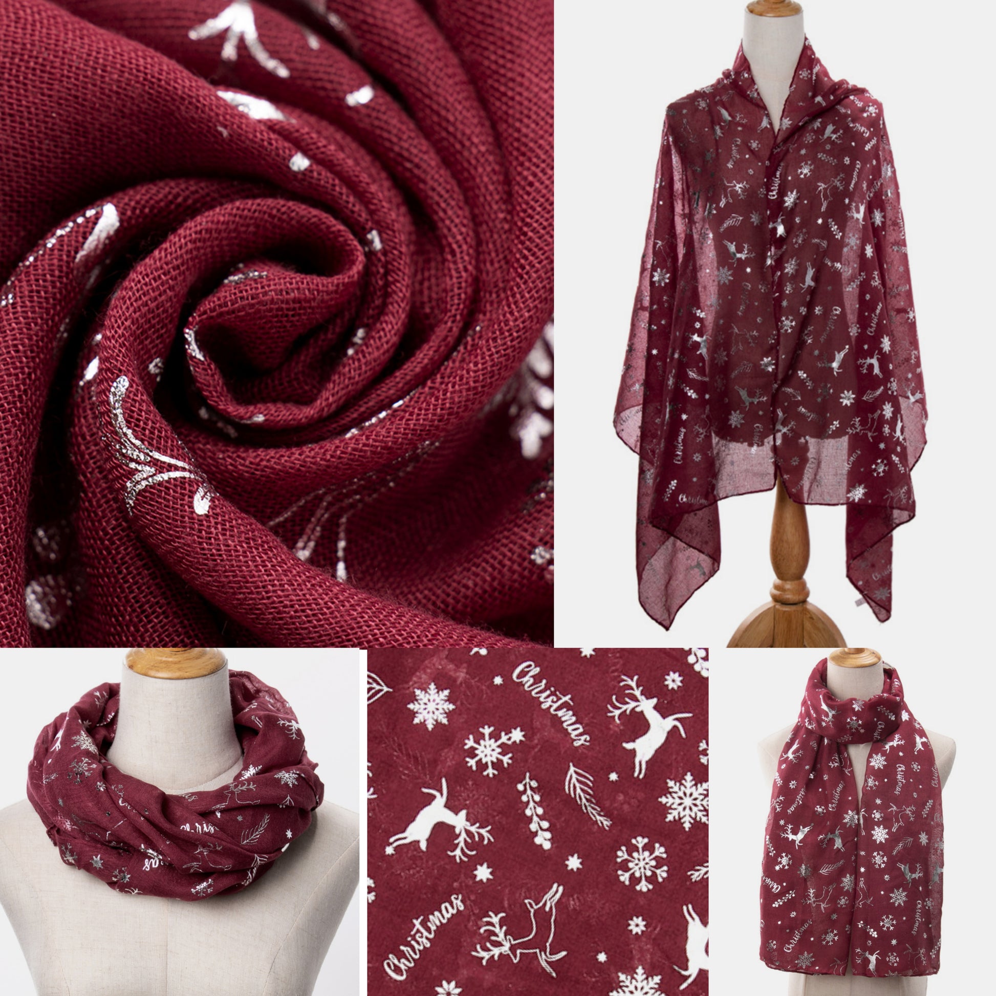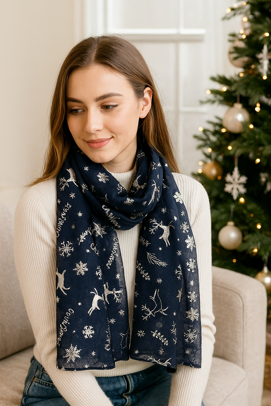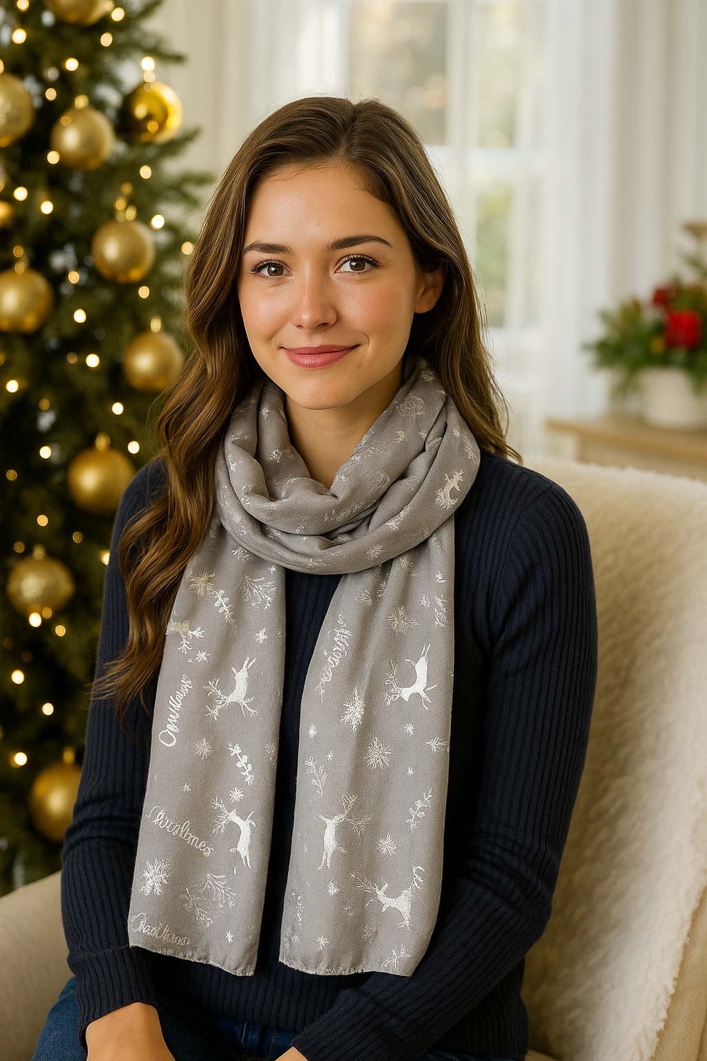 This reindeer print christmas scarf brings a touch of festive shimmer to cozy winter days. Its delicate metallic foil pattern features reindeer, snowflakes, and holiday lettering against a soft, lightweight backdrop, creating an effortlessly elegant festivecore and winter chic look. The shiny accents catch the light beautifully, making it perfect for holiday gatherings, gifting, or adding a seasonal sparkle to everyday outfits. Designed for versatility, this scarf can be styled as a wrap, shawl, or loop for an elevated yet relaxed winter aesthetic. Blending the nostalgic charm of retro christmas with the refined gleam of sparklecore, it captures the spirit of cozy celebrations and glimmering winter nights.