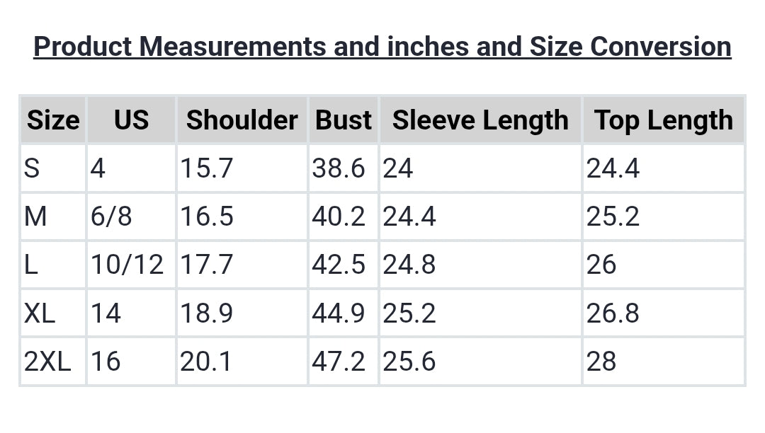 | Size | US | Shoulder | Bust | Sleeve Length | Top Length |