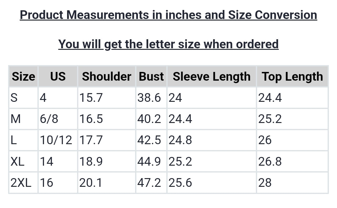 | Size | US | Shoulder | Bust | Sleeve Length | Top Length |