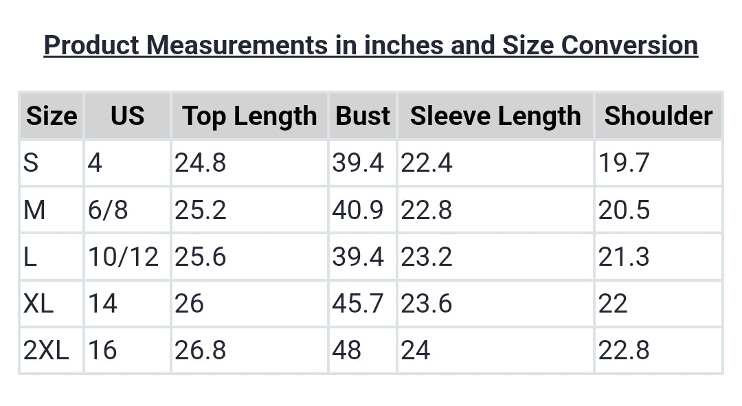| Size | US | Top Length | Bust | Sleeve Length | Shoulder |