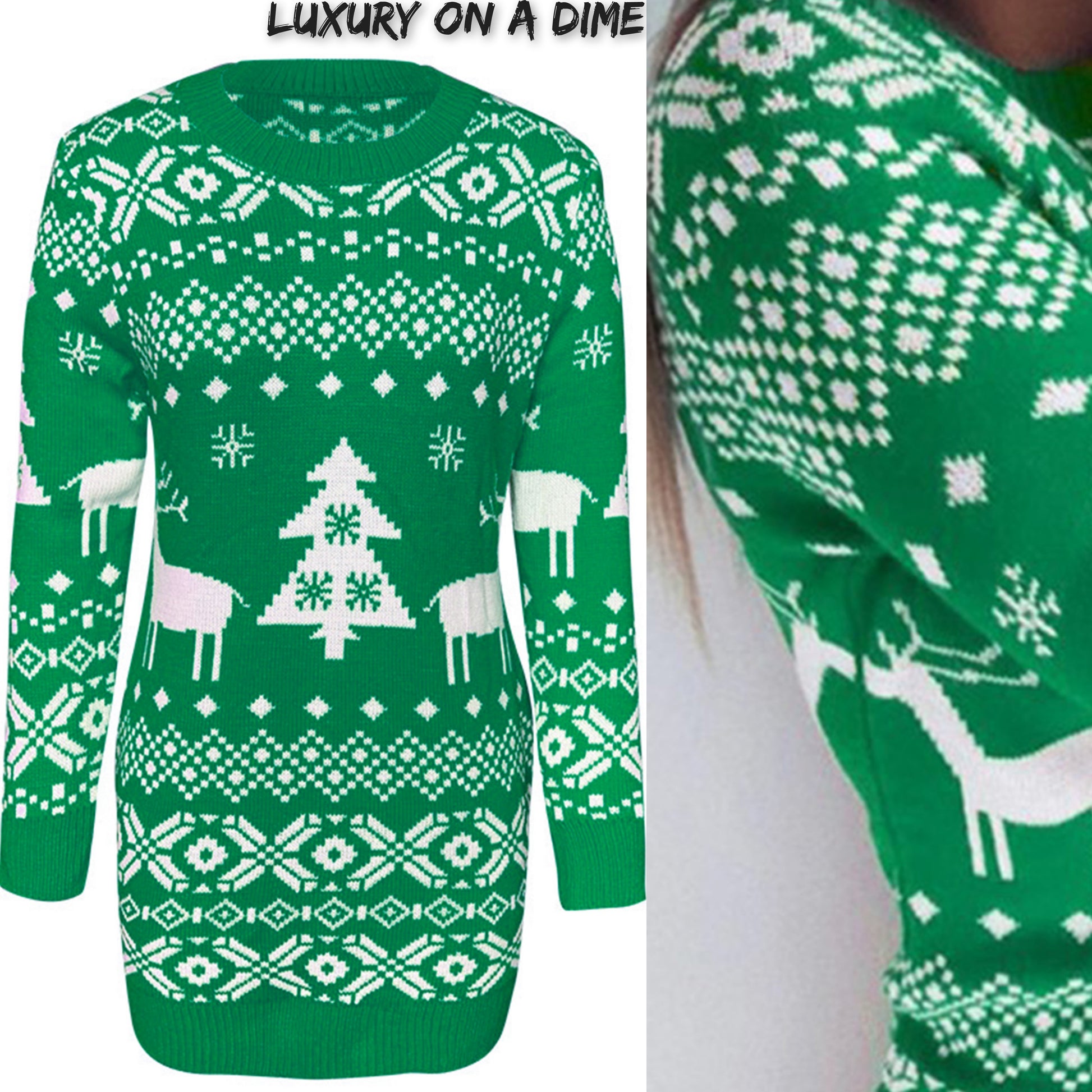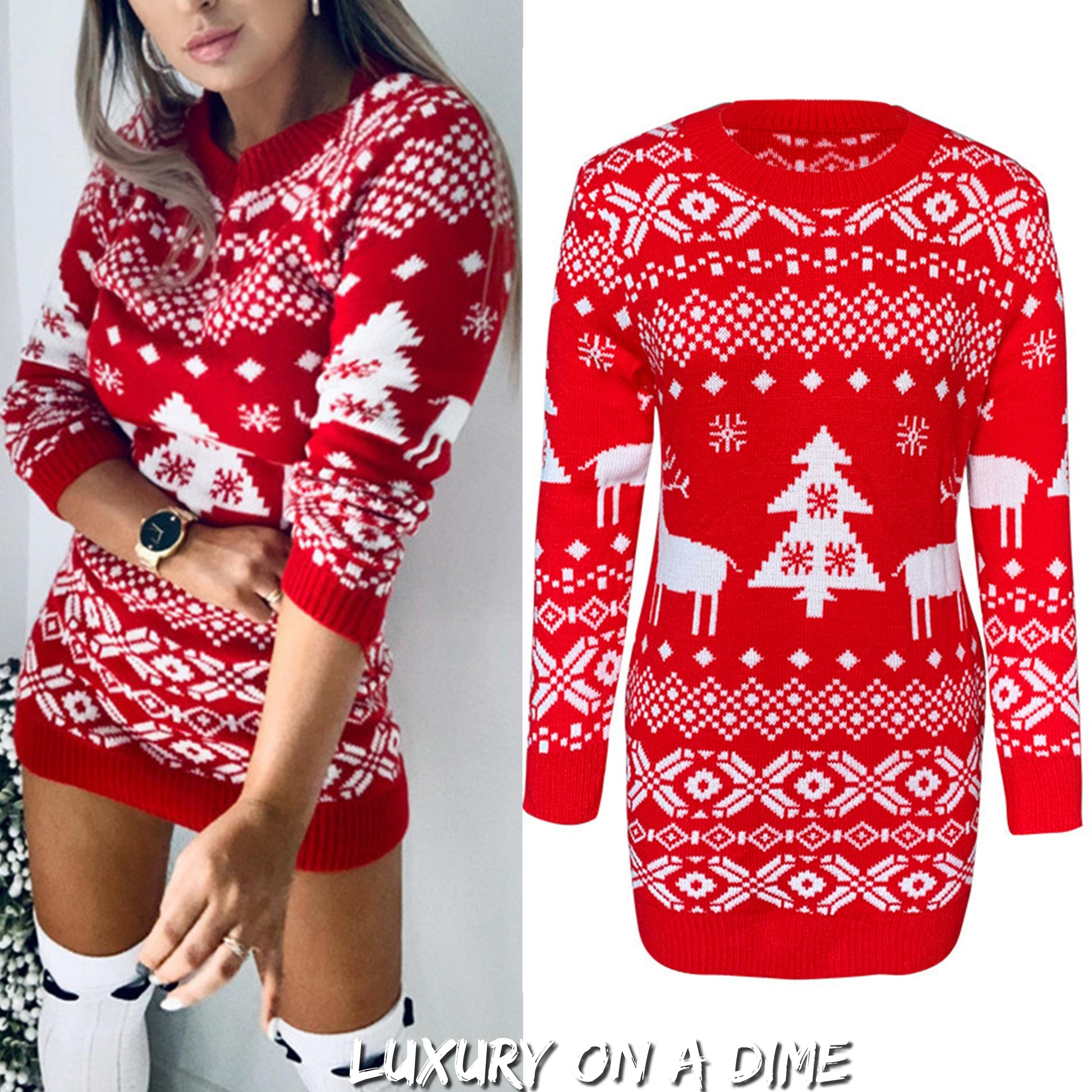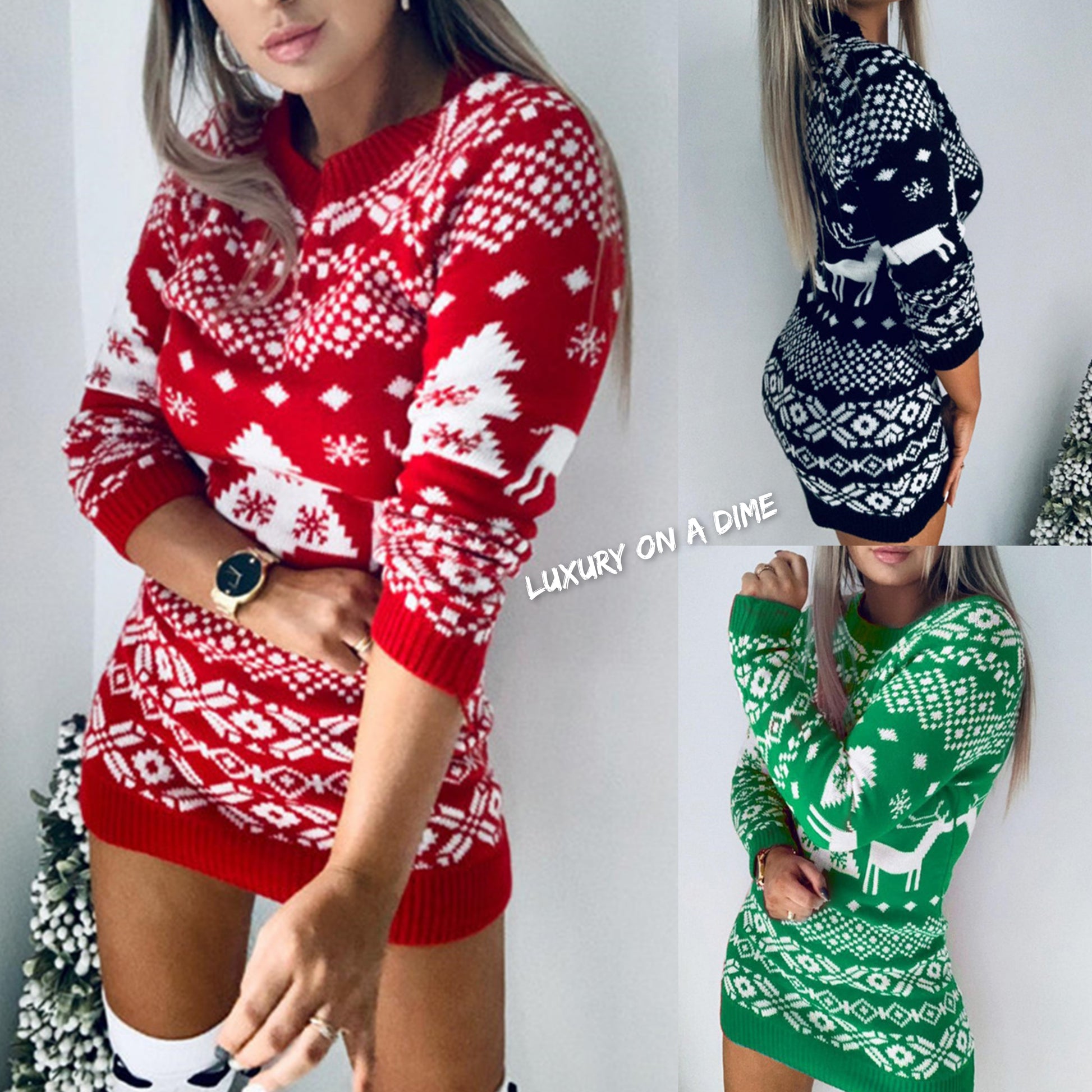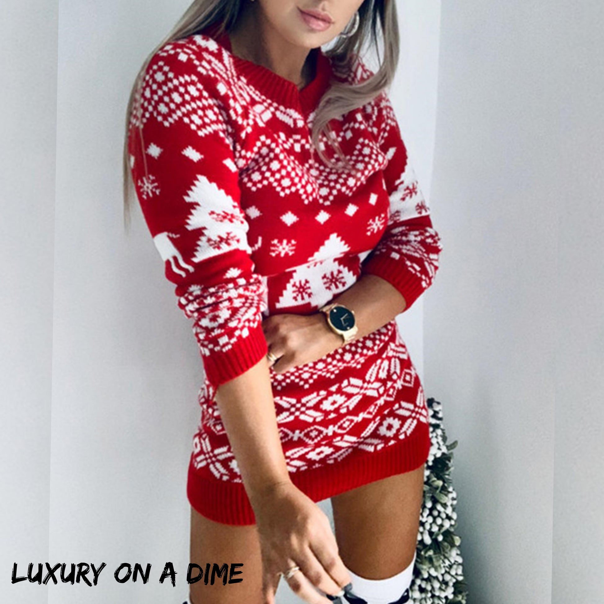This knit sweater dress offers a classic festive bold print thats not just for Christmas.