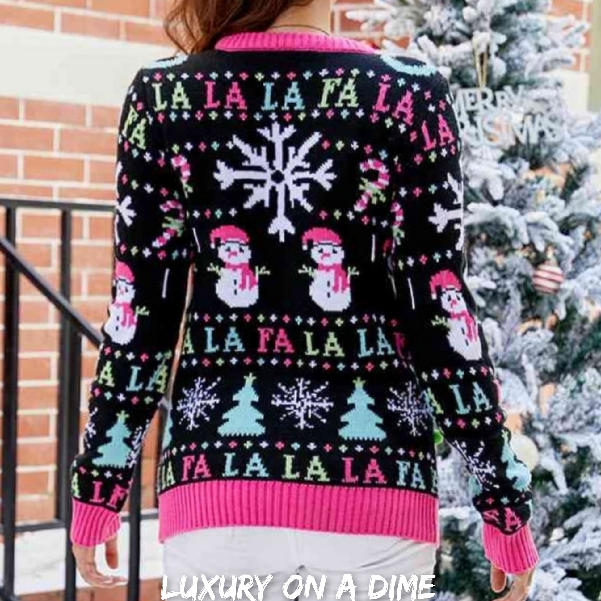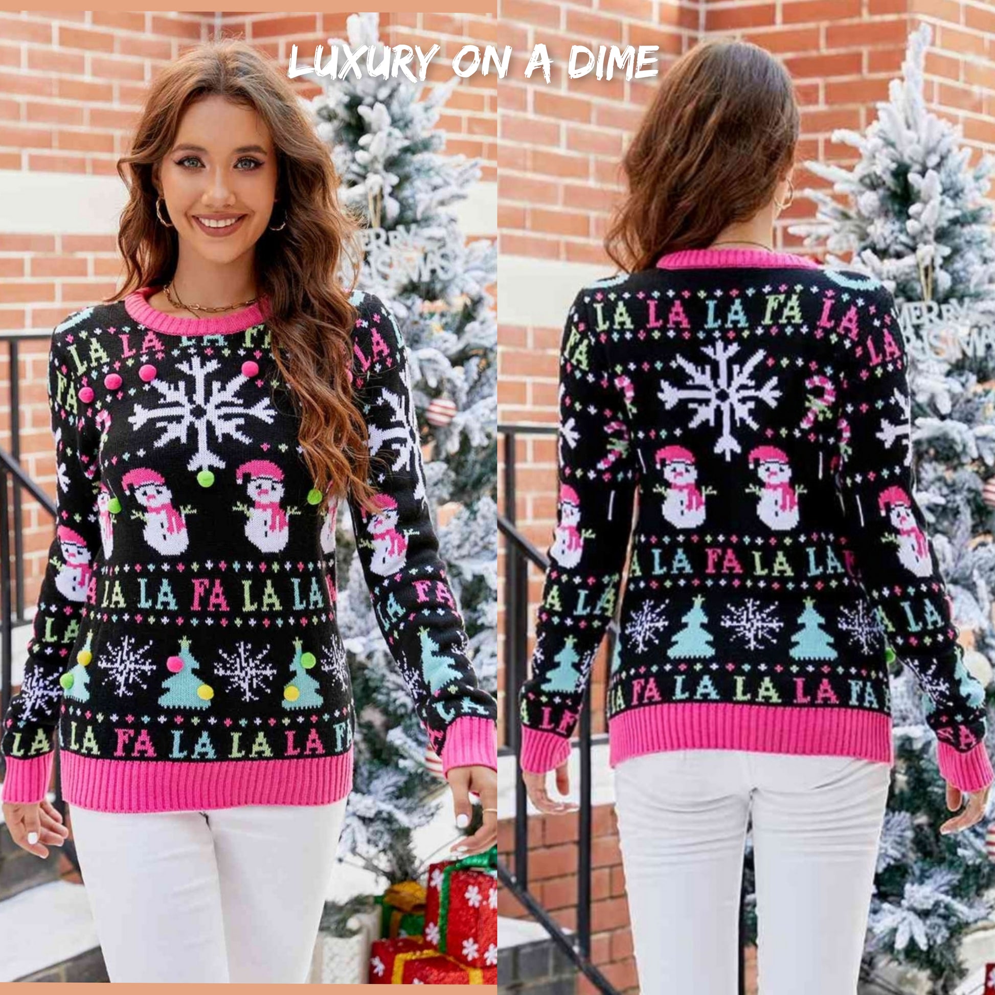 Features a unique pattern with snowflakes, snowmen, Christmas trees accented with raised puffballs and Fa La La La.