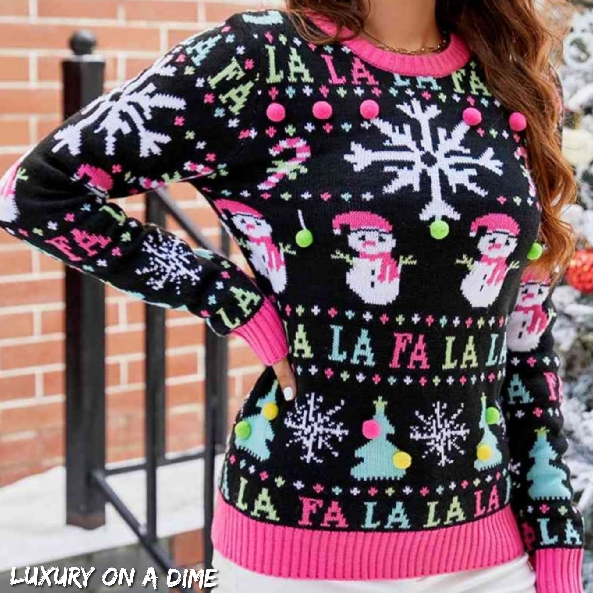 Neon Snowman Festive Puff Ball Christmas Holiday Long Sleeve Winter Sweater