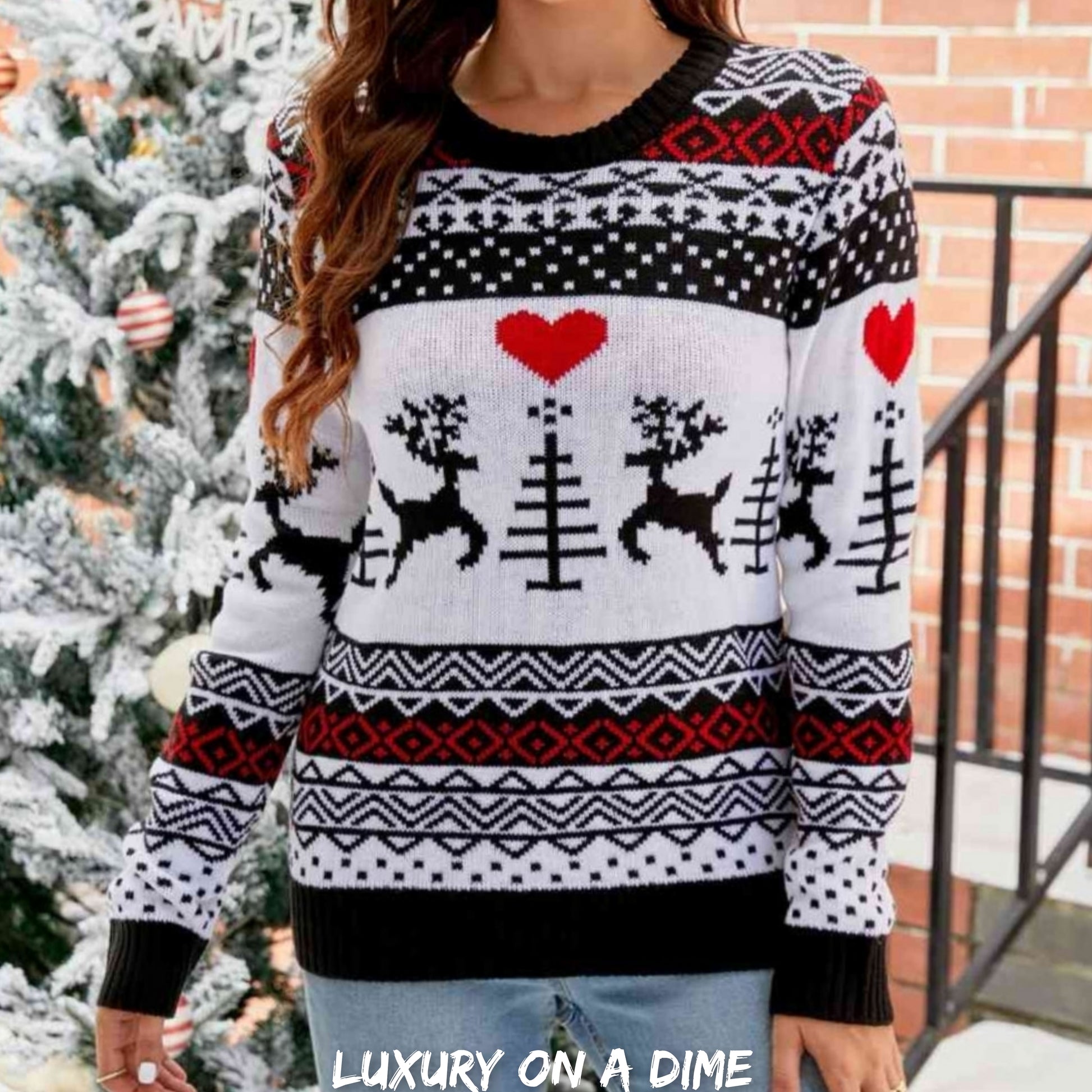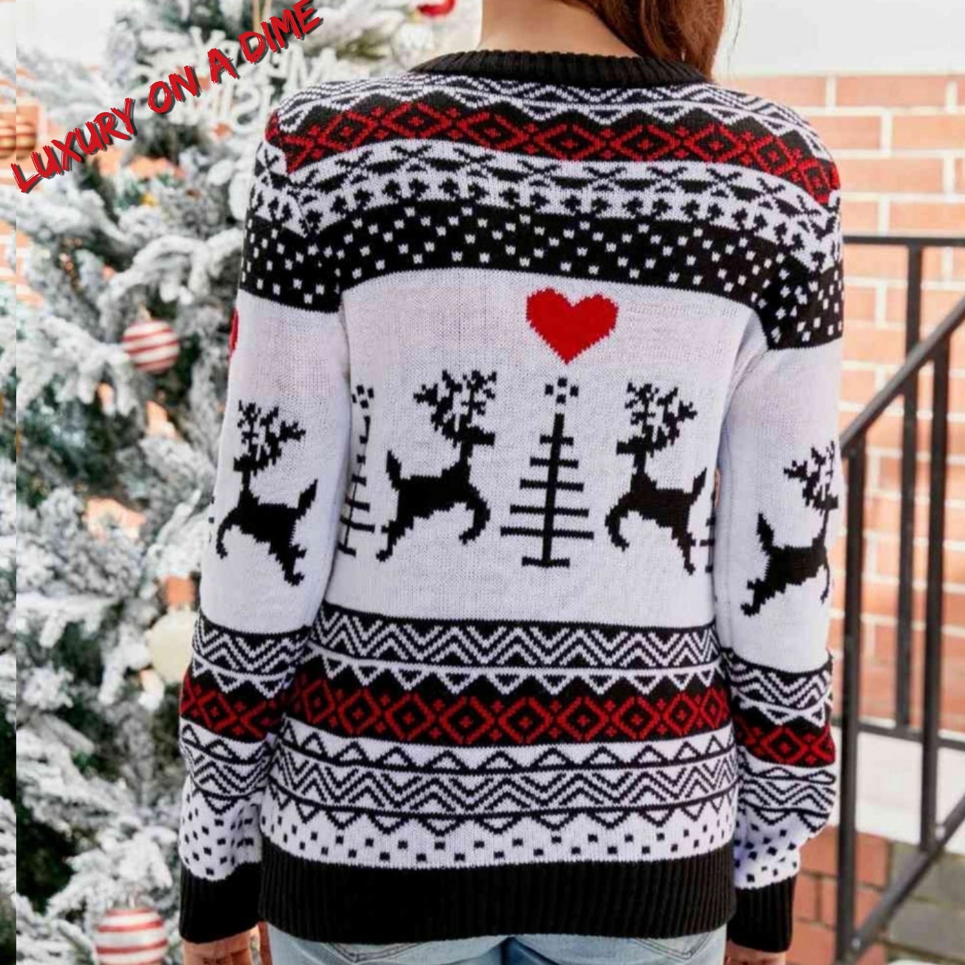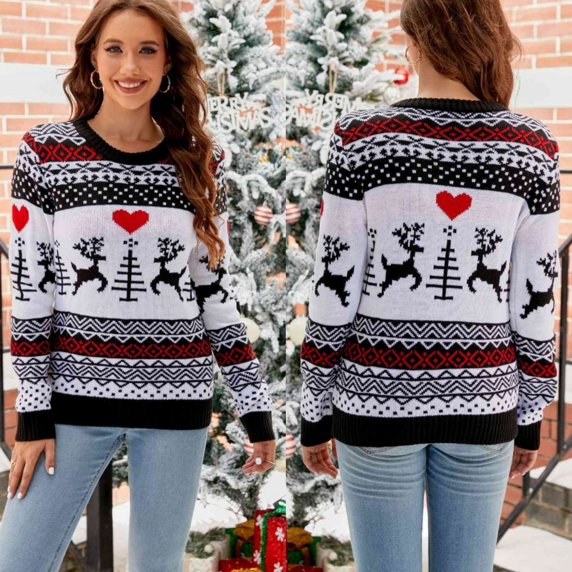 Reindeer Heart Knit Round Neck Winter Holiday Long Sleeve Christmas Sweater