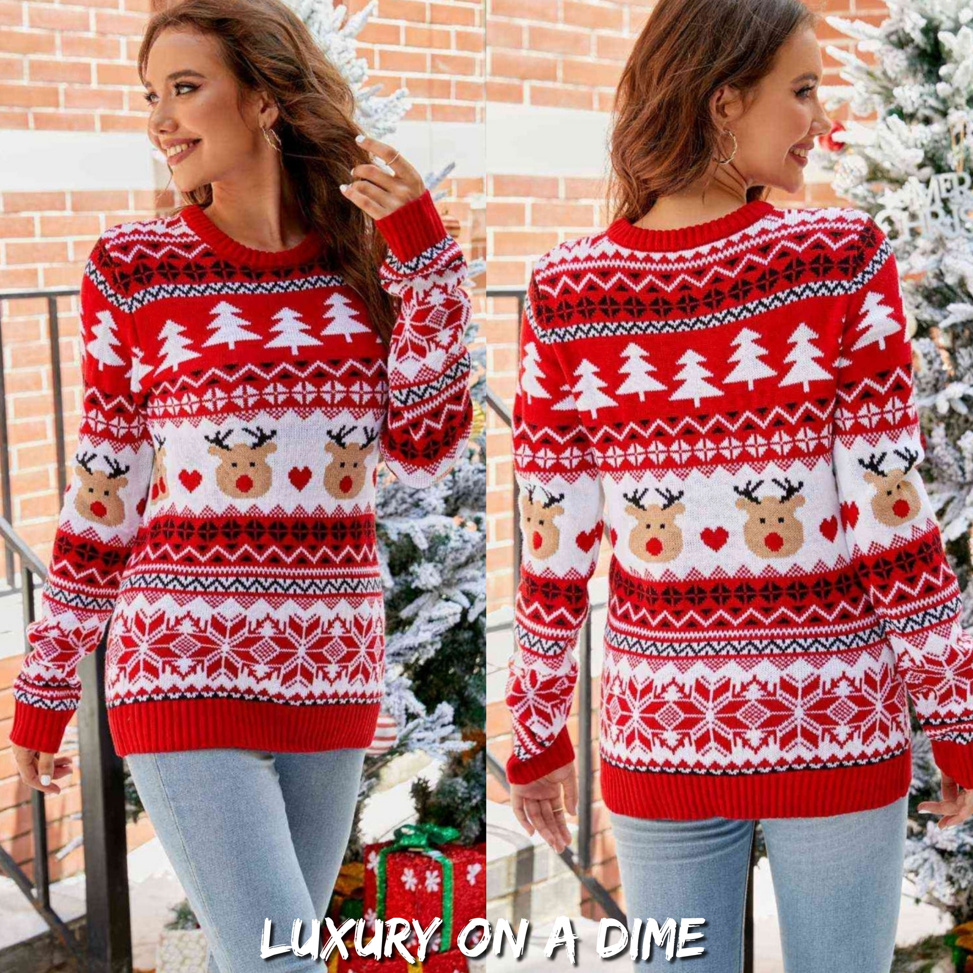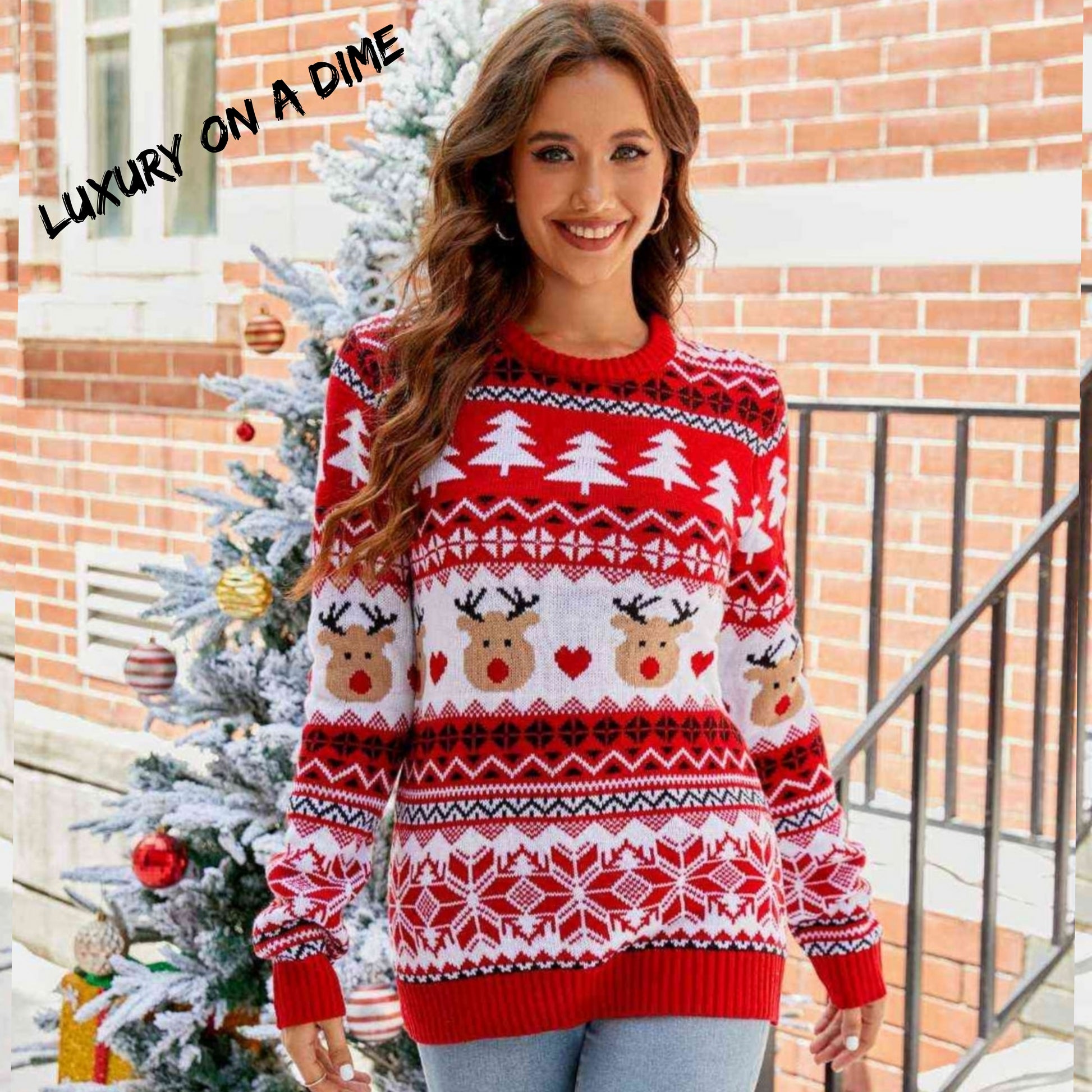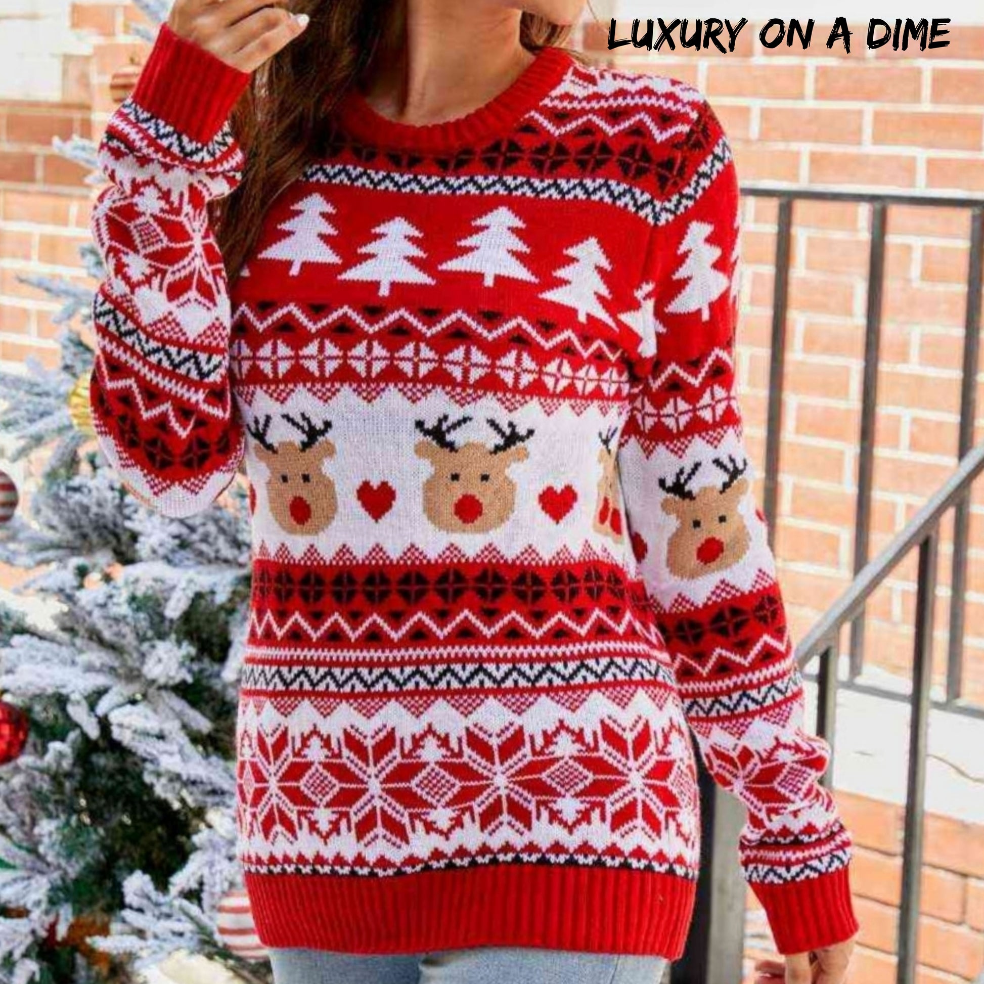 Knit Reindeer Heart Round Neck Winter Holiday Long Sleeve Christmas Sweater