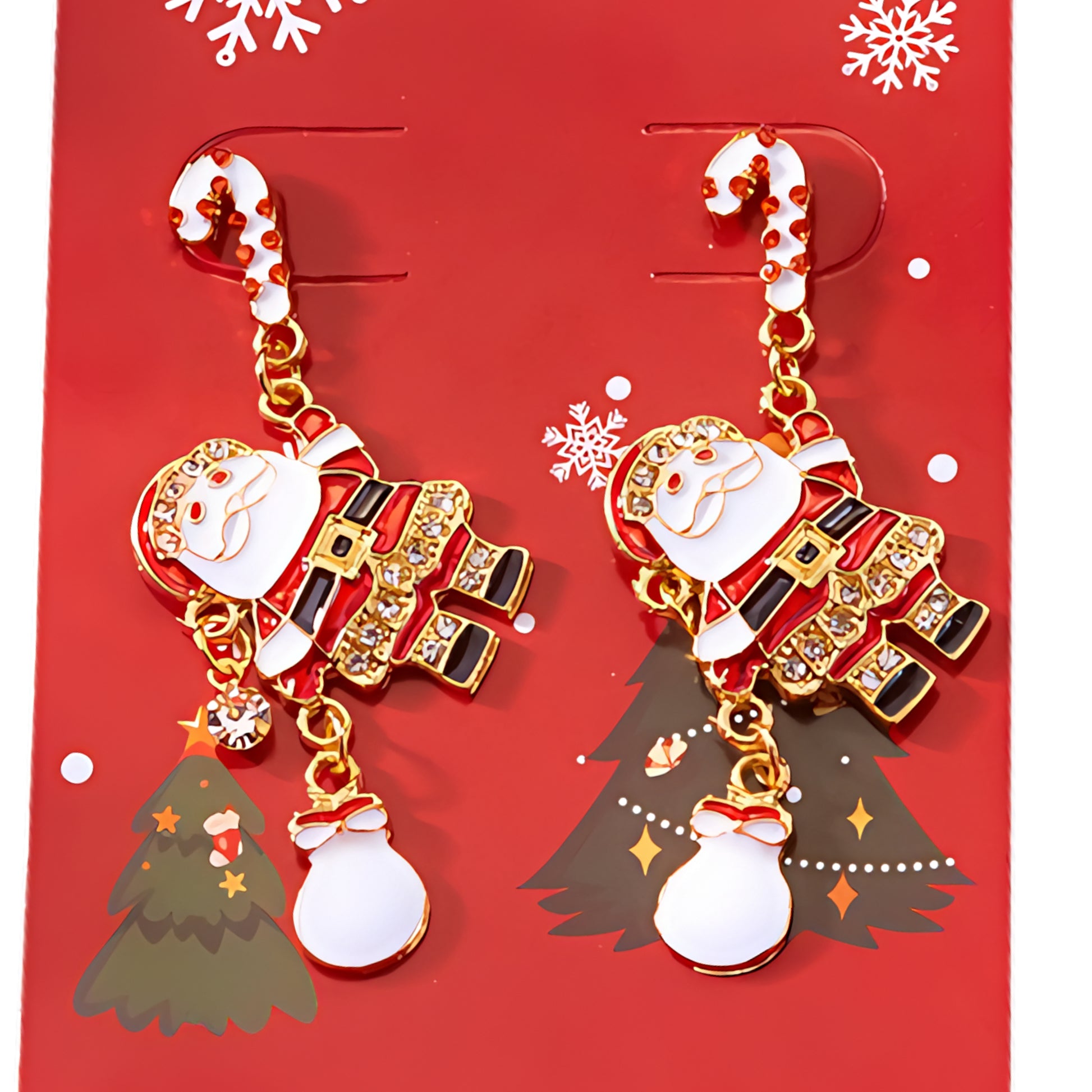Playful and sparkling with holiday spirit, these Santa candy cane post earrings perfectly blend whimsy with elegance. Crafted from 18K gold-plated alloy and adorned with enamel resin and rhinestone accents, they bring a radiant touch of Christmascore and sparklecore aesthetics to your festive wardrobe. Each earring features a charming Santa carrying a gift sack, dangling from a candy cane post for a nostalgic, winter fairycore, merry vibe. The rhinestone detail adds just the right amount of cozy glam shimmer, catching the light like winter frost. Lightweight yet eye-catching, these earrings are ideal for holiday parties, cozy winter dates, or adding a cheerful sparkle to your everyday.
