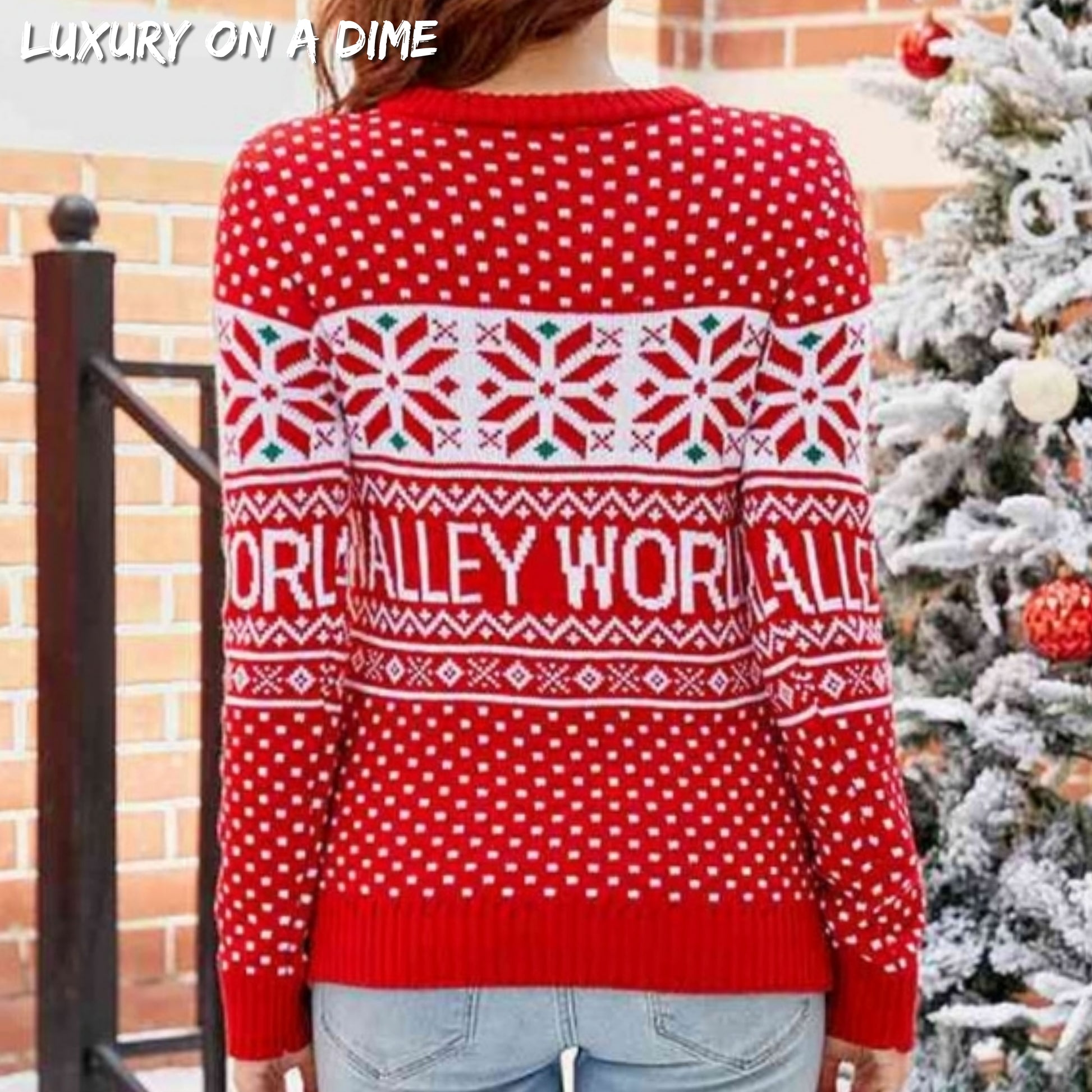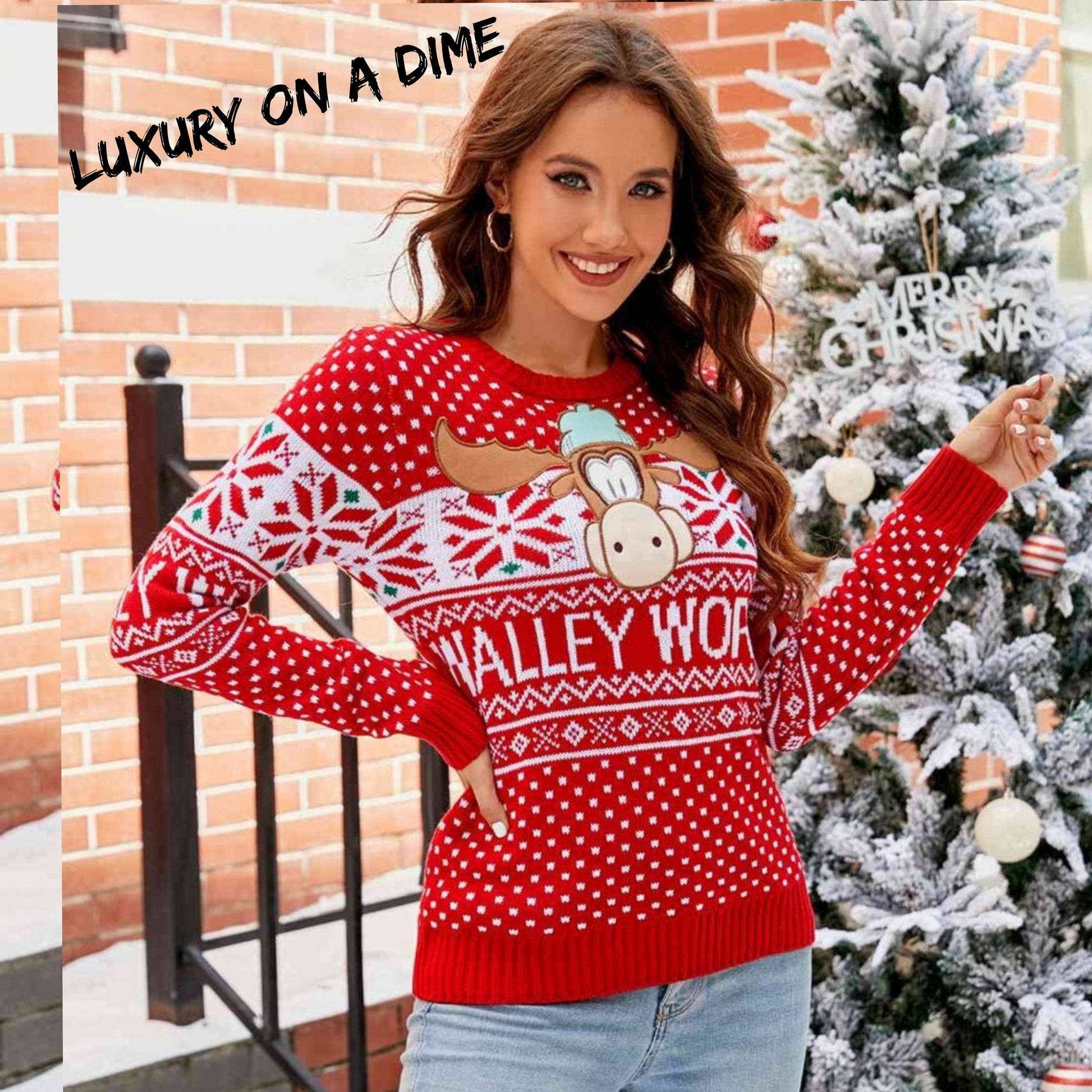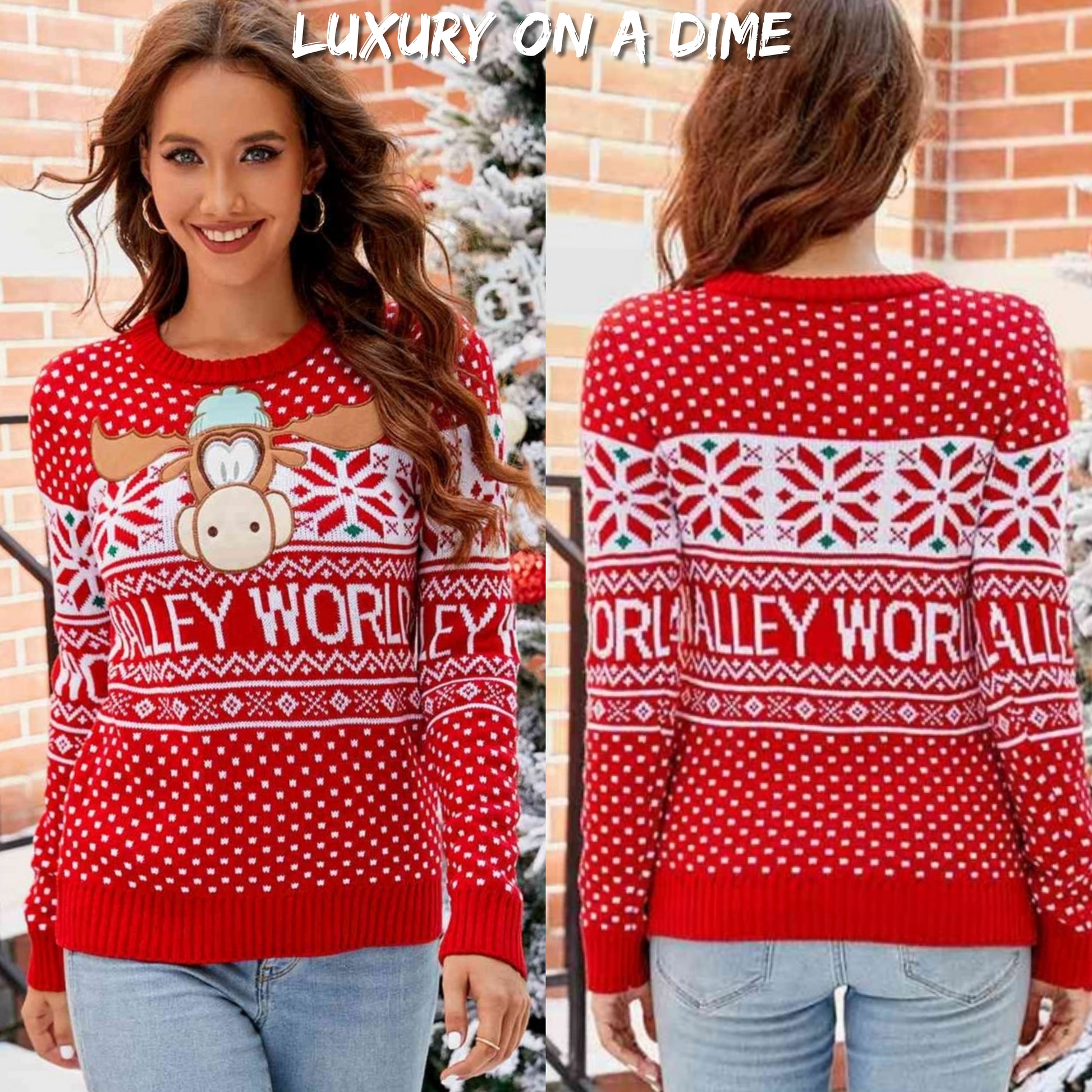 WALLY WORLD Knit Christmas Round Neck Embroidered Moose Pullover Holiday Sweater
