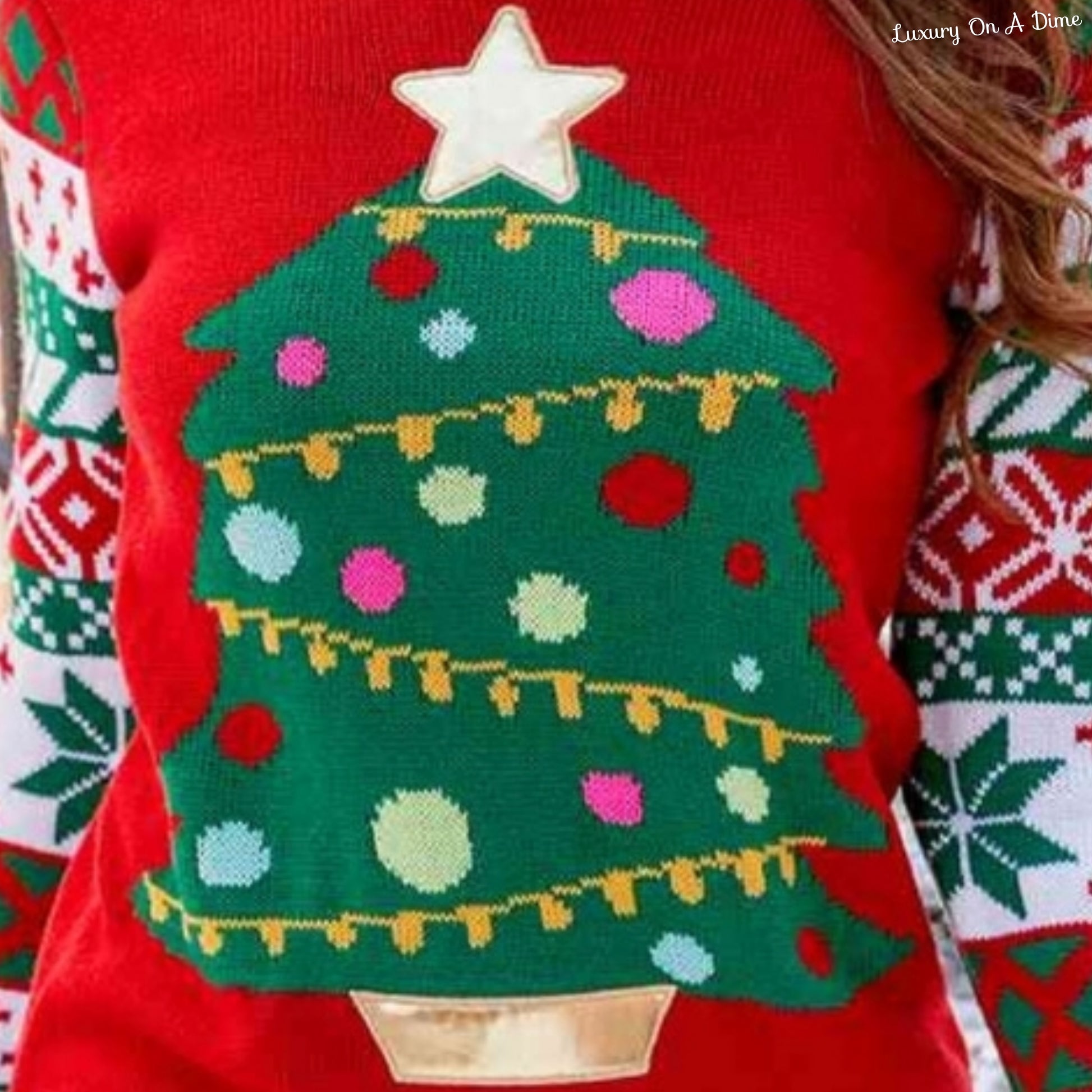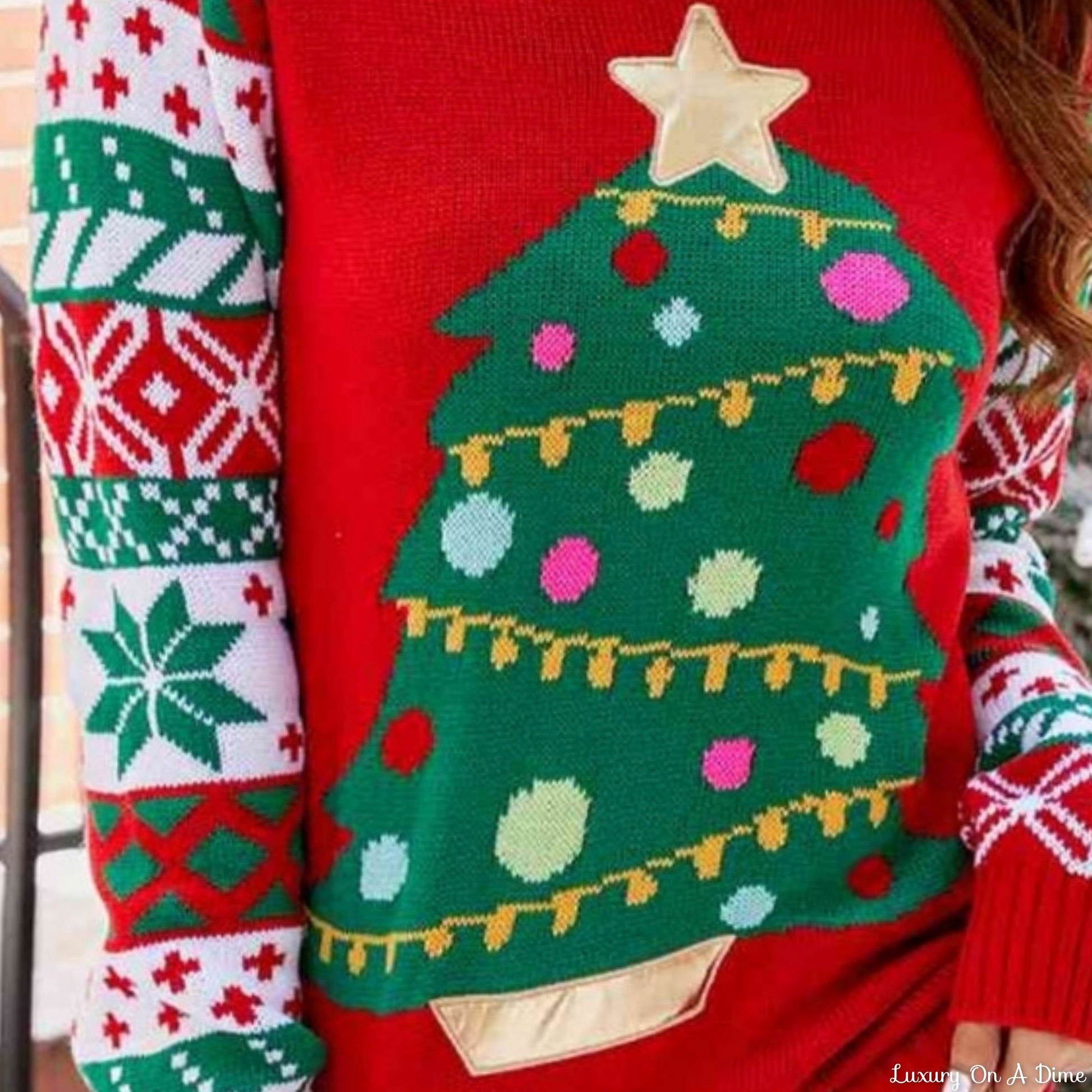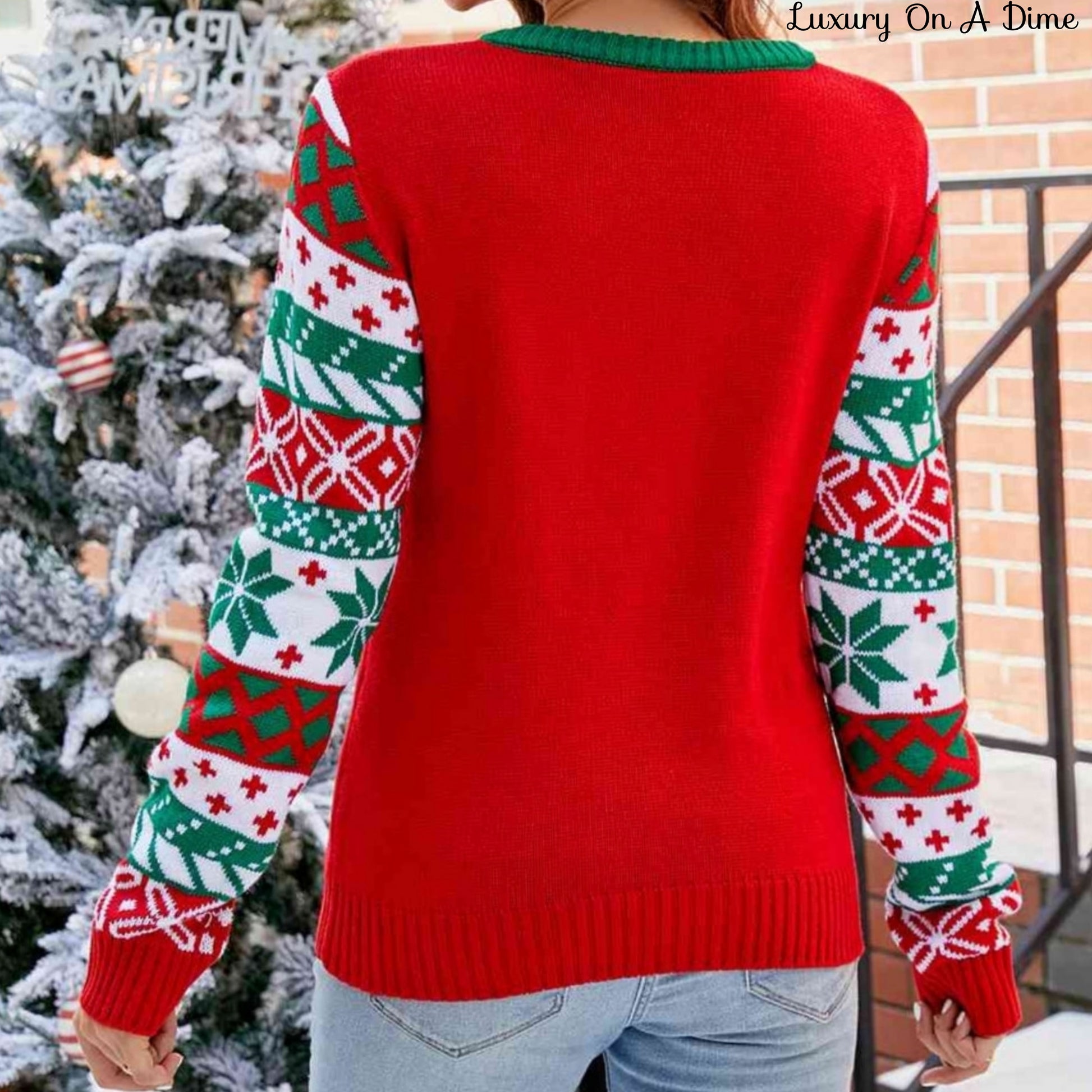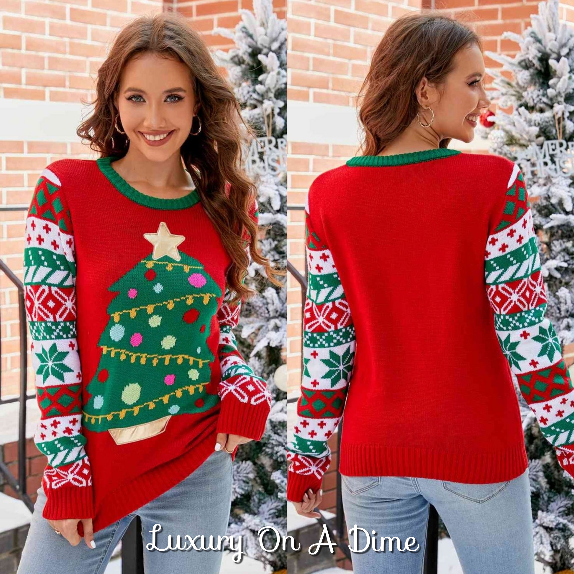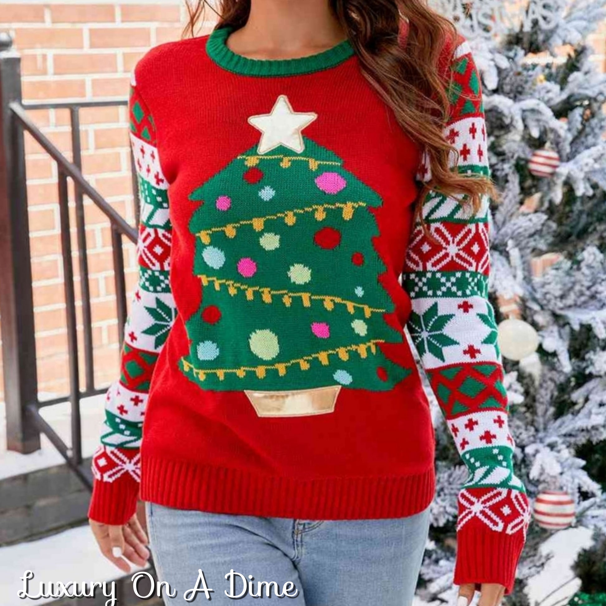 Knit Christmas Tree Graphic Embroidered Detail Round Neck Holiday Sweater