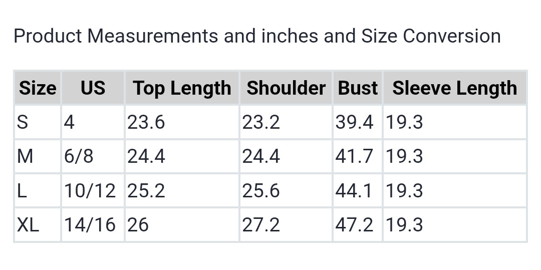| Size | US | Top Length | Shoulder | Bust | Sleeve Length |