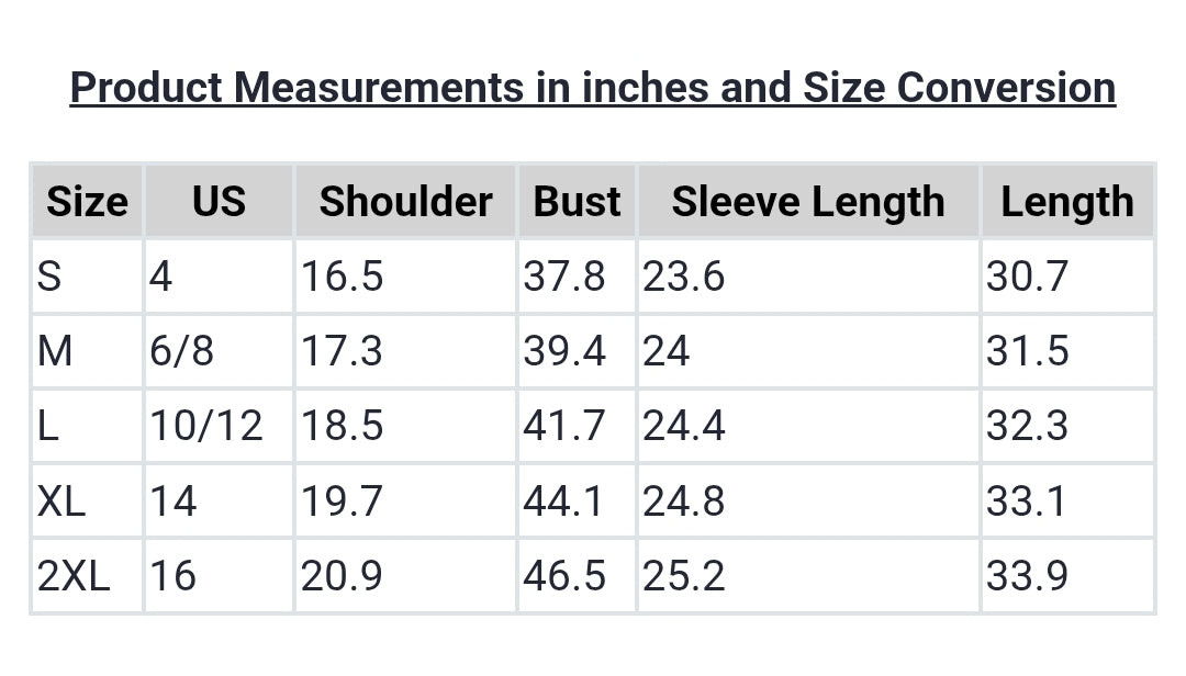 | Size | US | Shoulder | Bust | Sleeve Length | Length |