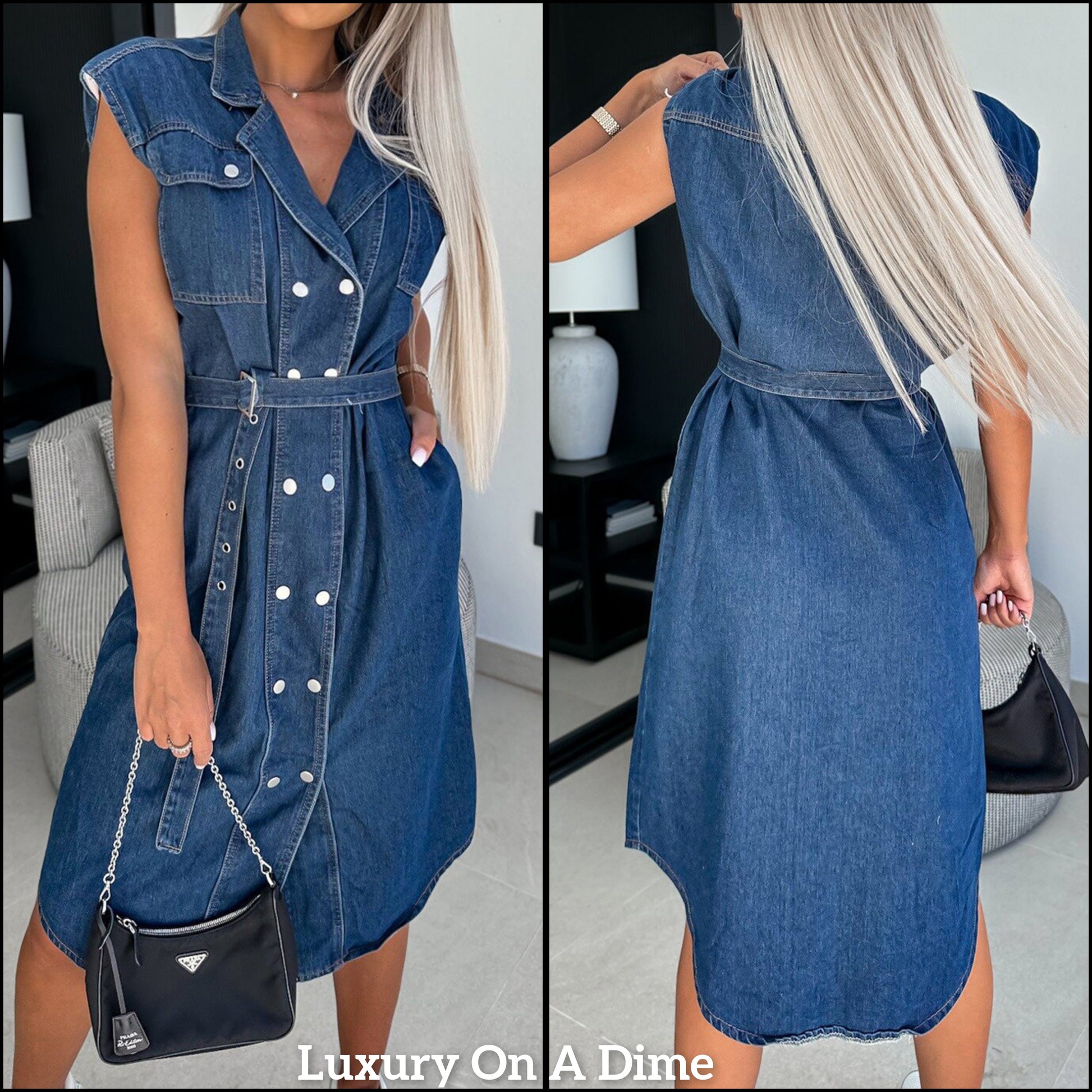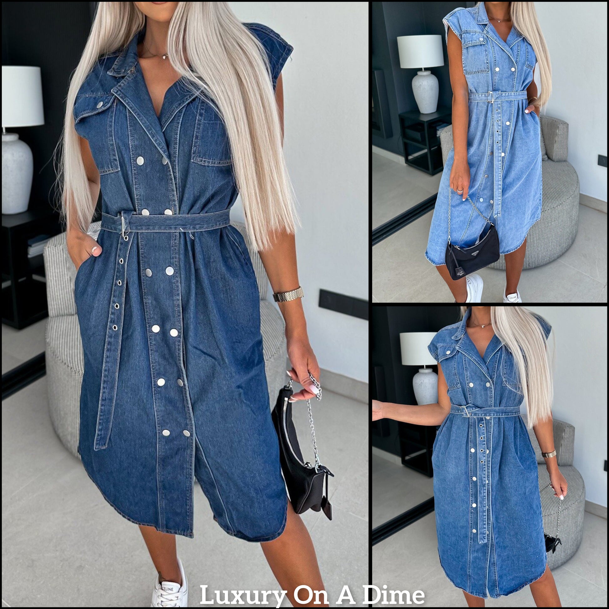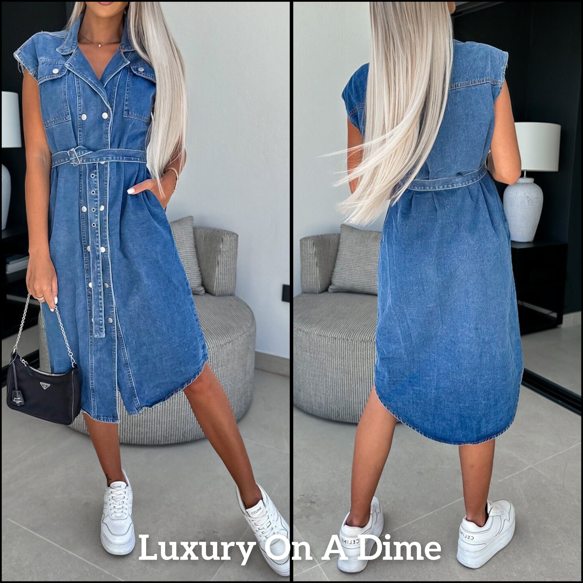 Collared Retro Denim Dress Cap Sleeve Snap Front Oversized Belt Blue Jean Midi