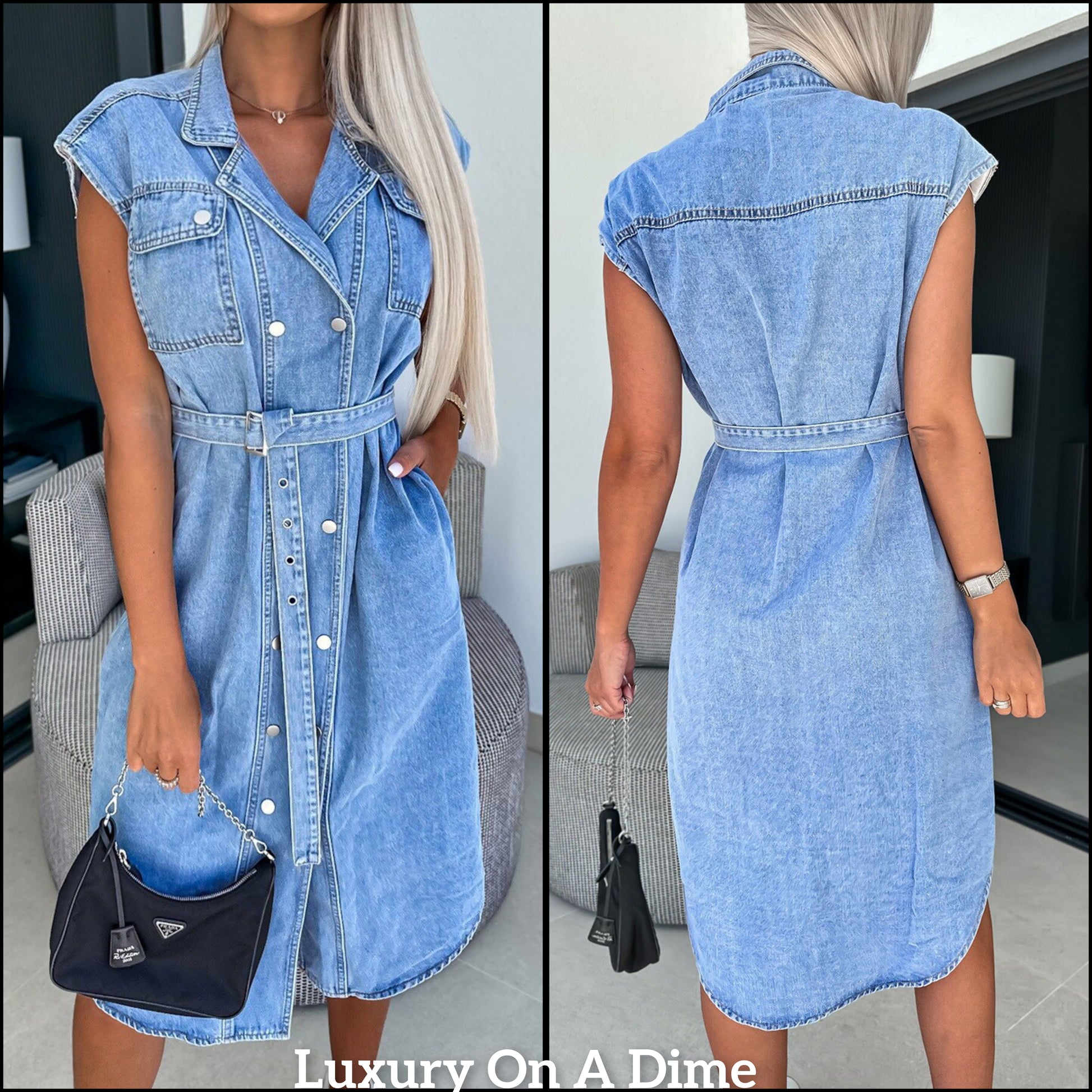 Collared Retro Denim Dress Cap Sleeve Snap Front Oversized Belt Blue Jean T-shirt Midi