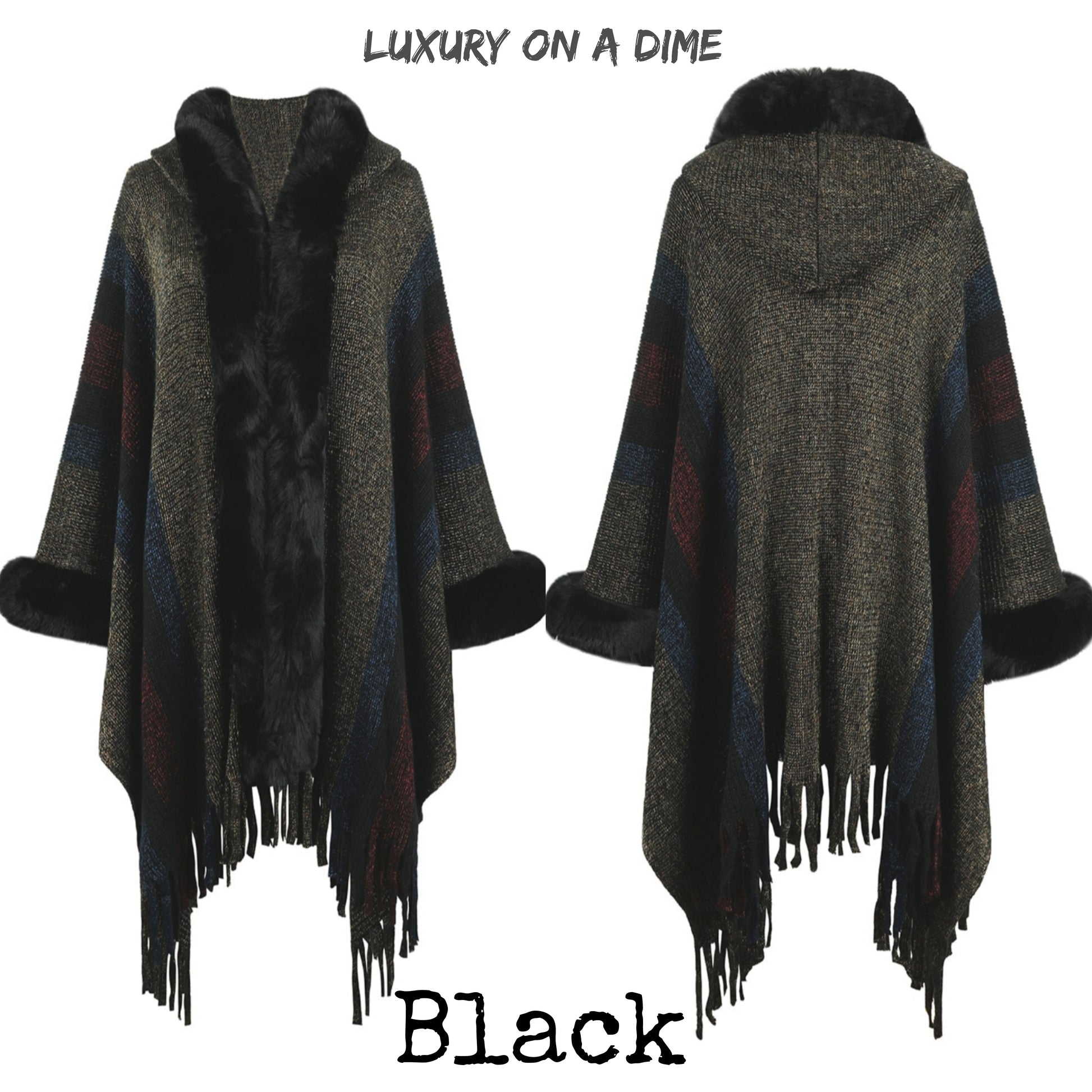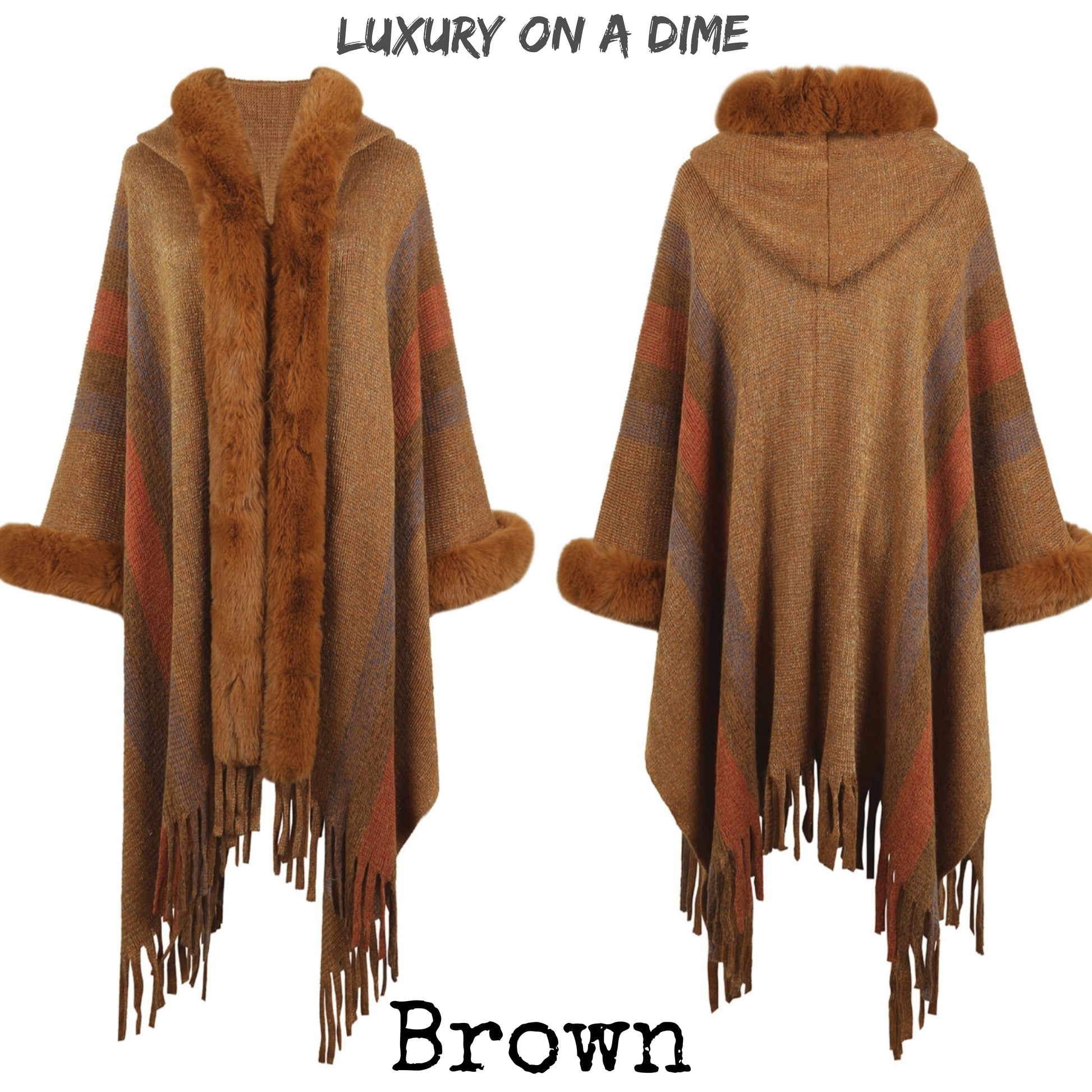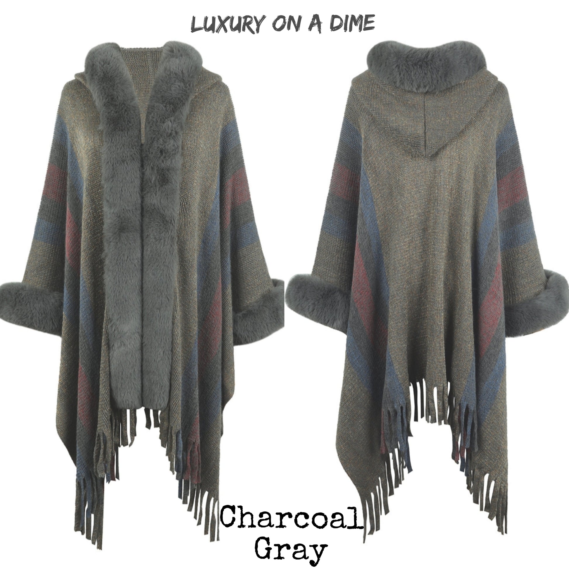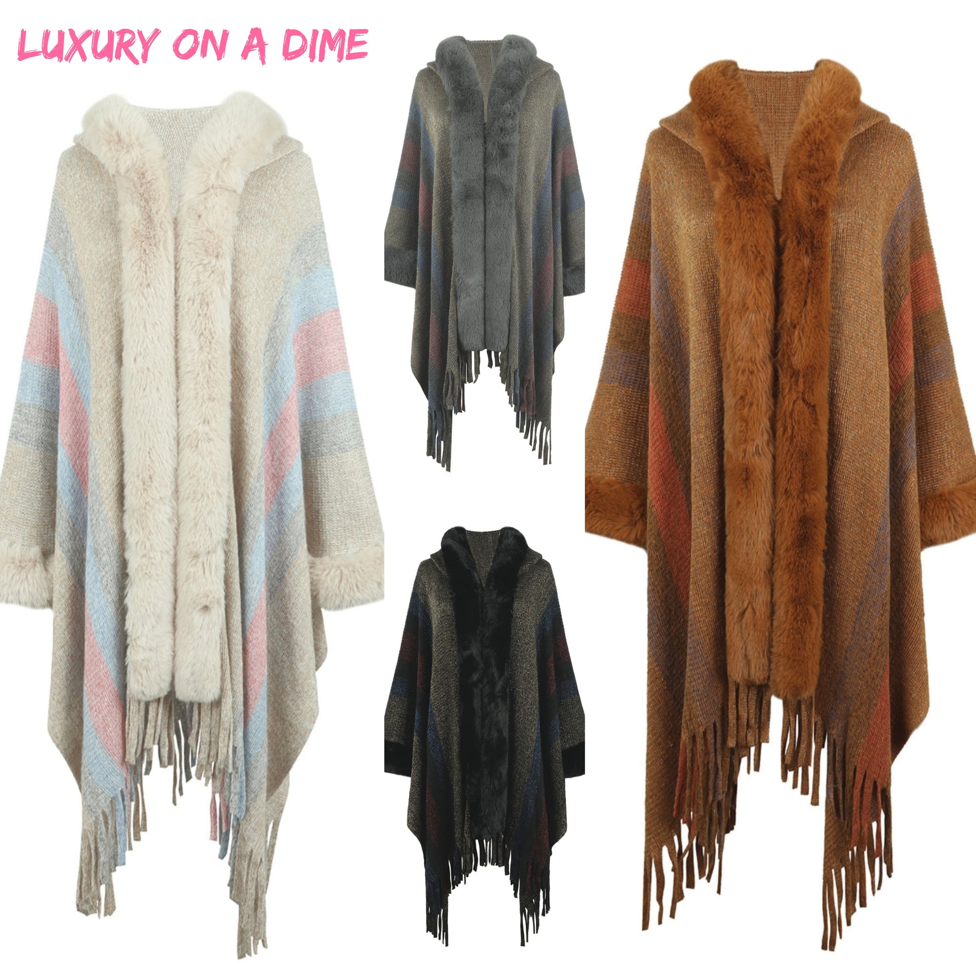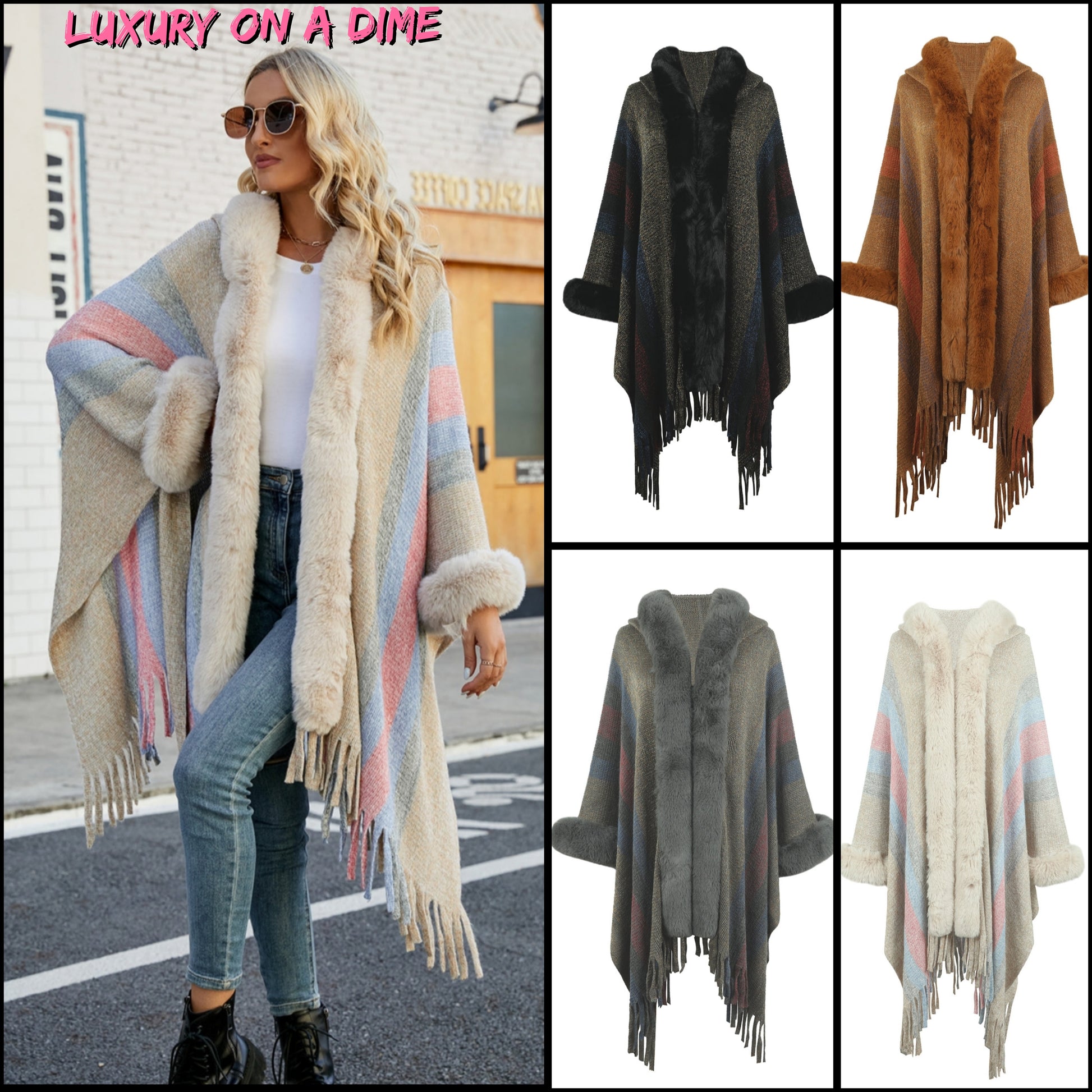 Plush Faux Fur Fringe Hem Oversized Long Knit Hoodie Cardigan Poncho