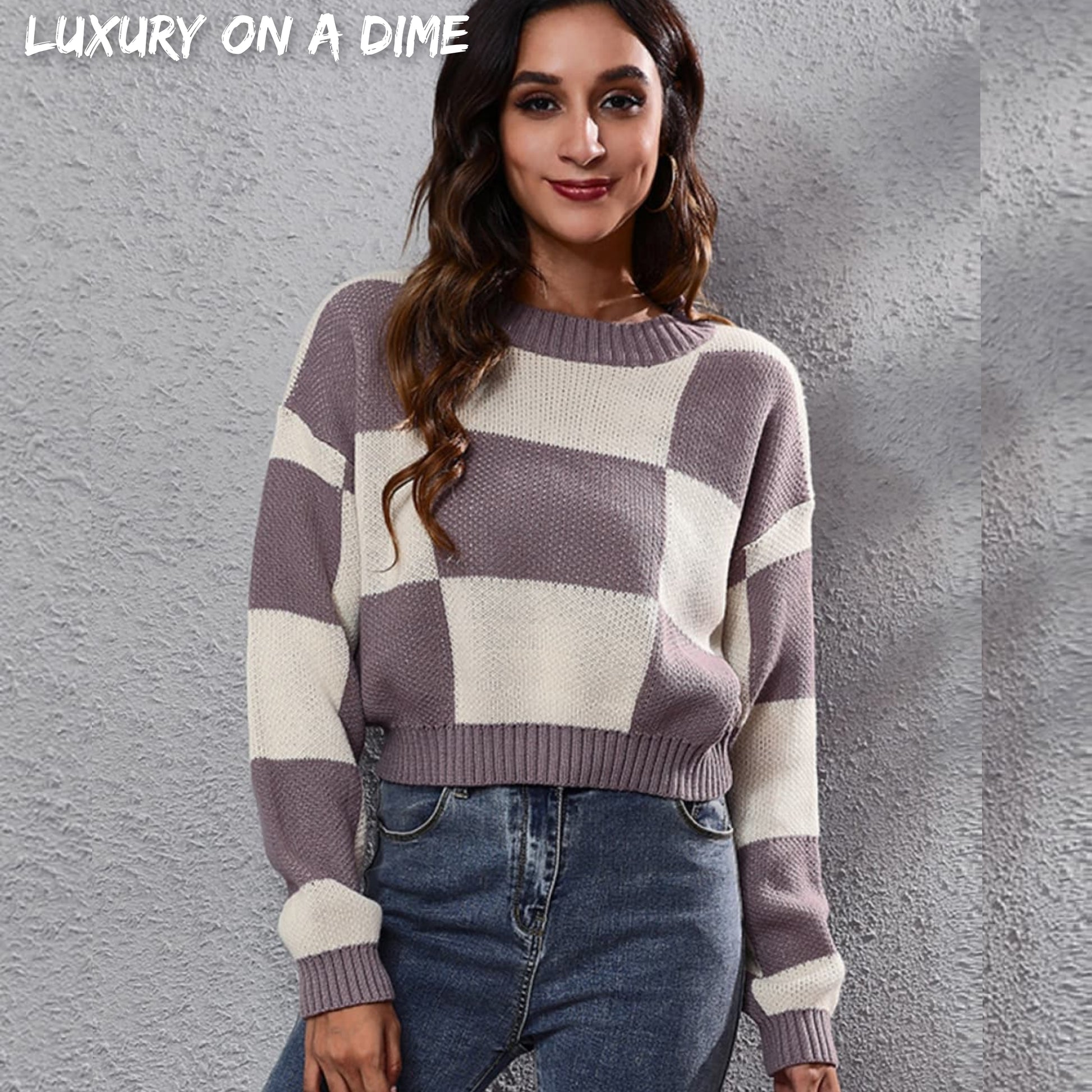 Checker Color Block Knit Crop Top Round Neck Long Sleeve Minimalist Sweater Shirt