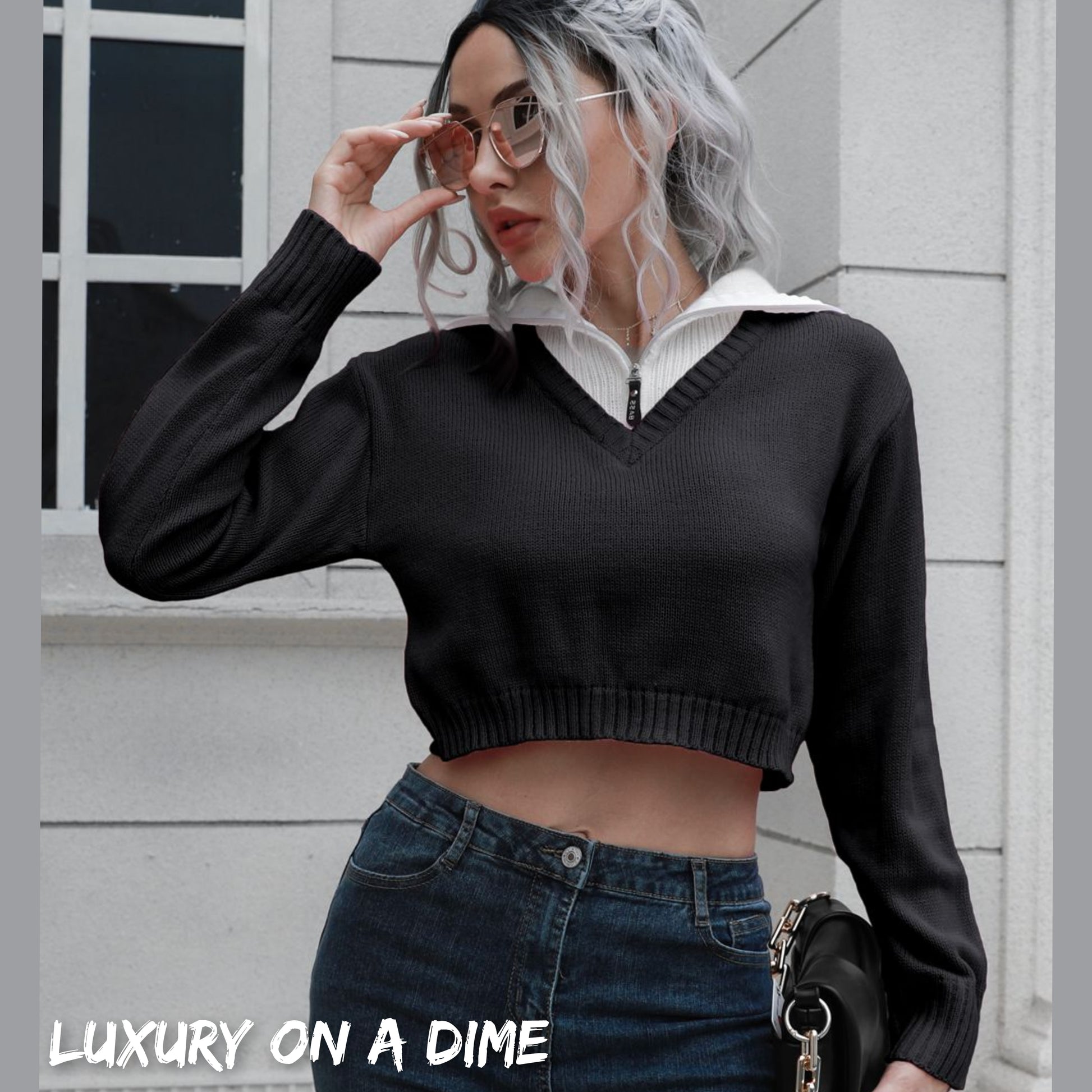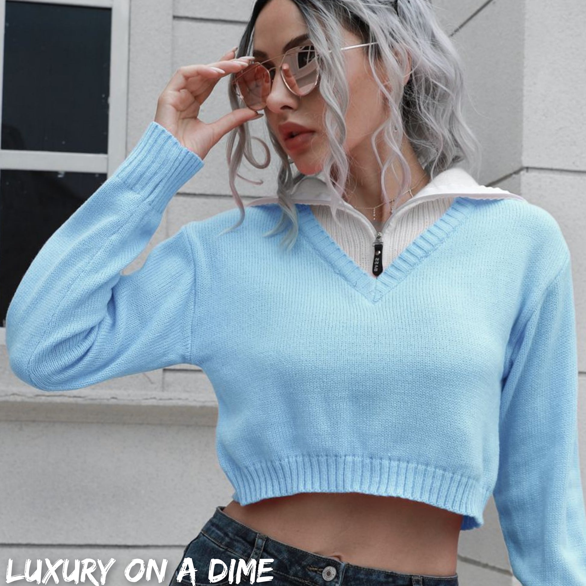 Zipper mock V-neckline with a fold over collar that gives a preppy playful girl-next-door flirty element.