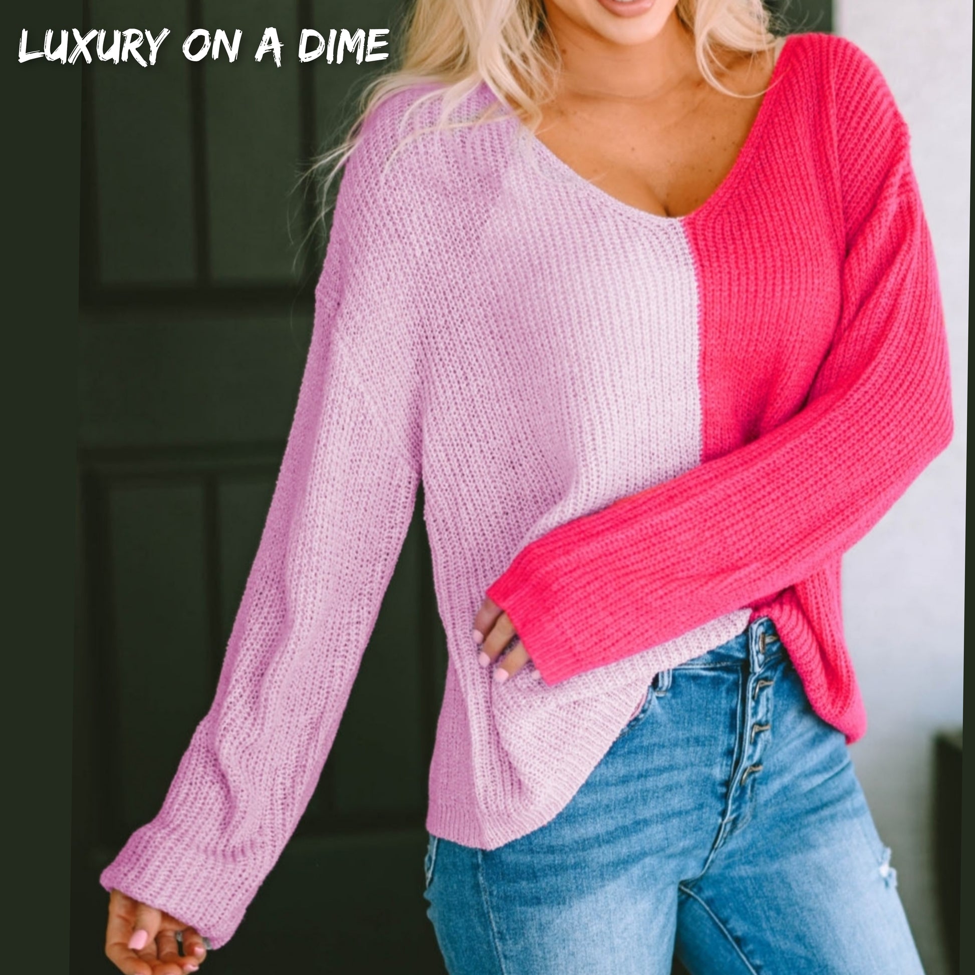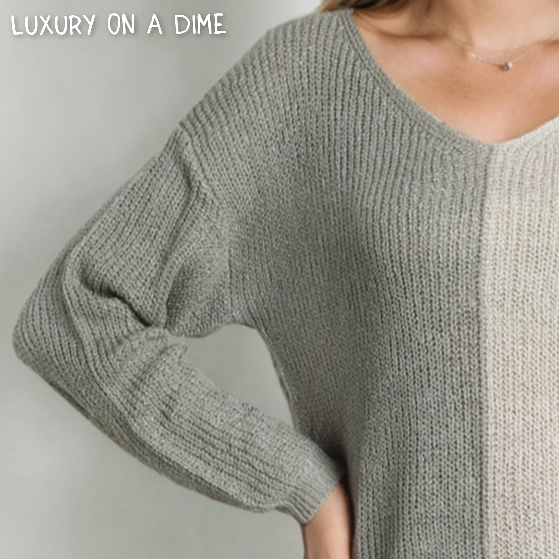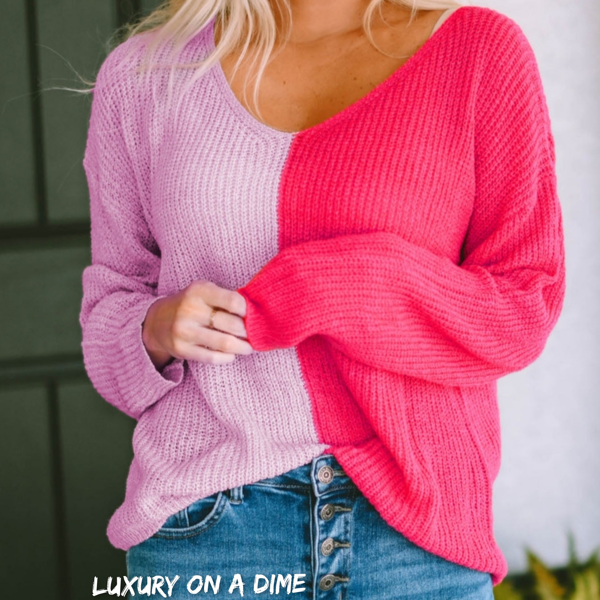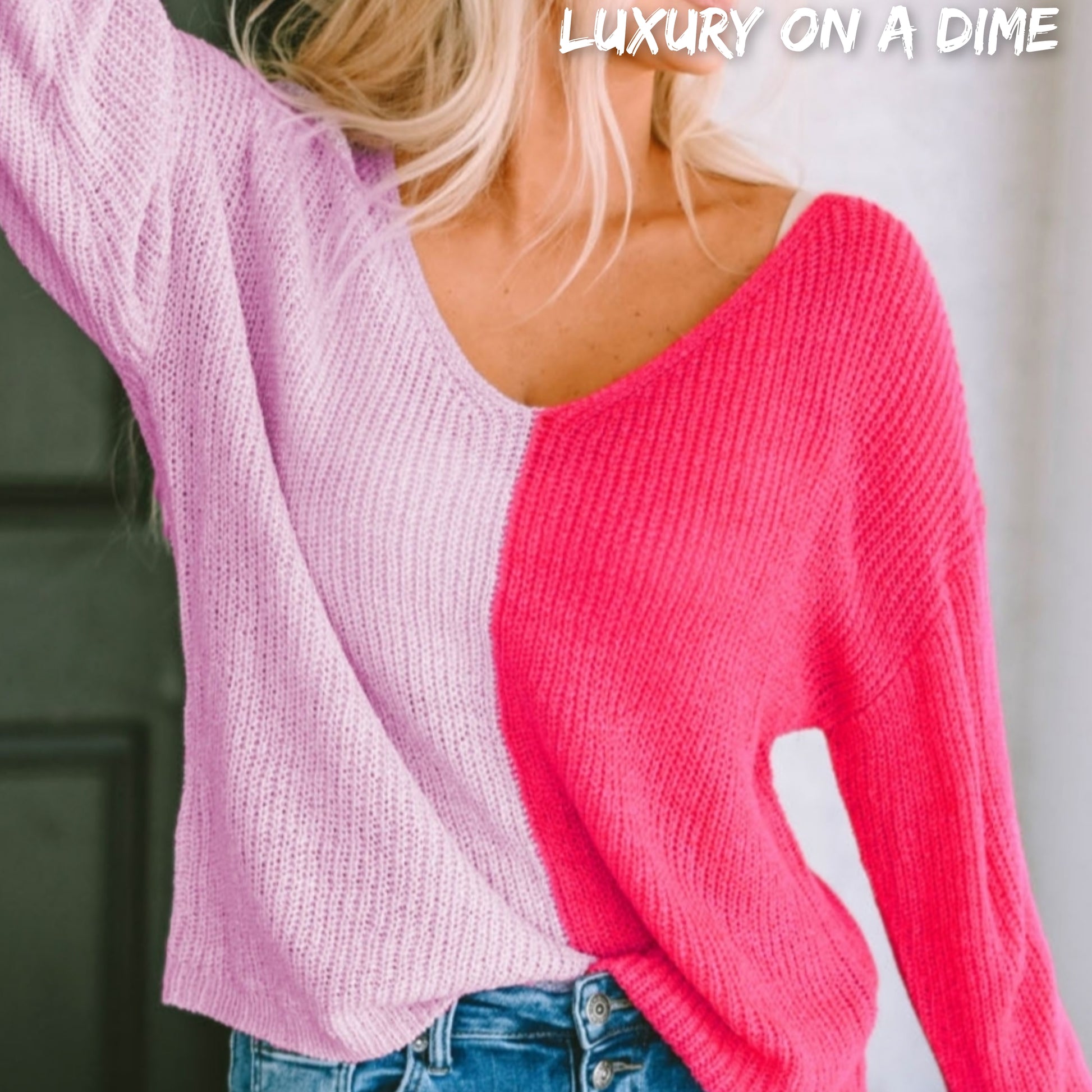 Color Block Contrast V-Neck Lightweight Pullover Knit Sweater