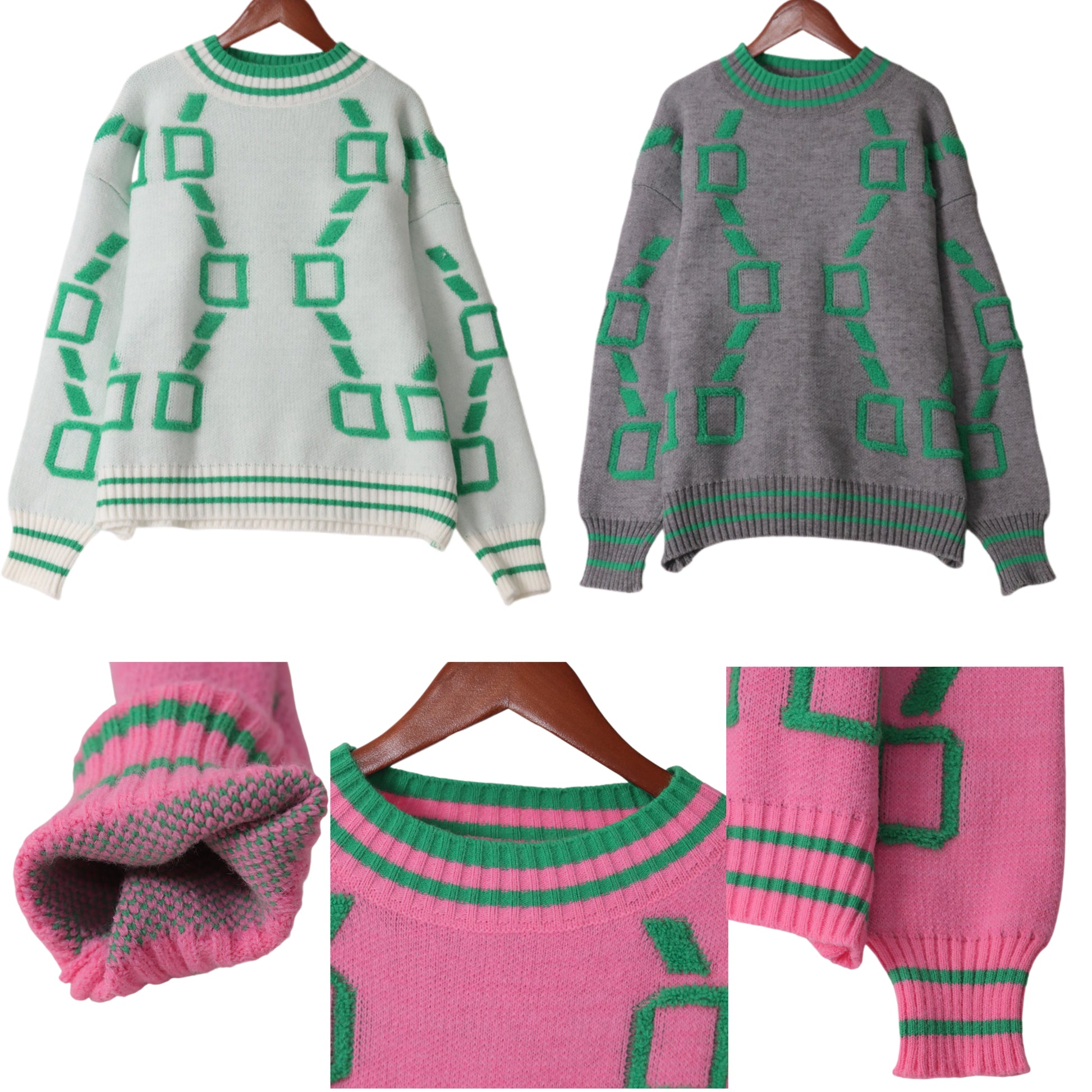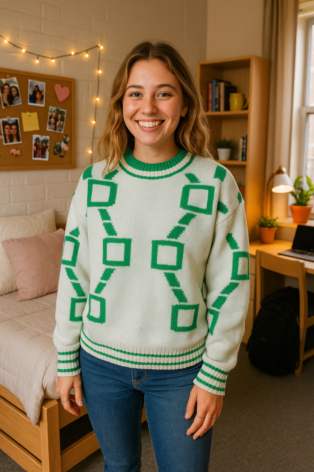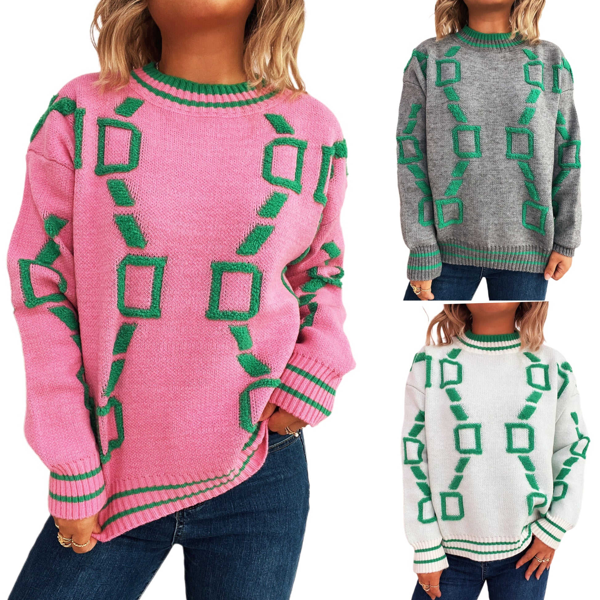 This eye-catching pullover sweater fuses cozy comfort with a bold retro aesthetic, making it a standout piece for any winter wardrobe. The striking geometric chain-link pattern creates a playful yet sophisticated vibe. The contrasting hues and raised textured pattern give it a playful yet structured look. A ribbed crew neckline, cuffs, and hemline enhance structure and give a sporty, collegiate edge, balancing casual ease with a polished finish. The relaxed fit drapes effortlessly over the body, offering both warmth and versatility for layering. Its thick knit construction ensures all-day comfort during chilly months, while the unique patterning channels vintage preppy influences with a modern twist. Whether styled for a laid-back weekend look or for a statement ensemble, this sweater embodies an eclectic mix of collegecore, streetwear, and retro winter chic.