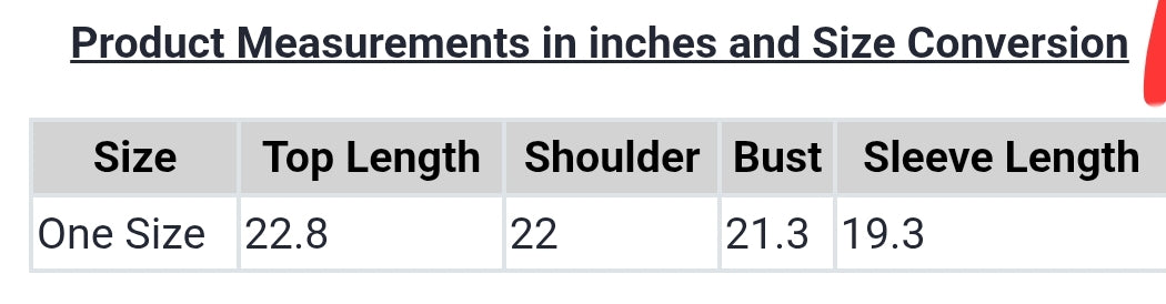 | Size | Top Length | Shoulder | Bust | Sleeve Length |
