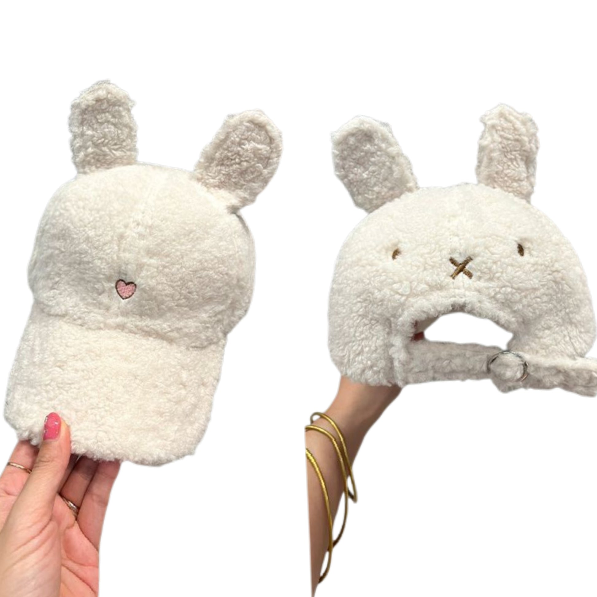 Plush Faux Lambswool Fur Teddy Hat Embroidered Heart Tall Ears Adjustable Cap