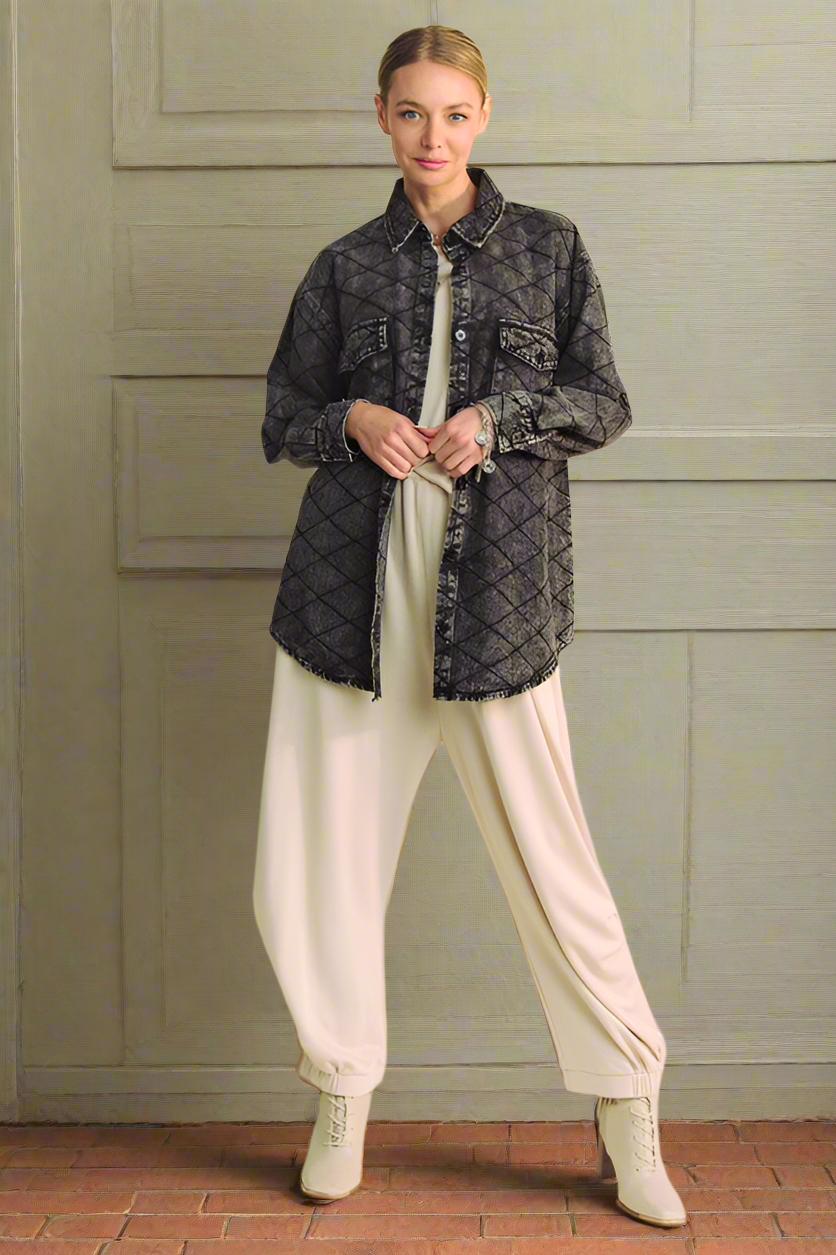 Davi & Dani Denim Shacket Diamond Quilt Stitching High Low Oversized Jean Shirt Jacket