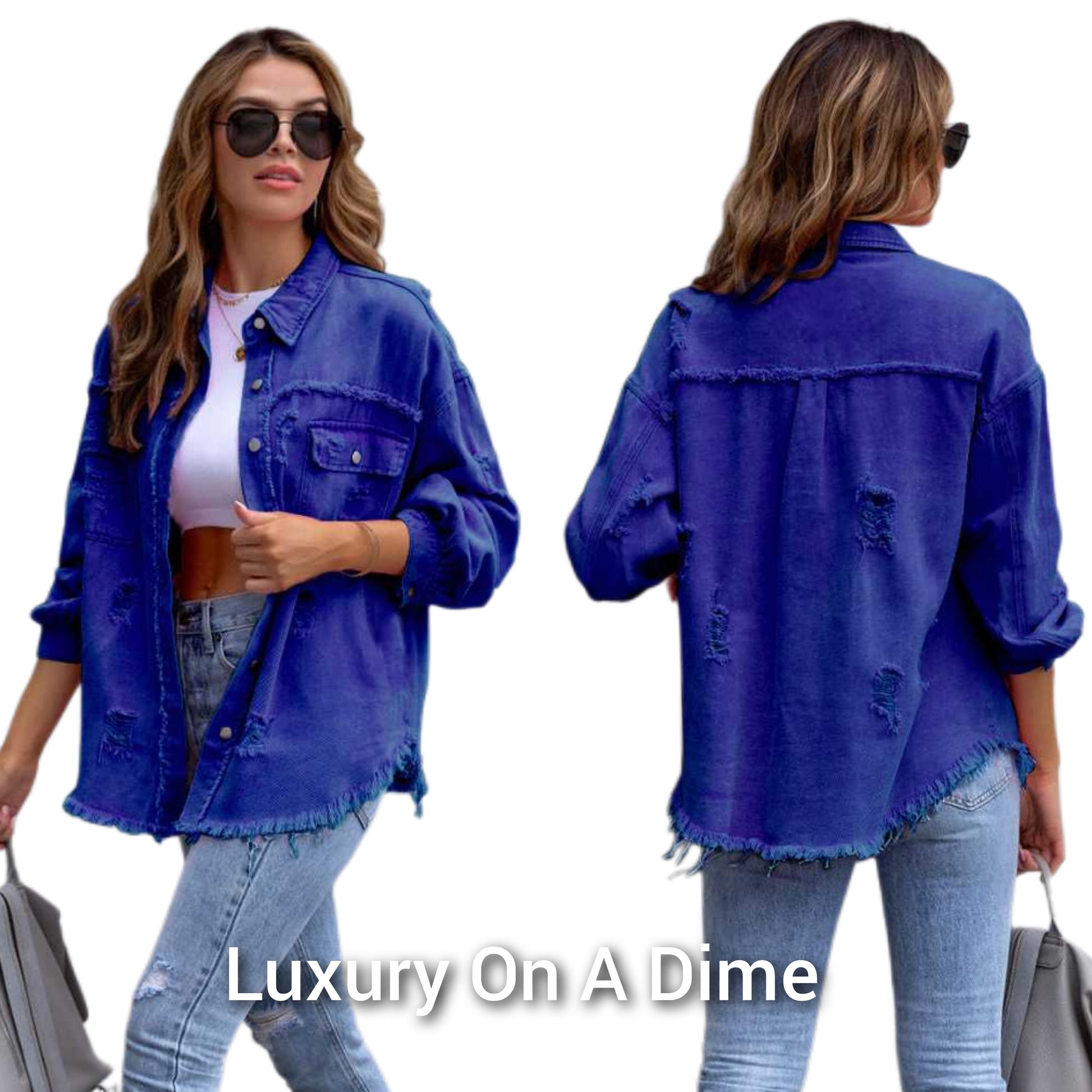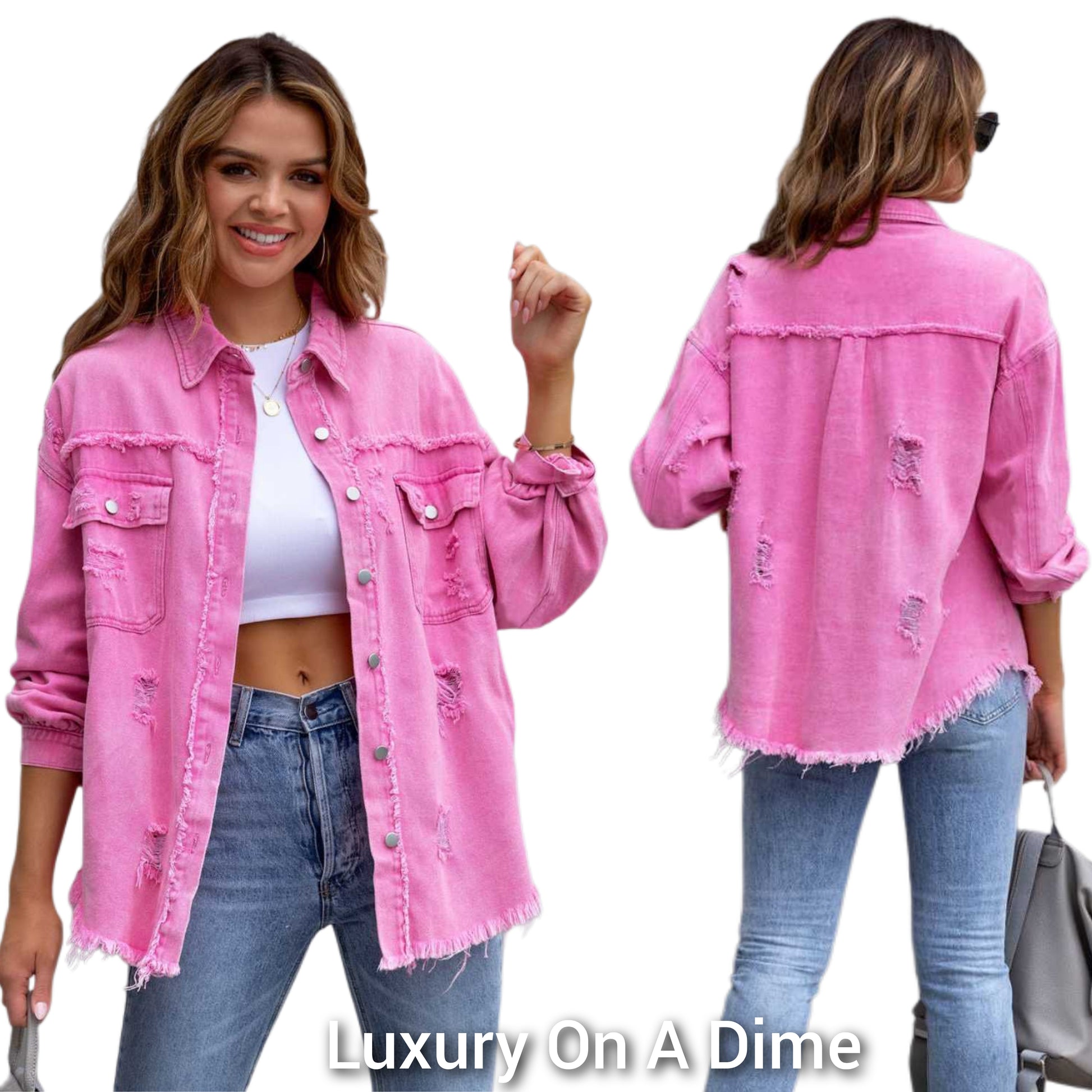 Oversized Distressed Denim Exposed Seam Button-Up Frayed Hem Jean Jacket
